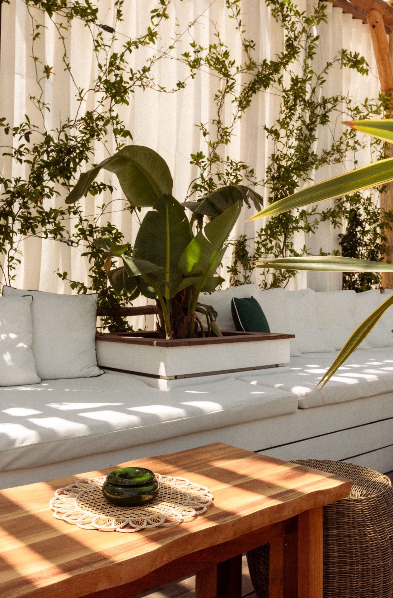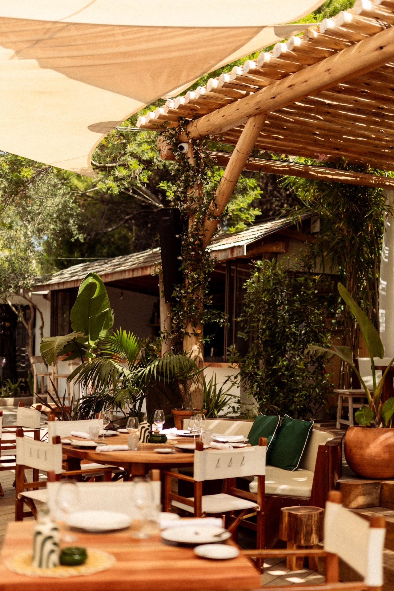 The space seamlessly blends nature's elements with contemporary elegance, creating a serene yet luxurious atmosphere. The outdoor dining area, nestled beneath large trees and pergolas, invites guests to relax in a tranquil, shaded setting. Wooden furnishings adorned with plush white cushions and surrounded by vibrant greenery enhance the natural charm, offering a perfect escape.