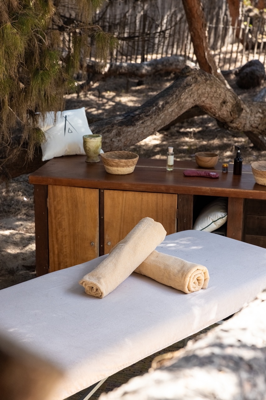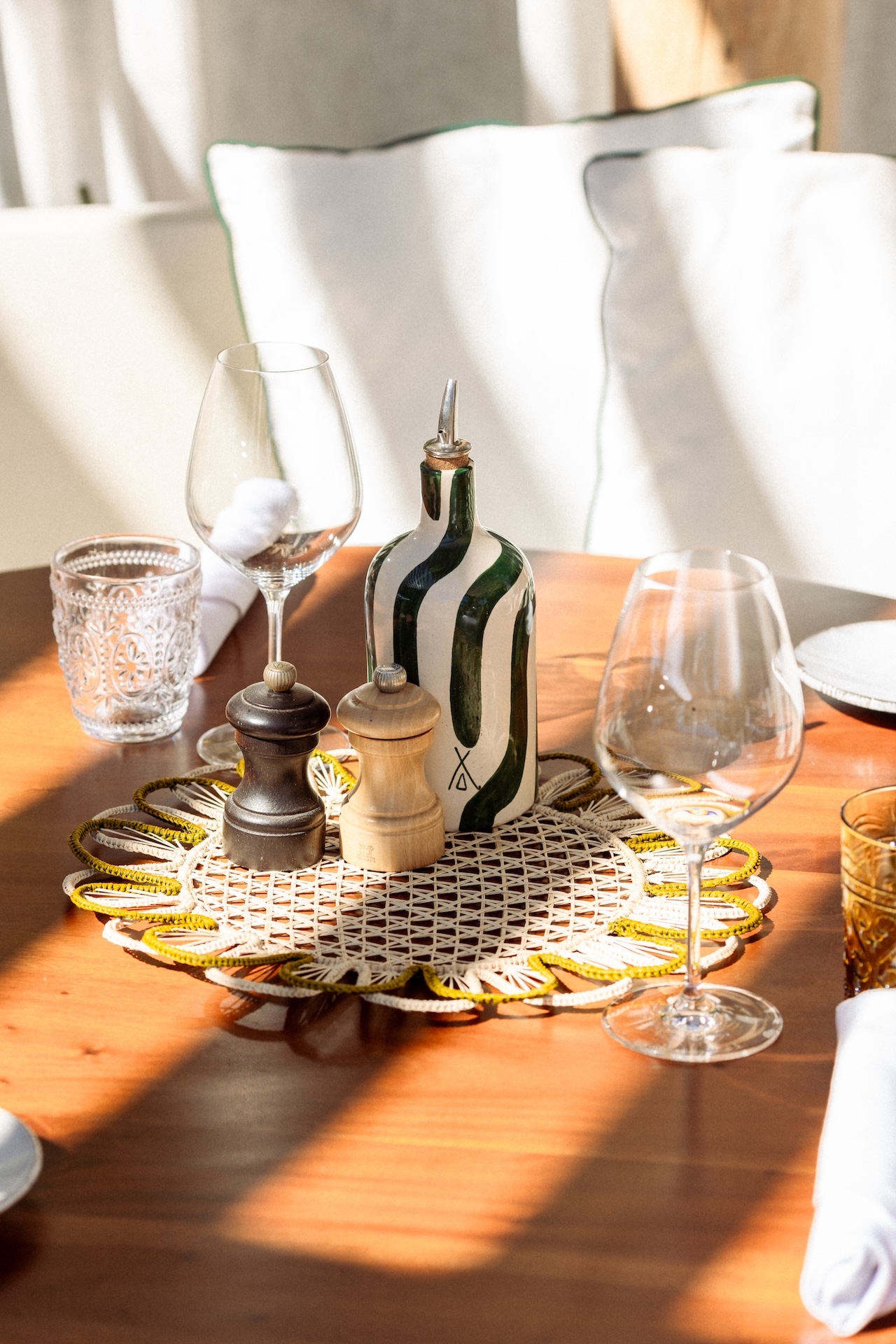 Neutral tones, rich textures, and lush plants unify the design, making the entire space a cohesive extension of the beach club’s laid-back elegance. Special touches of the South of France are sprinkled throughout, like the olive oil canisters from Popolo, a French brand with an Italian soul that offers a taste of la dolce vita.