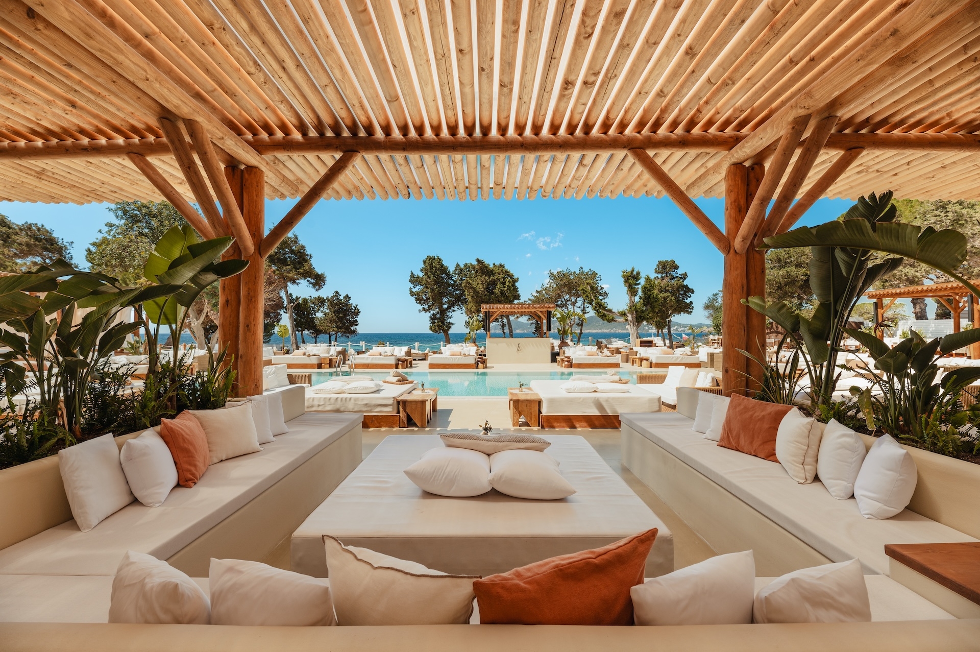 The design blends natural and modern elements to create a luxurious, inviting atmosphere. The outdoor dining area features wooden furniture and a pergola, offering shaded comfort with views of the beach and lush greenery. Light-colored materials and rustic wooden structures contribute to the beachside aesthetic, while seating areas with white-cushioned lounge spaces and natural wooden tables enhance the relaxed, sophisticated vibe. Personalized hand-painted Ibizencan tiles provide a striking and special touch to the restaurant, alongside traditional "hierbas de Ibiza" centerpieces for a true island experience. Three walls are adorned with hand-made paintings by renowned Spanish artist Curro Leyton, adding an artistic touch. Locally sourced terracotta pots further emphasize the artisanal feel, while curtains crafted from off-white Ibizencan linen contribute to the light, airy atmosphere. Elegant signage with sophisticated typography on wooden backdrops reinforces the brand’s identity, creating a seamless blend of nature and luxury—a perfect setting for relaxation and socializing.