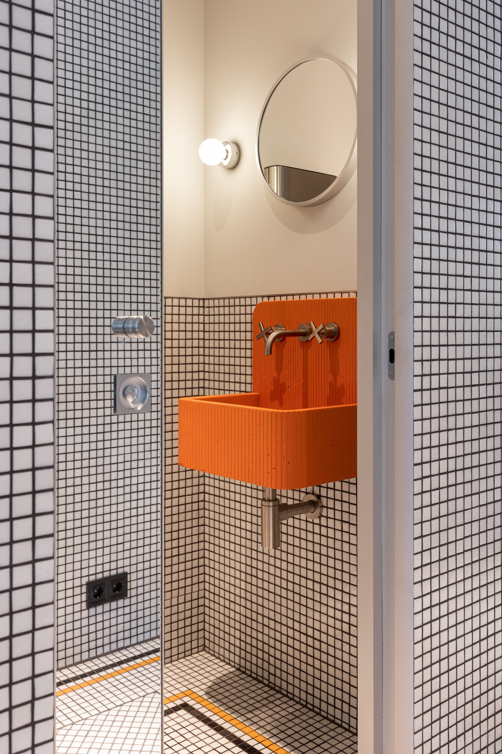 The materials palette of Lumo includes mosaic tiles, metal, wood, and leather. The achromatic palette of the interior is broken by shades of wood, an orange strip on the floor that zones the space, and a bright red sink in the bathroom.