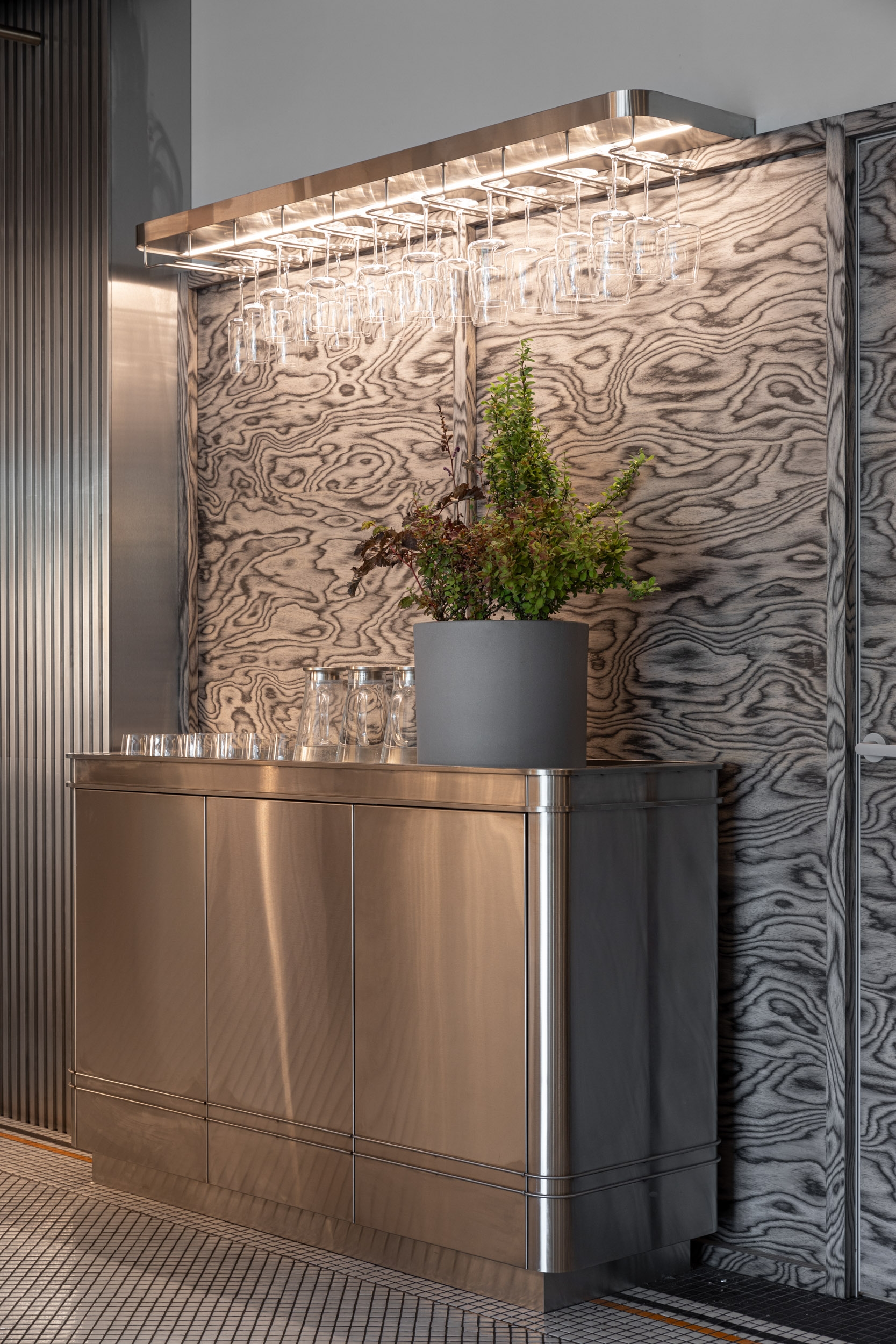 The project was inspired by modern Italy, or rather, a mix of its various cultural facets. Mosaic tiles, check patterns, and textured veneers refer to the Memphis group that revolutionized Italian design in the 80s of the last century. The project uses Alpi veneer, whose original design was created by the founder of Memphis Ettore Sottsass.