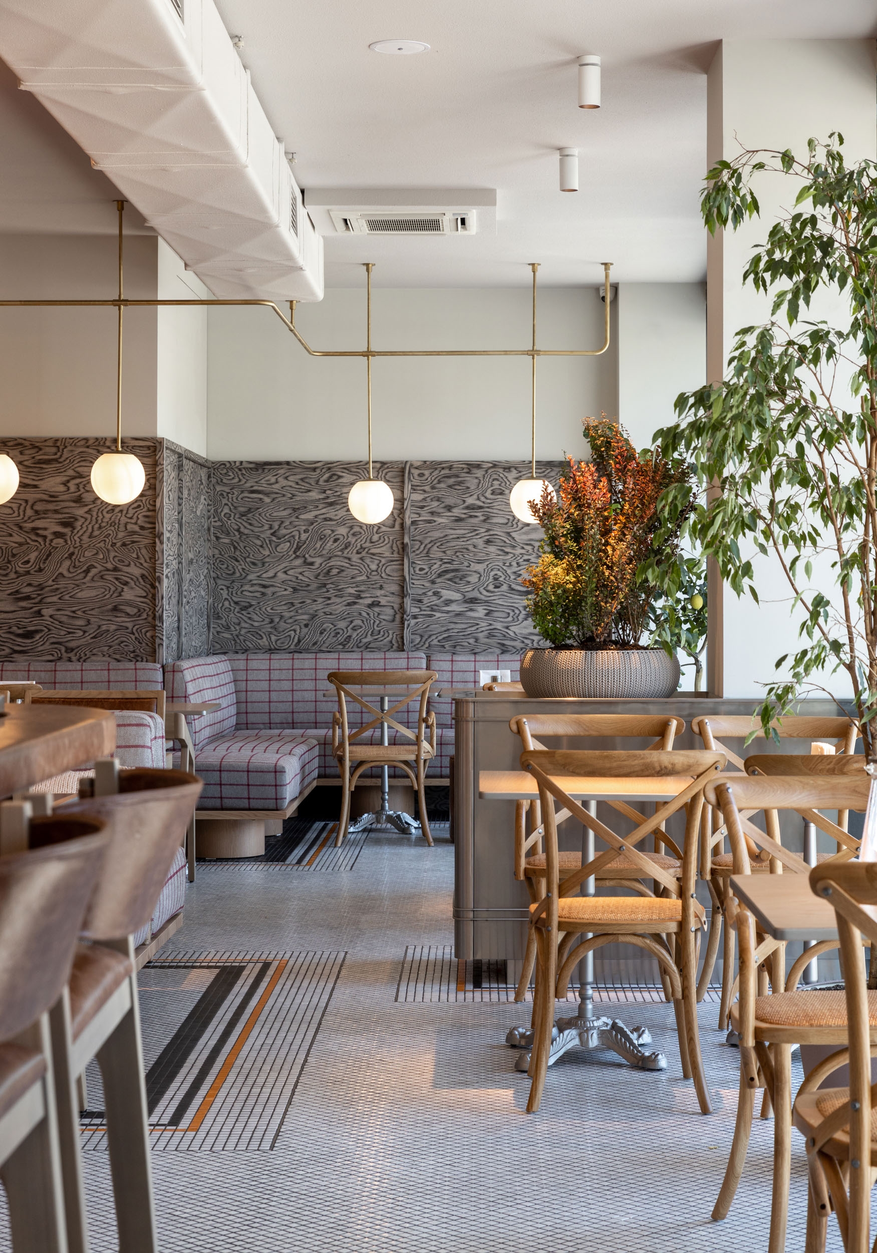 Rounded shapes emphasize the hospitable mood of the place. Such as the shades of pendant lamps, the line of the bar counter, and a massive arch portal separating the main hall from the wardrobe and bathrooms.