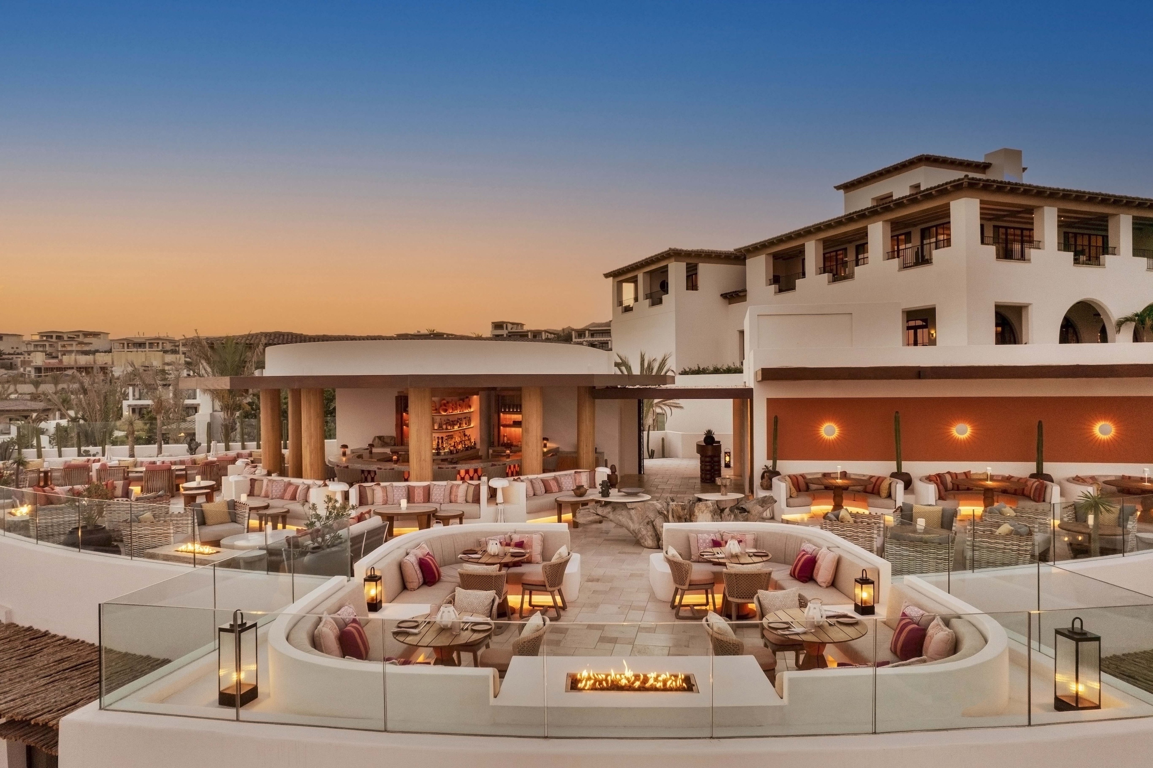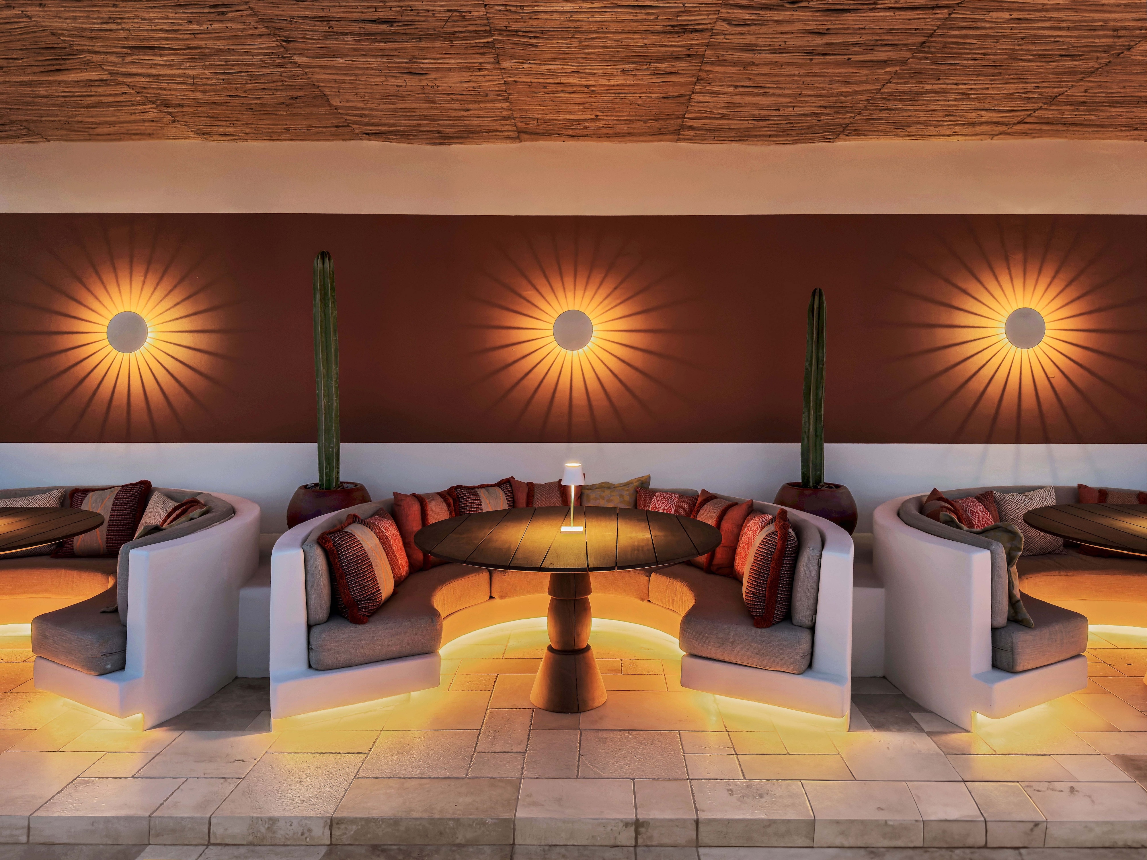 The entirely outdoor space that embraces its cliffside setting. Built-in plaster bancos seem to be carved from the stone cliffs. The firepit lounge cantilevers out into the expanse of ocean.