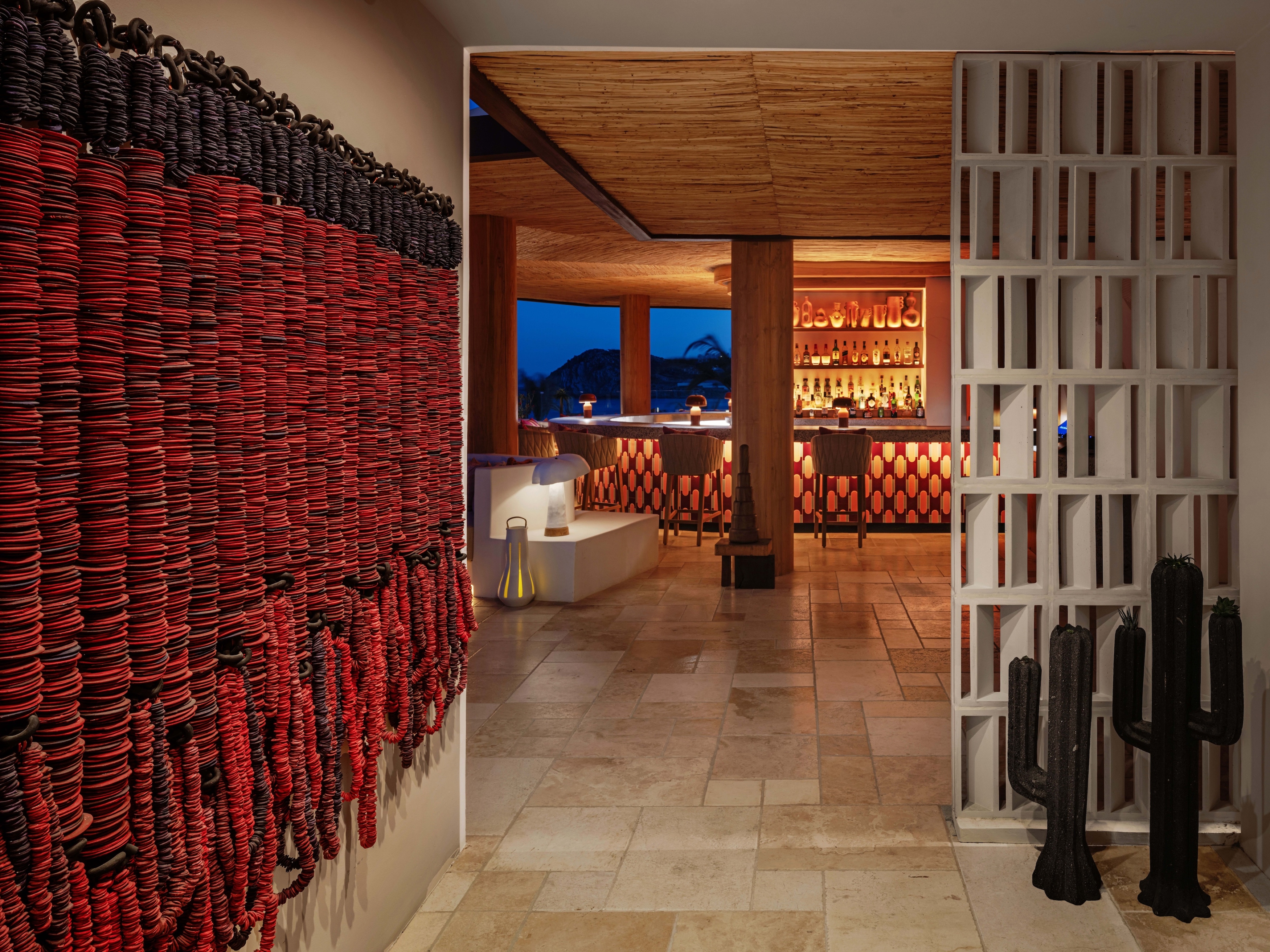 The design team worked with local construction and craft teams to beautiful effect. The entry, nestled in a desert landscape, sets the stage with its whimsically carved host stand, substantial metal pivot wall and textural breeze block wall. Magenta tile creates a strong graphic statement at the curving bar. Here, the top shelf here is reserved for a curated collection Oaxacan pottery hand-sourced by the team. A smooth latilla ceiling offers protection with modern flair. The poured, terrazzo-style bar top is designed with the open-air setting in mind.