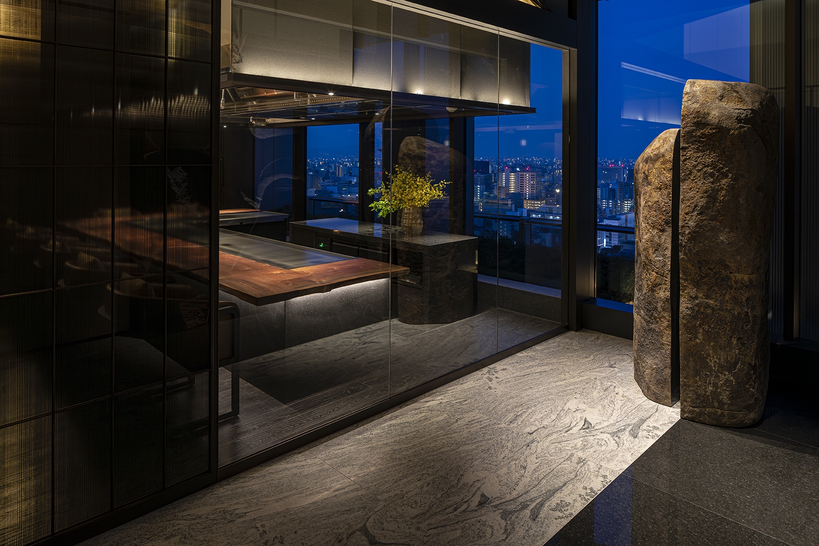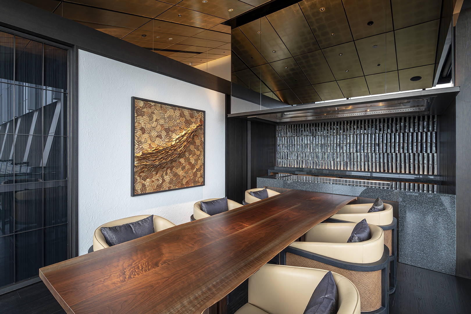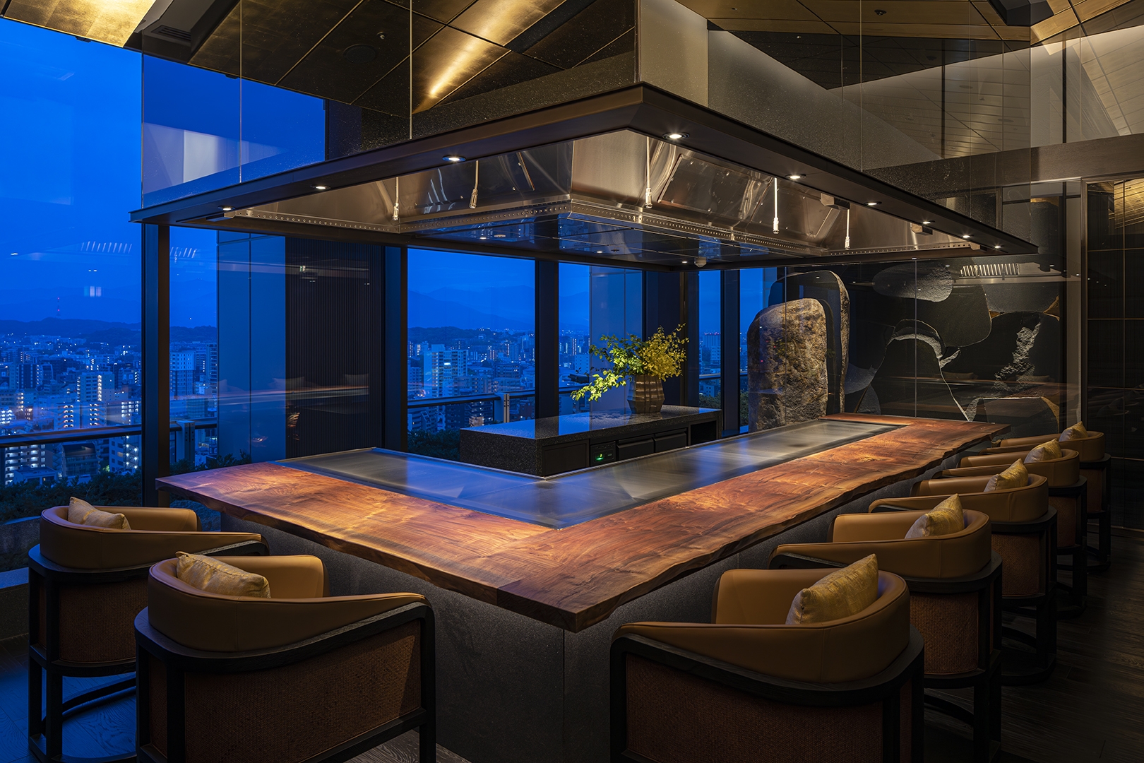 A specialty restaurant offering sushi, kaiseki and teppanyaki in a single complex. The traditional Japanese architecture and traditional Fukuoka’s craftsmanship are narrated in contemporary design languages throughout the space. The reception is arrayed vertical louvers, seen in traditional Japanese houses, with shimmering navy effect. The ceiling and wall in sushi area is wrapped in polyhedral panels inspired by the umbrella ribs of Fukuoka's Chikugo wagasa meshed with tin foiled sloped ceiling. The sushi counter is made of a solid ginkgo wood native to Fukuoka. The copper counter in Kaiseki area reminiscing a tea canister, inherited from Fukuoka’s tea culture. The teppanyaki area draws inspiration from weaving technique Rantai shikki in Fukuoka – interpreted in a modern expression. The corridor leading to these three areas evoke a sense of Japanese road sequences. Along the path, Karesansui – Japanese dry garden with 4.2 m high basalt rocks- is placed with a modern interpretation. The memory and the traditional techniques embedded in this land, and the richness of Fukuoka's craftmanship are meticulously interpreted and expressed in the space, leading guests' to deeper experience.