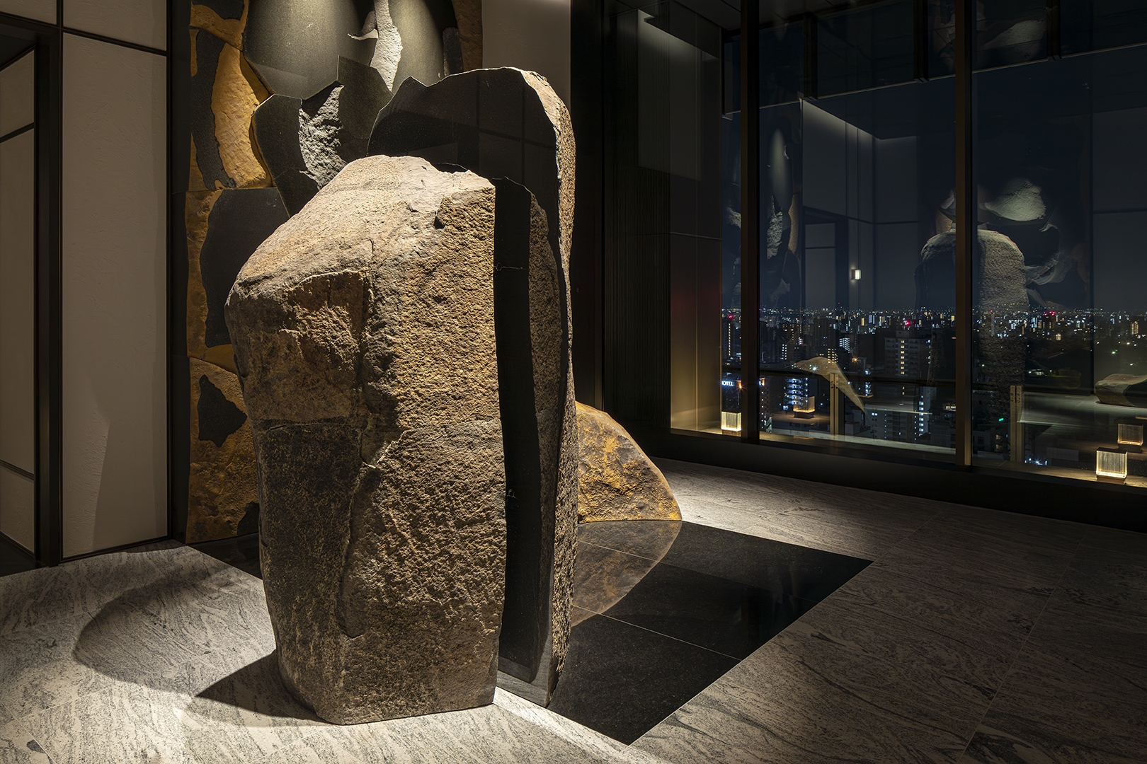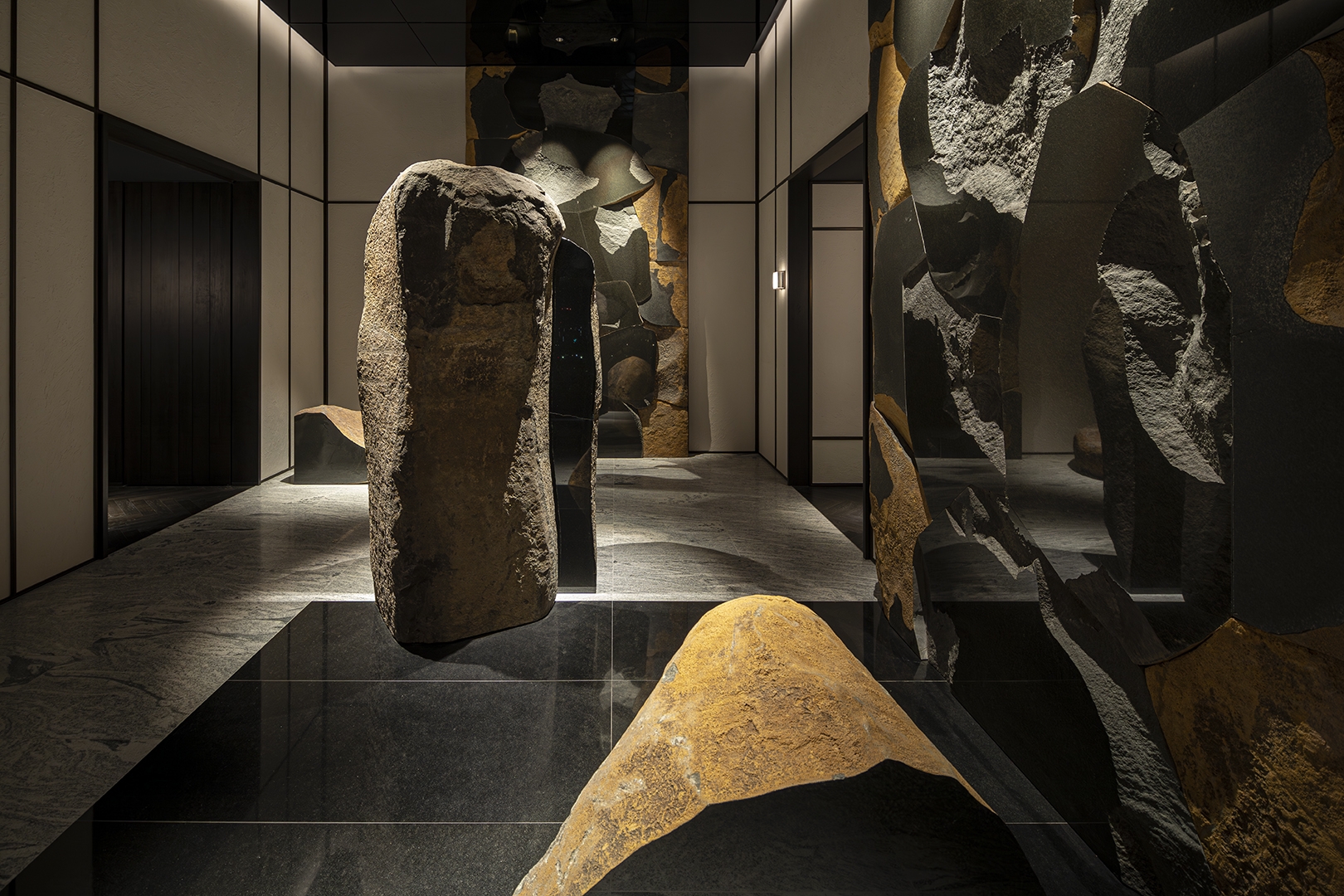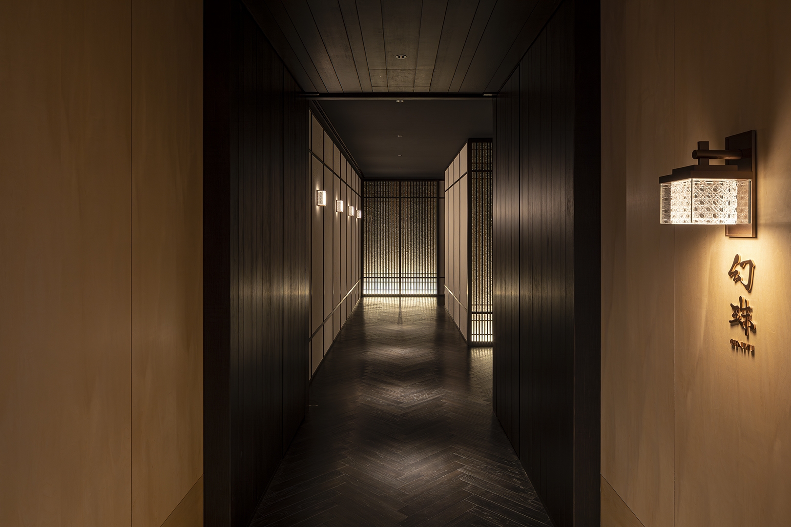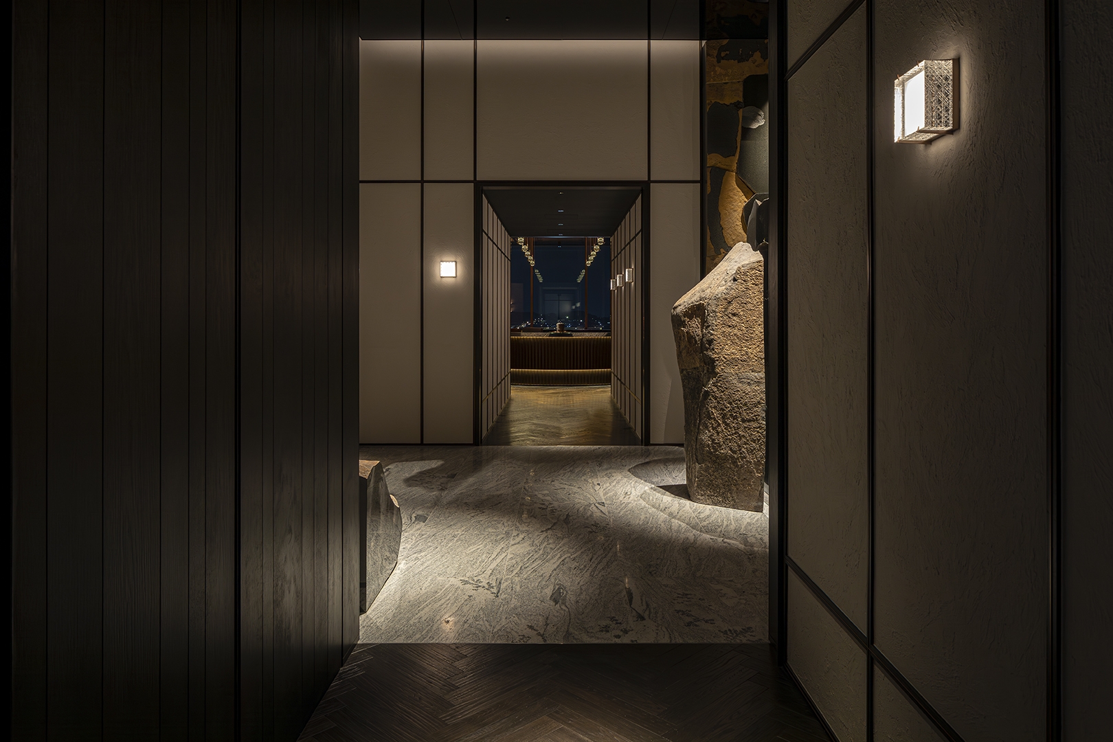 A specialty restaurant offering sushi, kaiseki and teppanyaki in a single complex. The traditional Japanese architecture and traditional Fukuoka’s craftsmanship are narrated in contemporary design languages throughout the space. The reception is arrayed vertical louvers, seen in traditional Japanese houses, with shimmering navy effect. The ceiling and wall in sushi area is wrapped in polyhedral panels inspired by the umbrella ribs of Fukuoka's Chikugo wagasa meshed with tin foiled sloped ceiling. The sushi counter is made of a solid ginkgo wood native to Fukuoka. The copper counter in Kaiseki area reminiscing a tea canister, inherited from Fukuoka’s tea culture. The teppanyaki area draws inspiration from weaving technique Rantai shikki in Fukuoka – interpreted in a modern expression. The corridor leading to these three areas evoke a sense of Japanese road sequences. Along the path, Karesansui – Japanese dry garden with 4.2 m high basalt rocks- is placed with a modern interpretation. The memory and the traditional techniques embedded in this land, and the richness of Fukuoka's craftmanship are meticulously interpreted and expressed in the space, leading guests' to deeper experience.