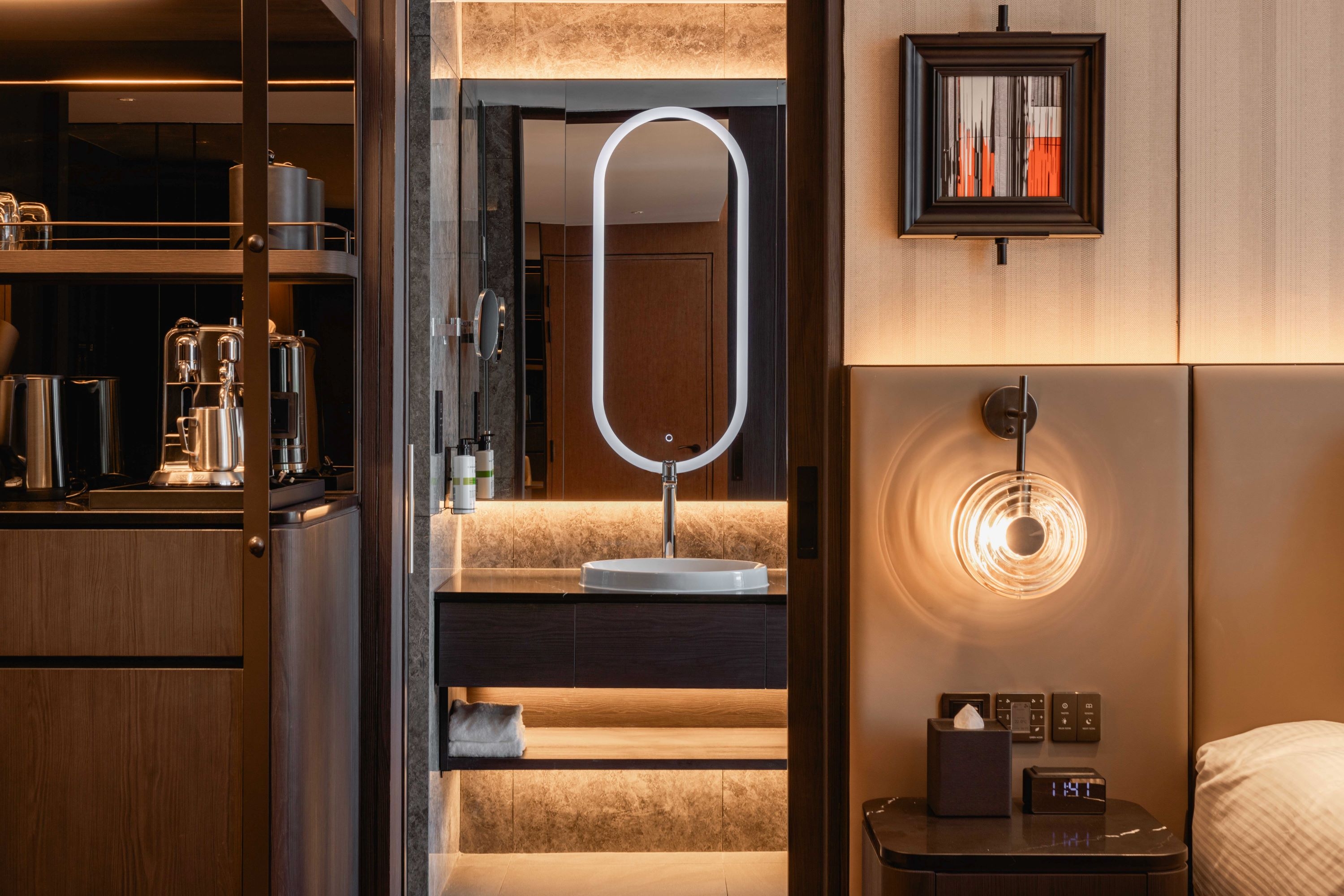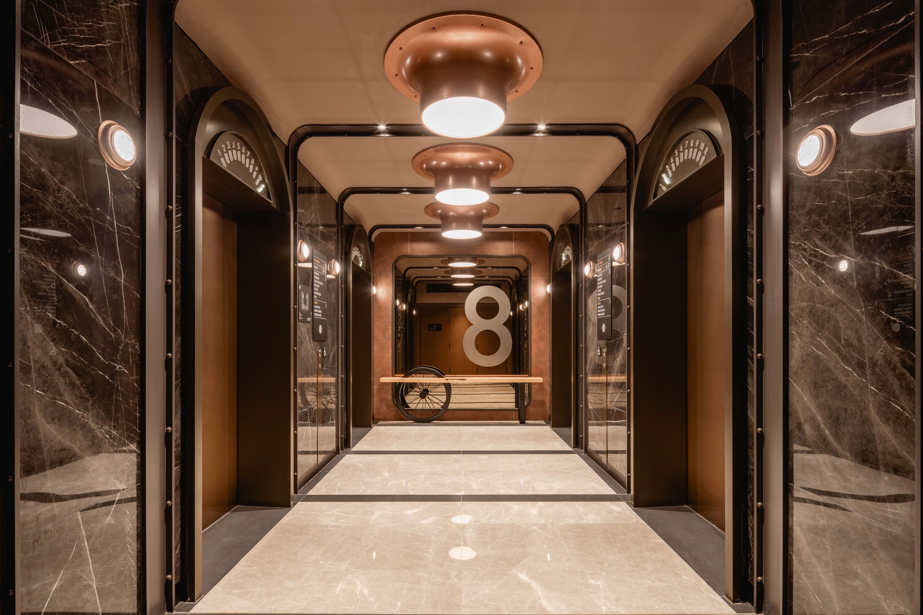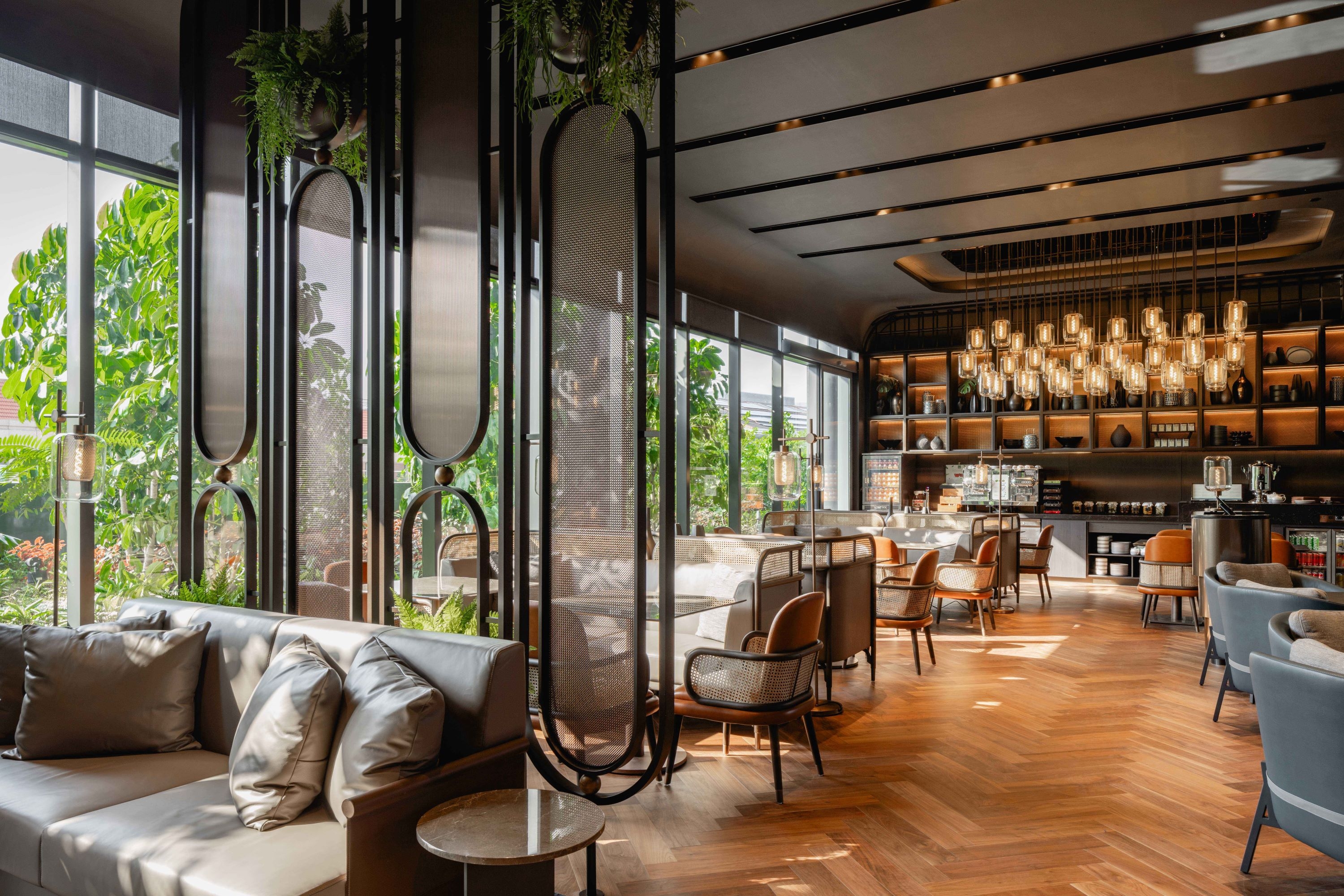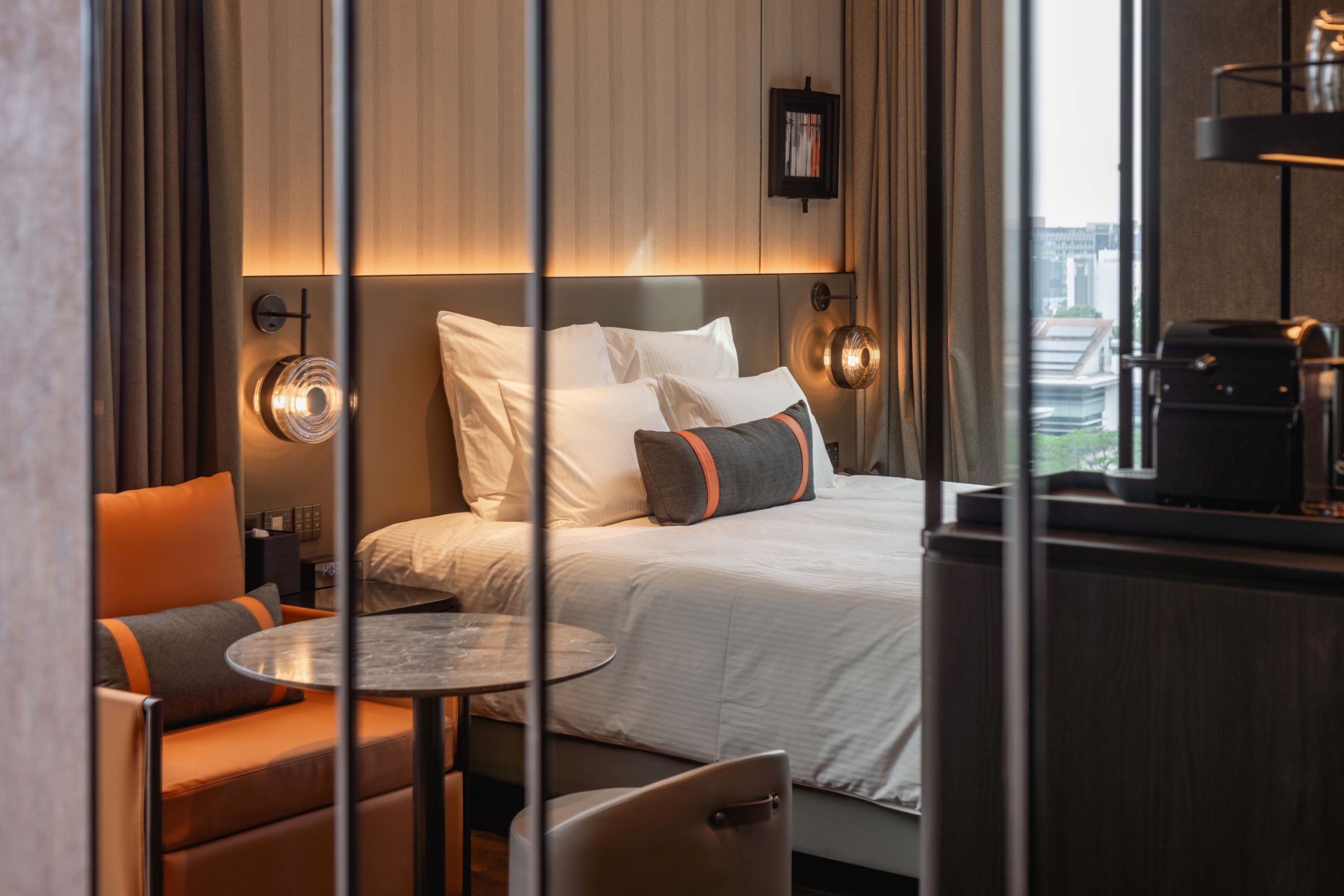 Pullman Singapore Hill Street offers a contemporary retreat inspired by the George Pullman train car. As the brand’s inaugural global representation, the hotel integrates seamlessly with its urban surroundings, featuring a podium and tower that align with the height of nearby conserved shophouses. The podium’s terracotta-coloured façade mimics railway sleepers, while the vertical elements of the tower reinforce the railway theme.