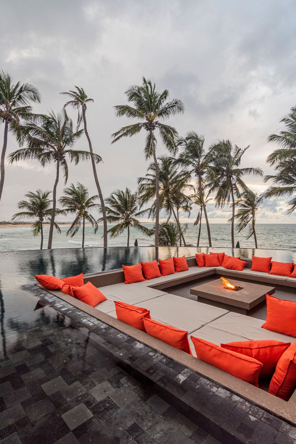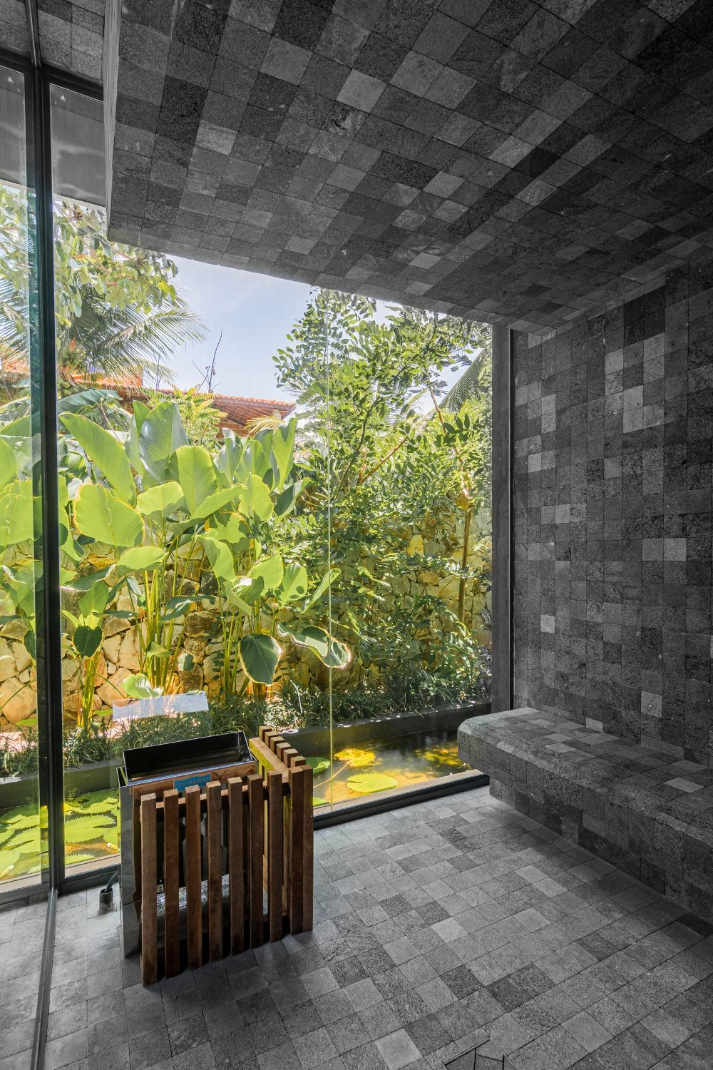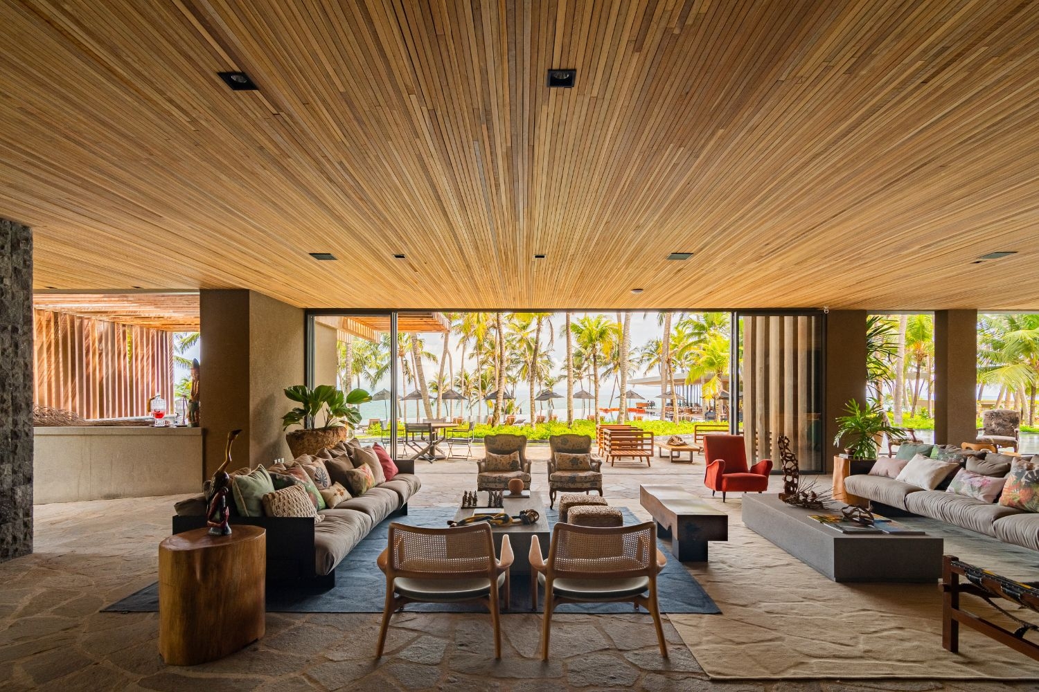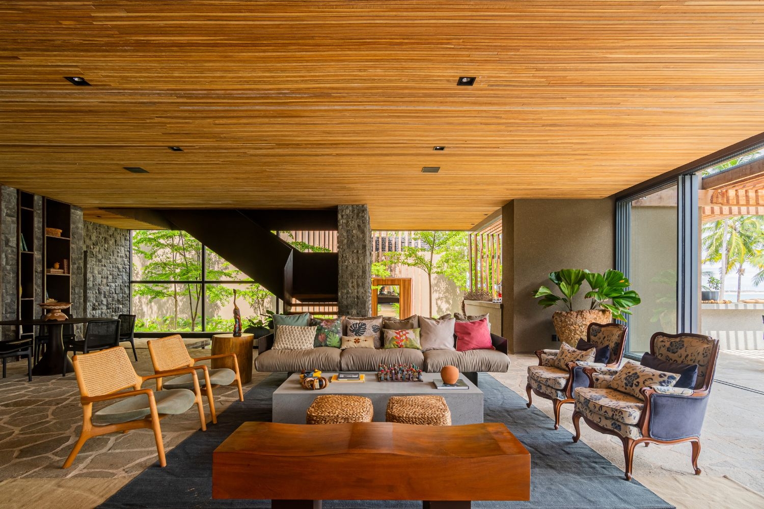 While the architectural design creates a broad balcony facing the sea, defined by orthogonal forms, and the landscaping enhances the sensory impact of tropical vegetation and water features, the Interior design integrates diverse materials and cultures with emotional depth, where everything tells a story: macramé knot craftings coexist with custom-made corten steel furniture; the cozy armchair from the grandmother's house coexists with a piece by contemporary Brazilian designer Jader Almeida; the Hitam stone imported from Indonesia aligns with the dried bamboo found on the site during construction.