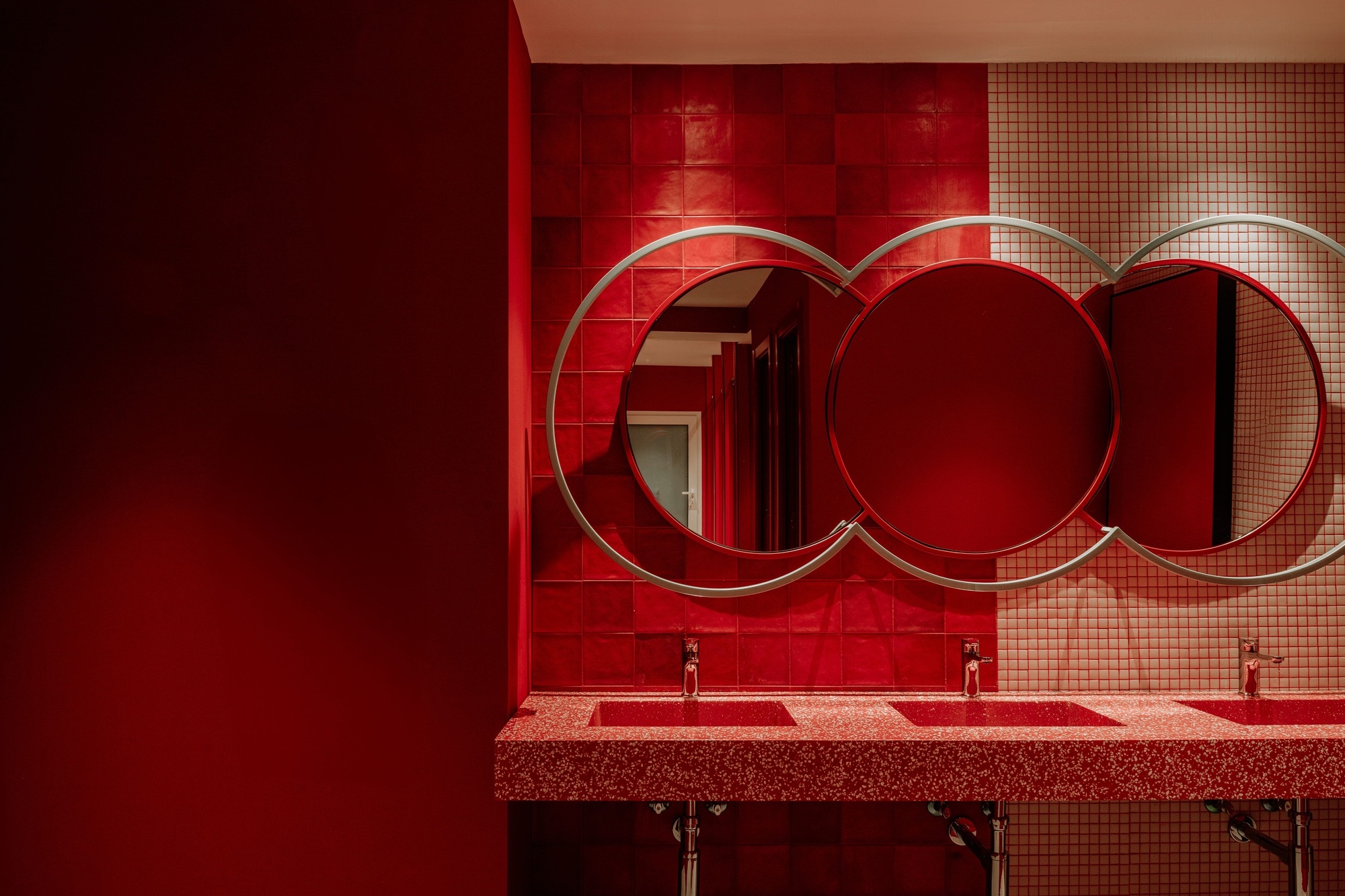 This visual narrative is built on the basis of a strong color palette, which bathes the rooms in desaturated blue tones in contrast with bright Ferrari reds, applied both inside and outside, in details of moldings, railings or in its hypnotic red room.