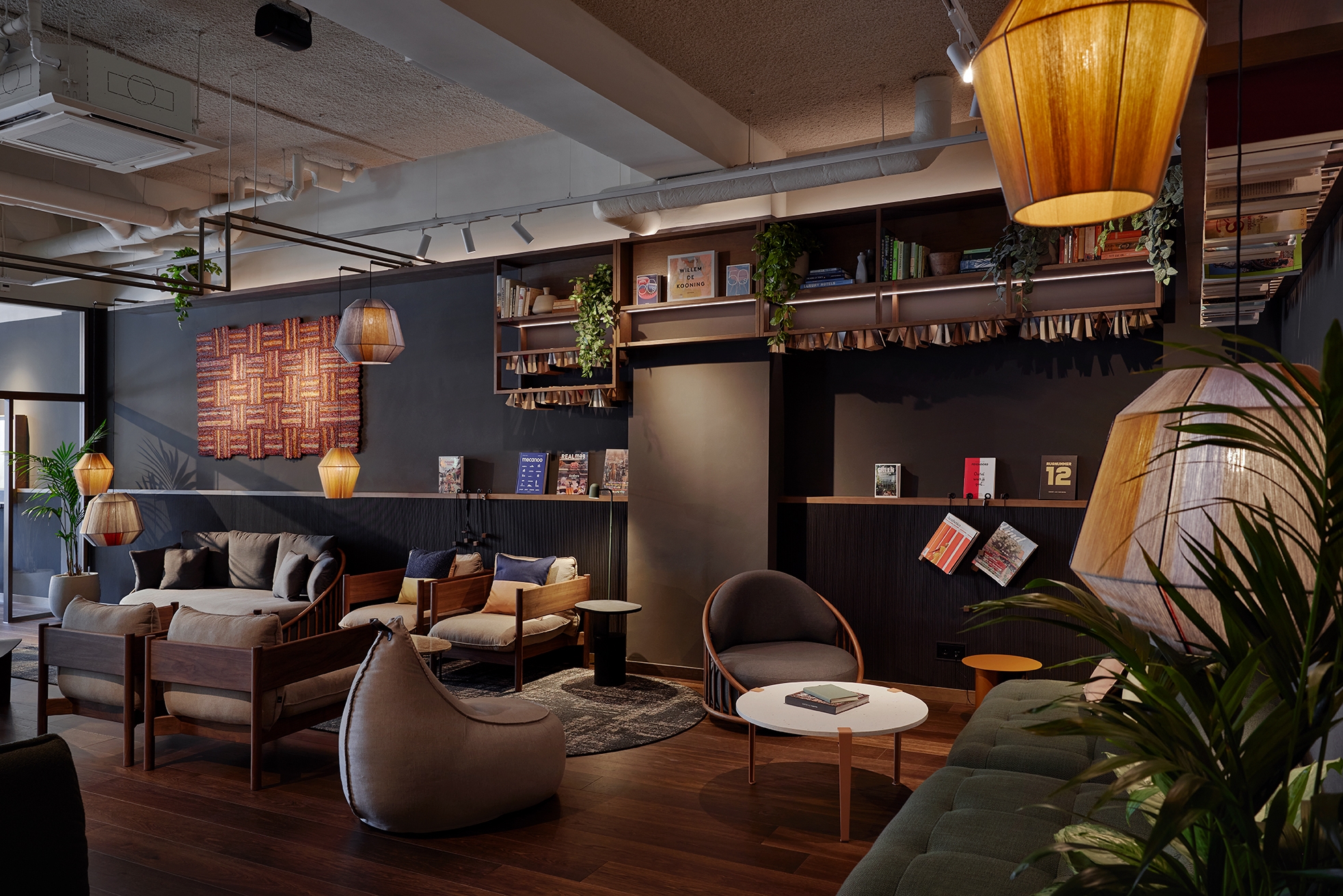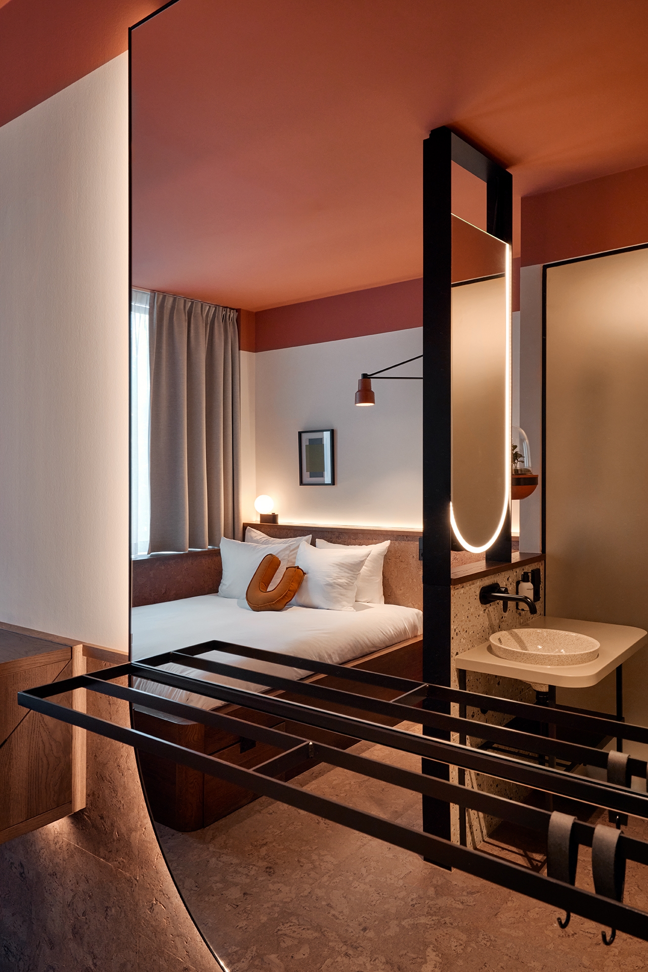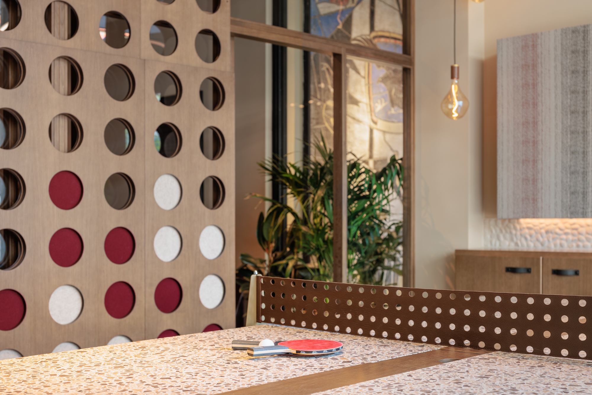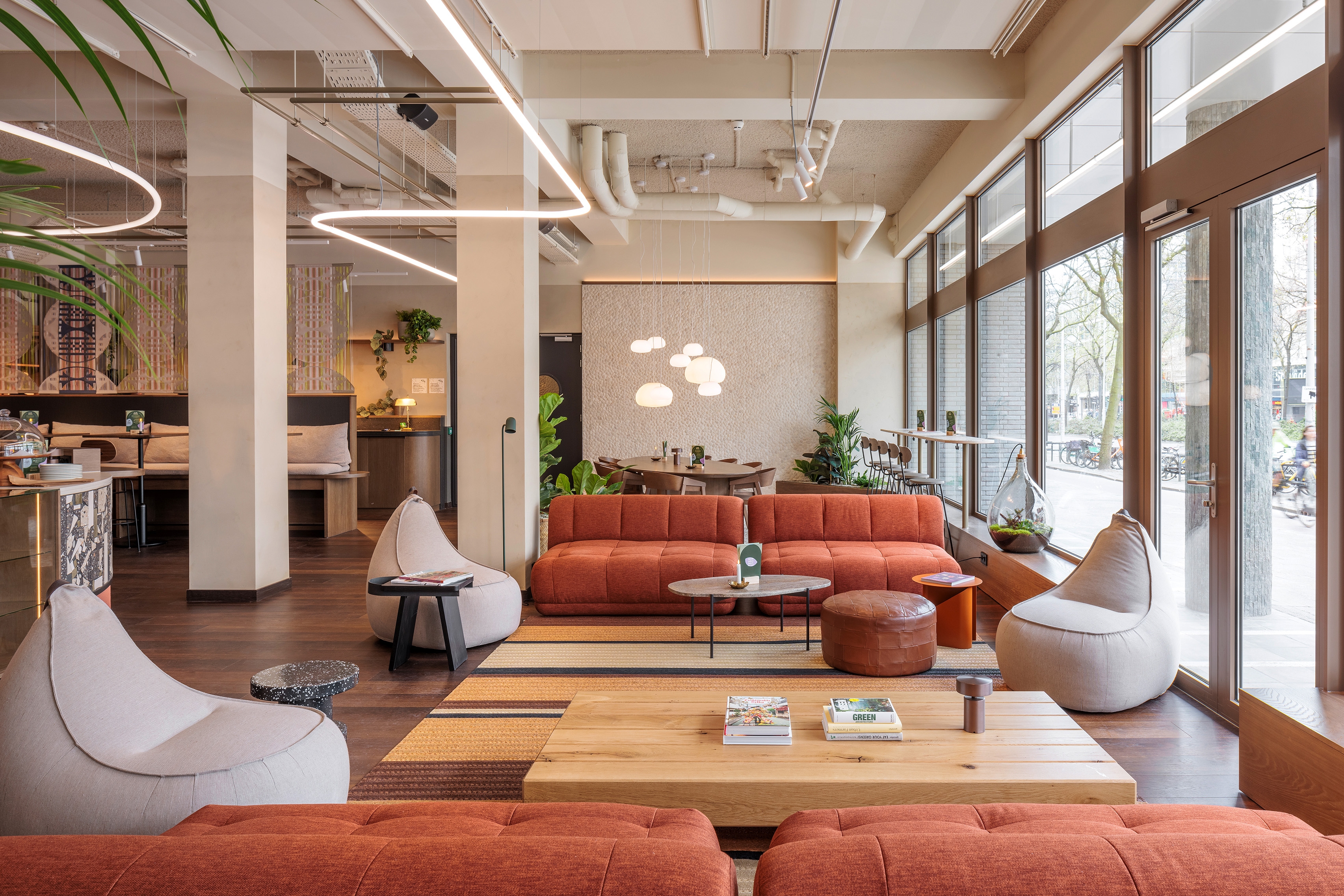 In Rotterdam, ESG values & UN Sustainable Development Goals inform every decision at The Usual, the Green Key-certified prototype with forthcoming BREEAM ‘Excellent’ or ‘Outstanding’ ranking. The designers‘ vision? Make conscious travel a force for good through regenerative hospitality that goes beyond traditional sustainability practices to actively improve the environment & society. The interior architect’s FF&E research developing this new brand’s standards enabled the use of sustainable & circular products in the listed, 207-key hotel with long-stay studios. The meticulous, time-consuming process required greater upfront expense by the developers but is forecast to be recouped from lower operational costs in years to come. Interior concepts strengthen community & knowledge-sharing amongst guests & local experts, while biophilic greenery & natural materials instil openness & wellbeing. Terrazzo tile offcuts form The U Bar’s mosaic cladding, & barstools are made from coffee shell & plastic waste. Upcycled flea-market-finds introduce history & soul, plus a huge ‘Connect Four’ game becomes a room divider by the ping-pong table. Artists can craft & sell creations in The MakersStudio