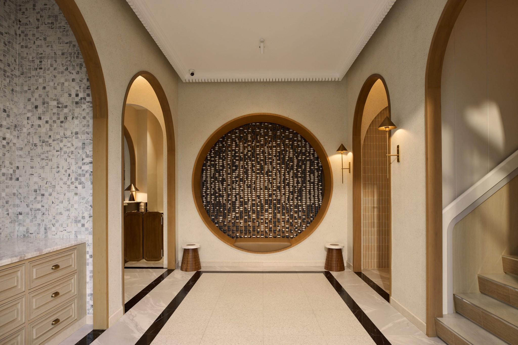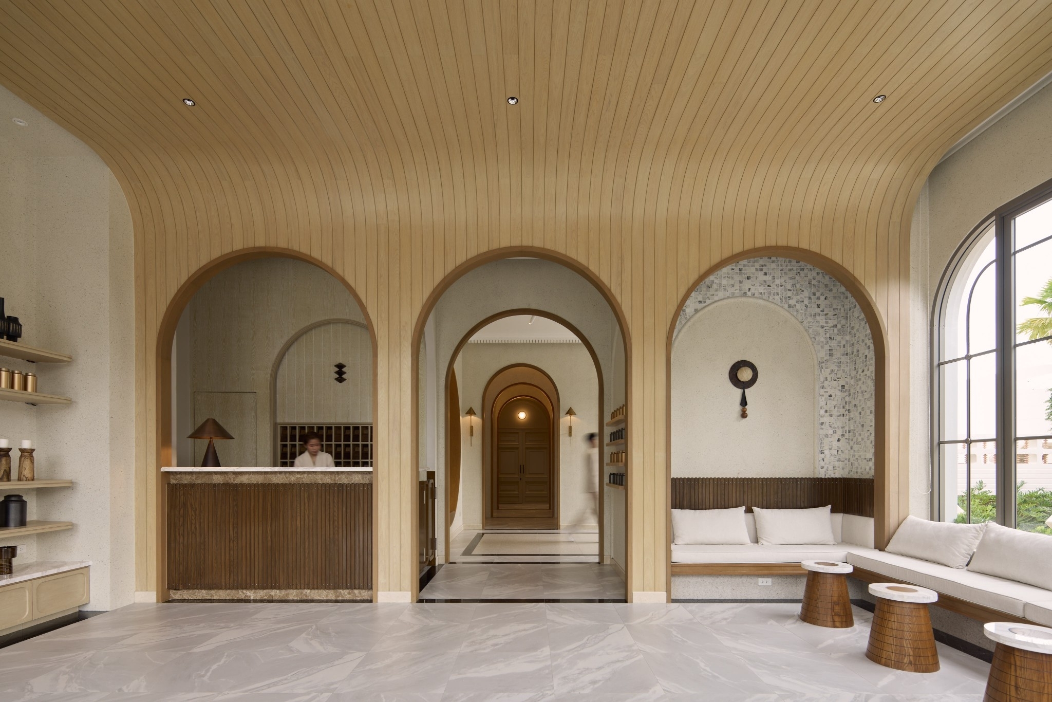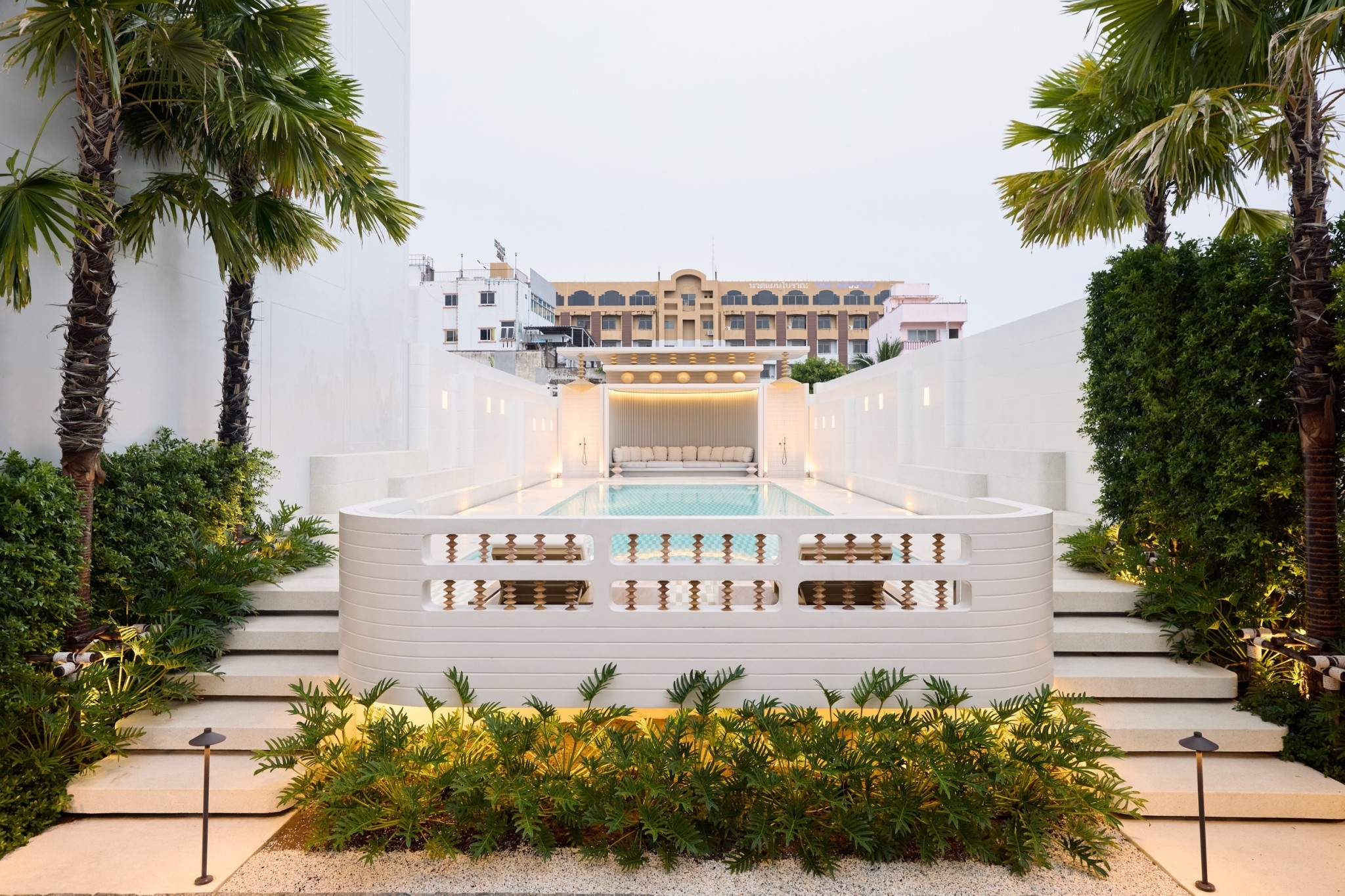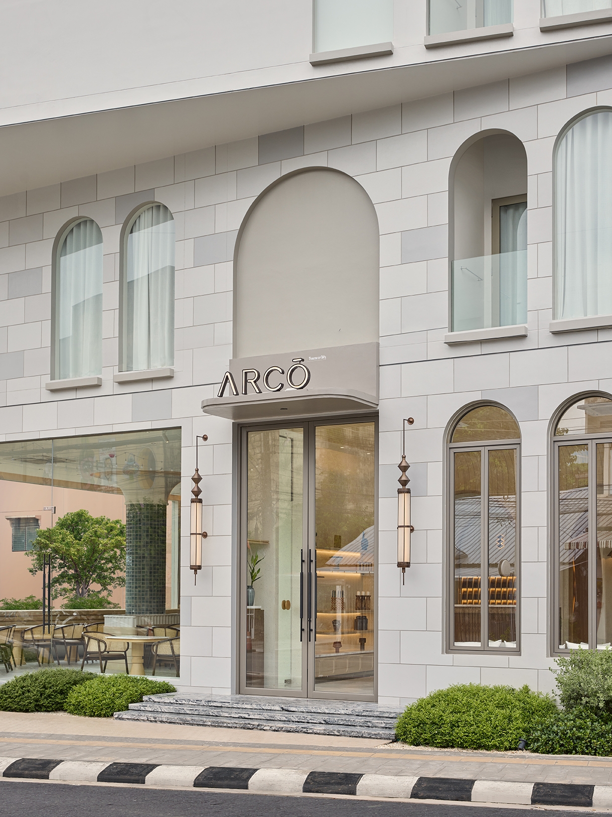 ARCO is a six-story boutique hotel with a geometric white cement exterior. The façade features arches inspired by traditional “Baba” shophouses, arranged in a rhythmic pattern. The ground floor hosts public spaces, including a triple-arch lobby and a corridor with traditional five-foot arcades (Ngor-Kha-Khi), leading to the elevator foyer which also connects the interior to the pool sanctuary inspired by Chinese opera stages, elevated to overlook the palm courtyard and tropical Southeast Asian landscaping. Abacus-inspired patterns, symbolizing its historical trade route from Europe to China, are subtly woven into furniture, lamps, and sculptures crafted by local artisans.