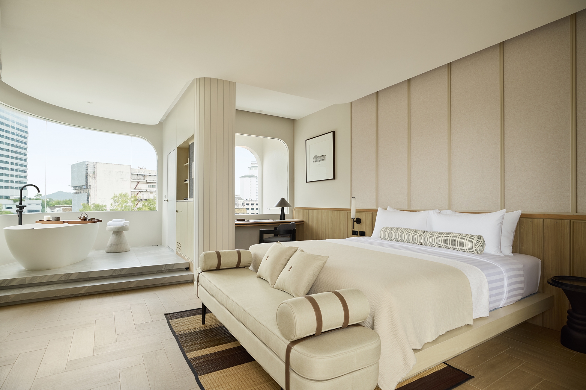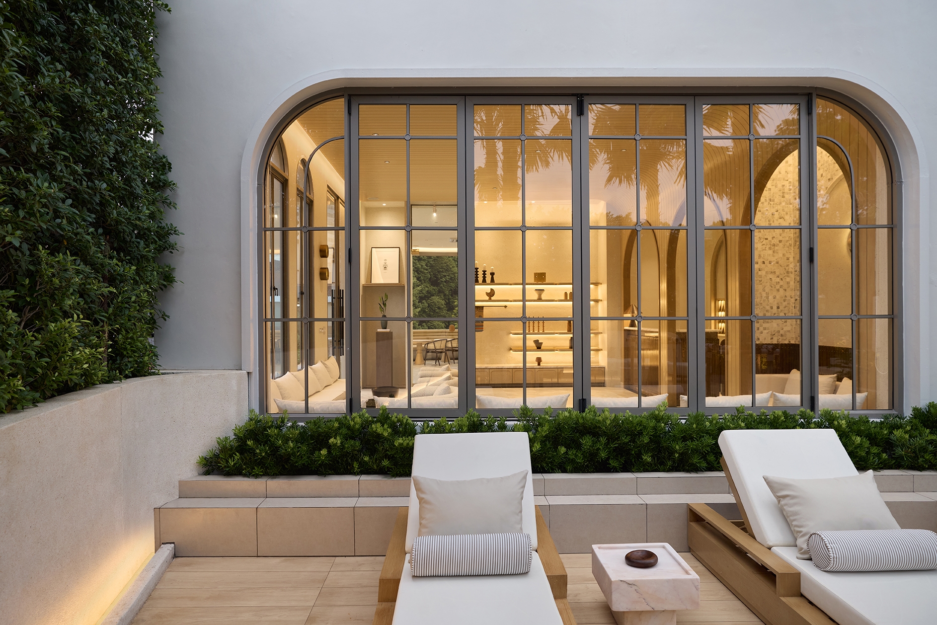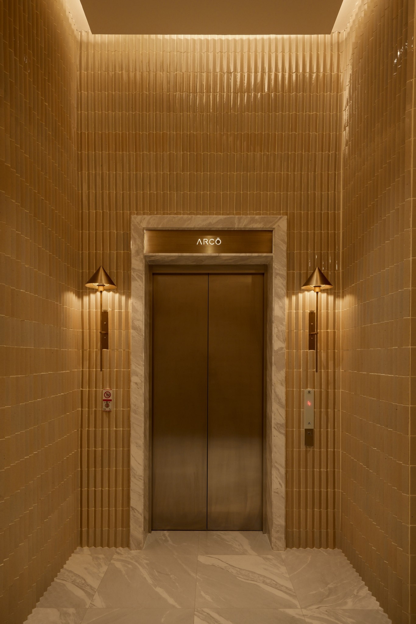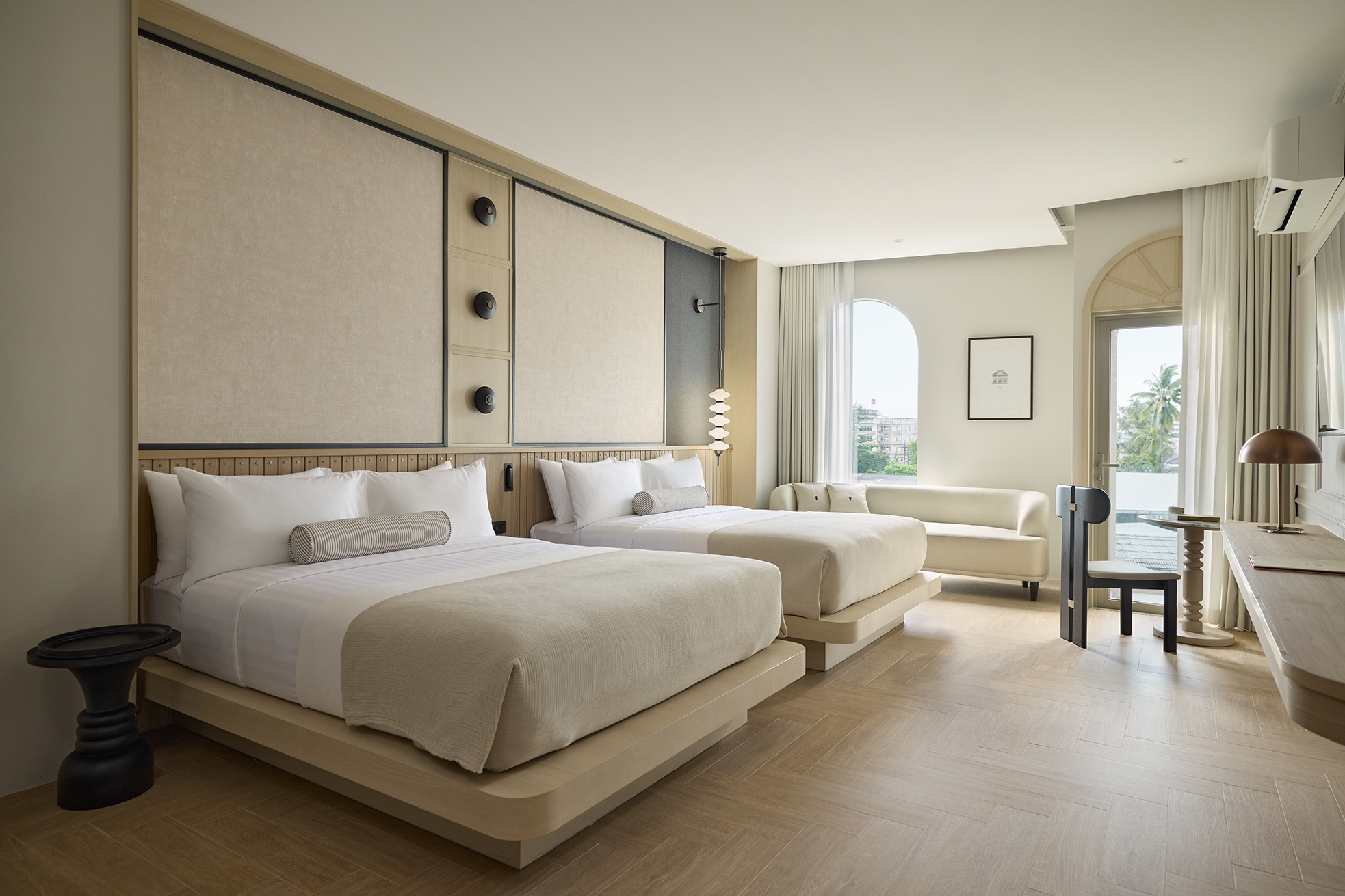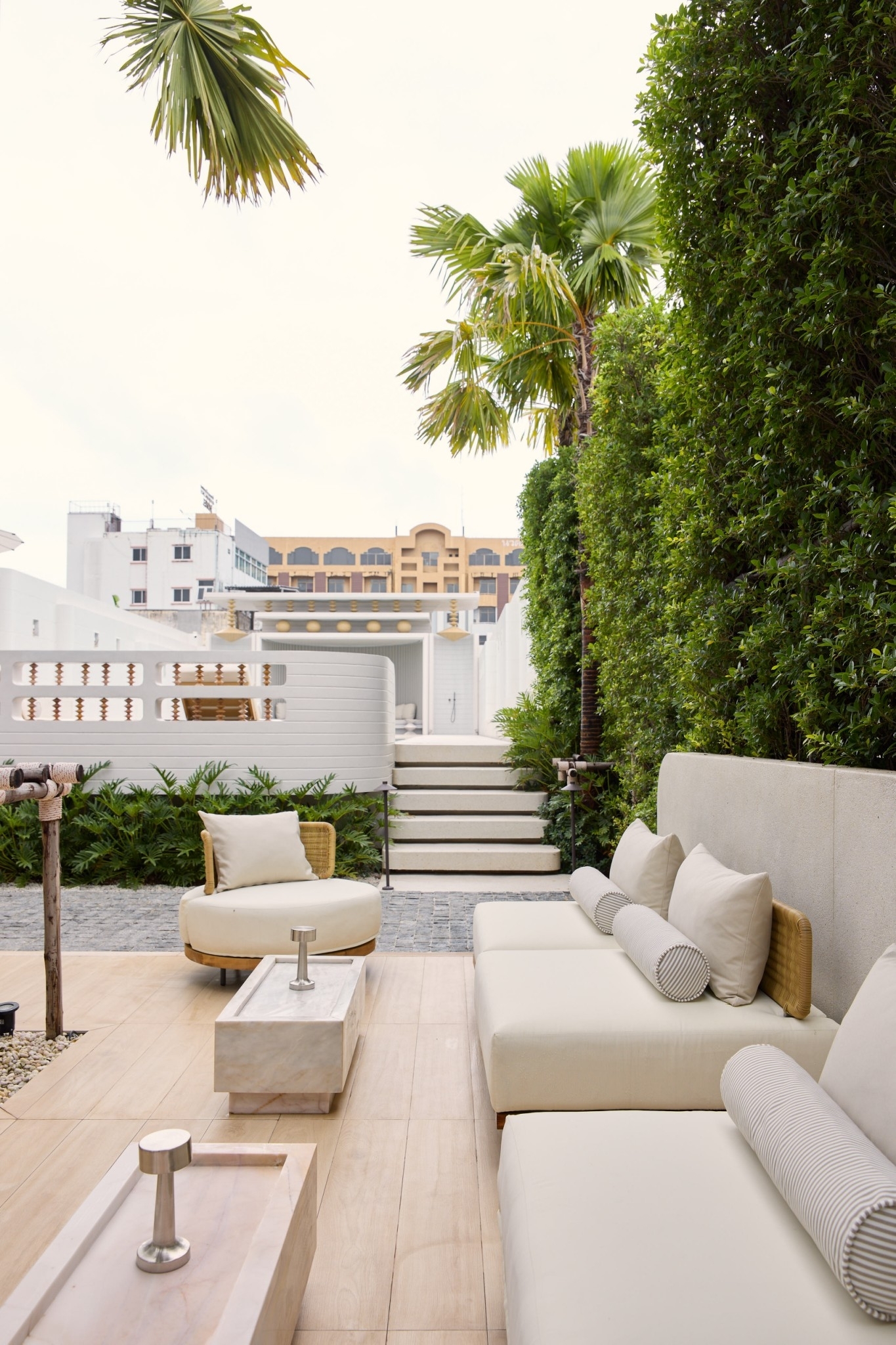 ARCO is a six-story boutique hotel with a geometric white cement exterior. The façade features arches inspired by traditional “Baba” shophouses, arranged in a rhythmic pattern. The ground floor hosts public spaces, including a triple-arch lobby and a corridor with traditional five-foot arcades (Ngor-Kha-Khi), leading to the elevator foyer which also connects the interior to the pool sanctuary inspired by Chinese opera stages, elevated to overlook the palm courtyard and tropical Southeast Asian landscaping. Abacus-inspired patterns, symbolizing its historical trade route from Europe to China, are subtly woven into furniture, lamps, and sculptures crafted by local artisans.