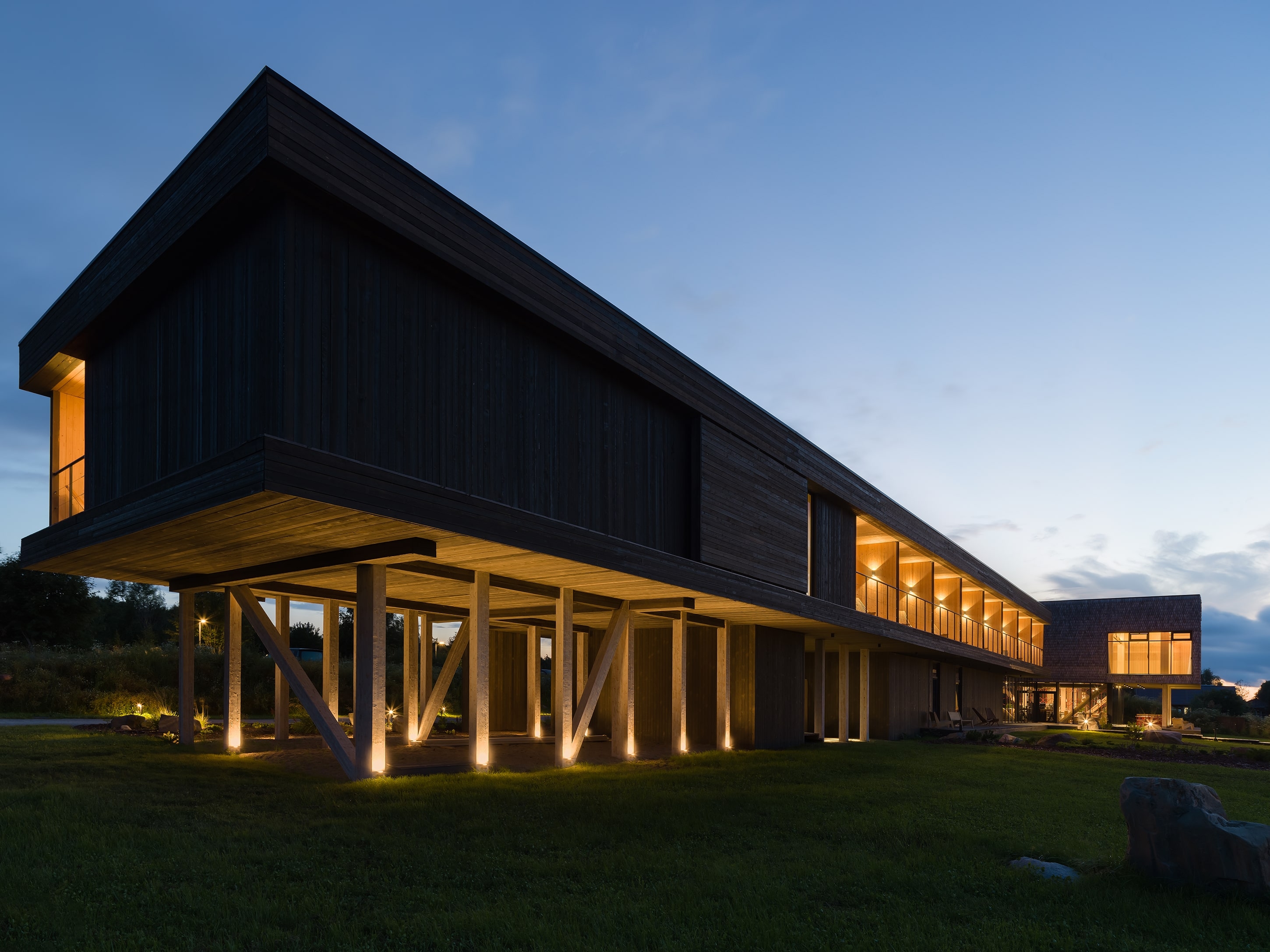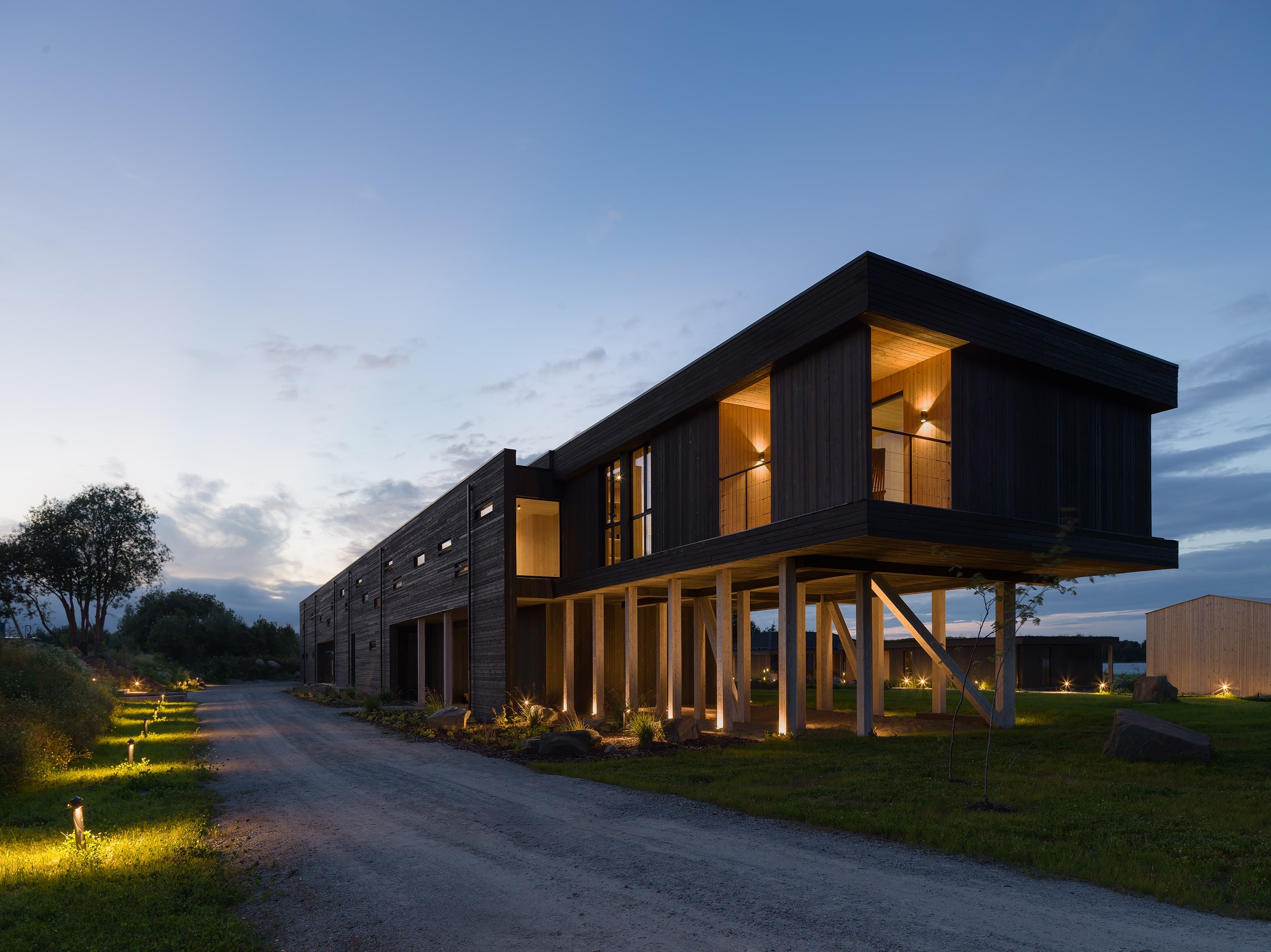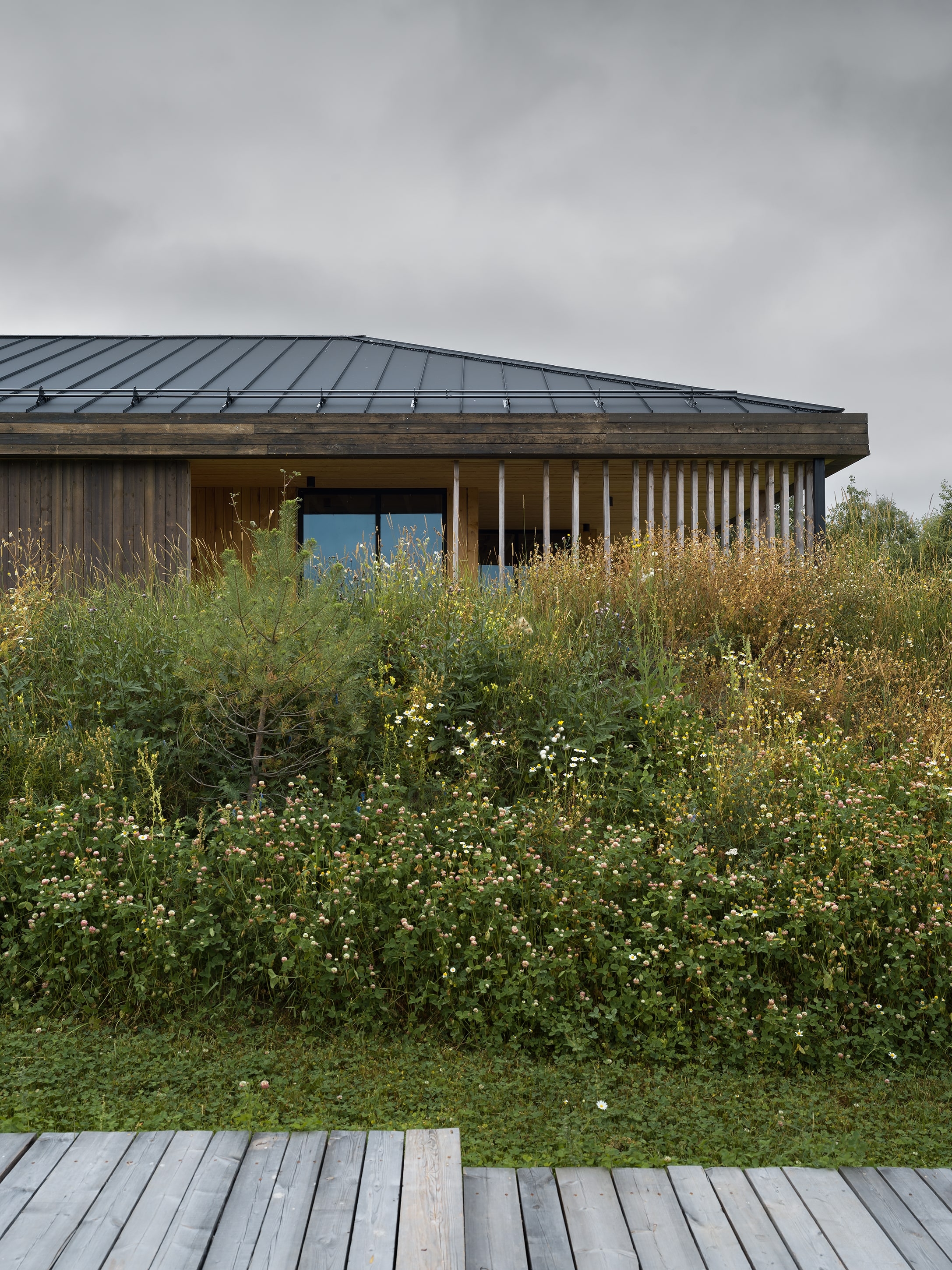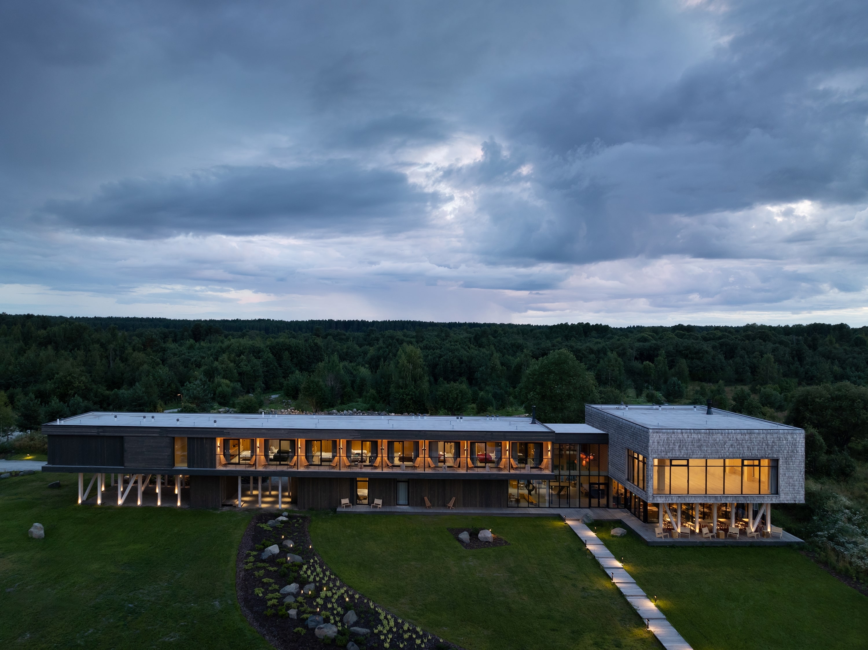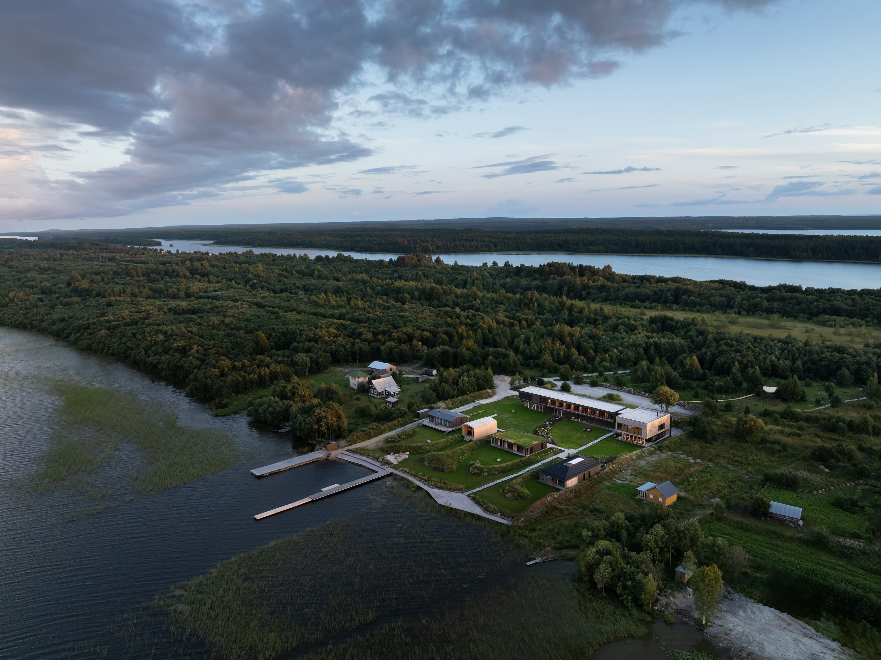 Rooted in the Russian North’s heritage, Zaonezhie boutique hotel on Lake Onega is a serene retreat. The complex features two guest houses, a sauna, and a hotel with a spacious hall for yoga and events, all designed to blend with the landscape and offer stunning lake views. Inspired by northern craftsmanship, the architecture showcases wooden facades and details reminiscent of vernacular Nordic styles. Each building balances privacy and openness. The hotel provides rooms, a restaurant, a library, and wellness spaces, creating a harmonious connection with nature and tranquility