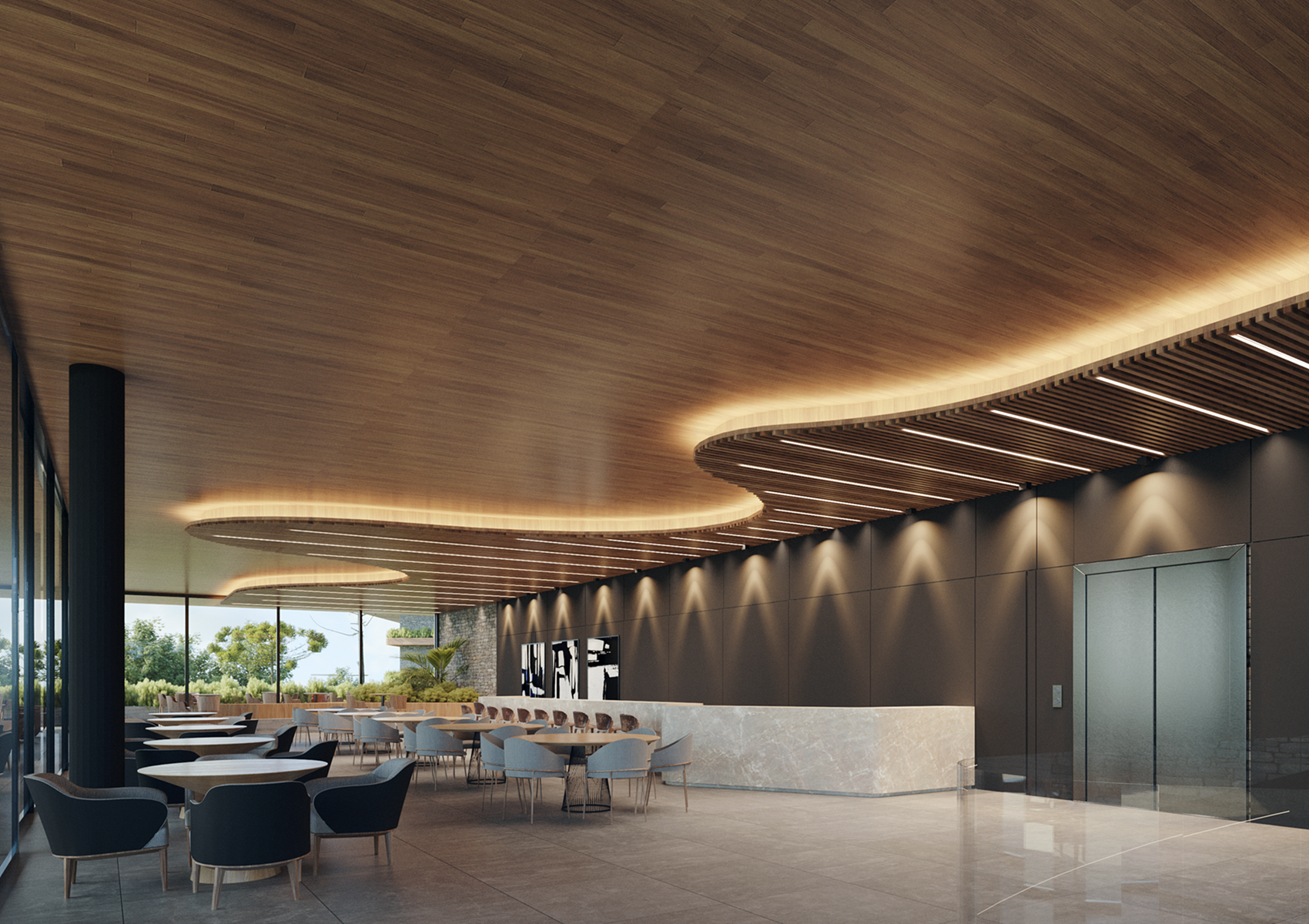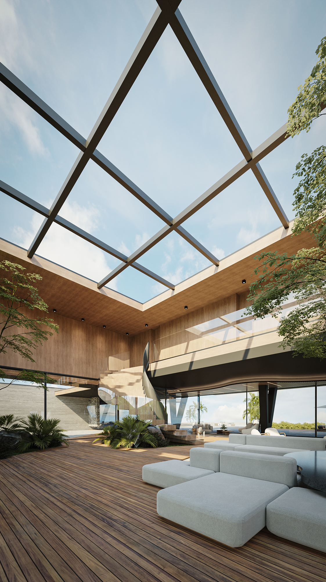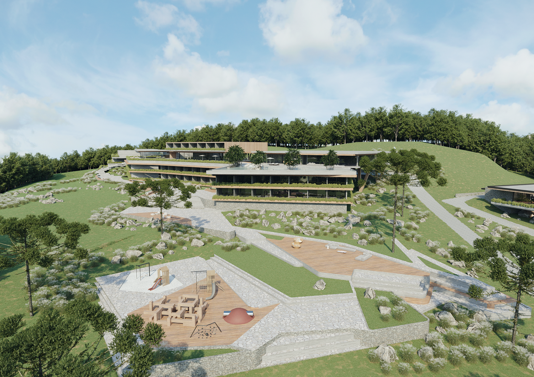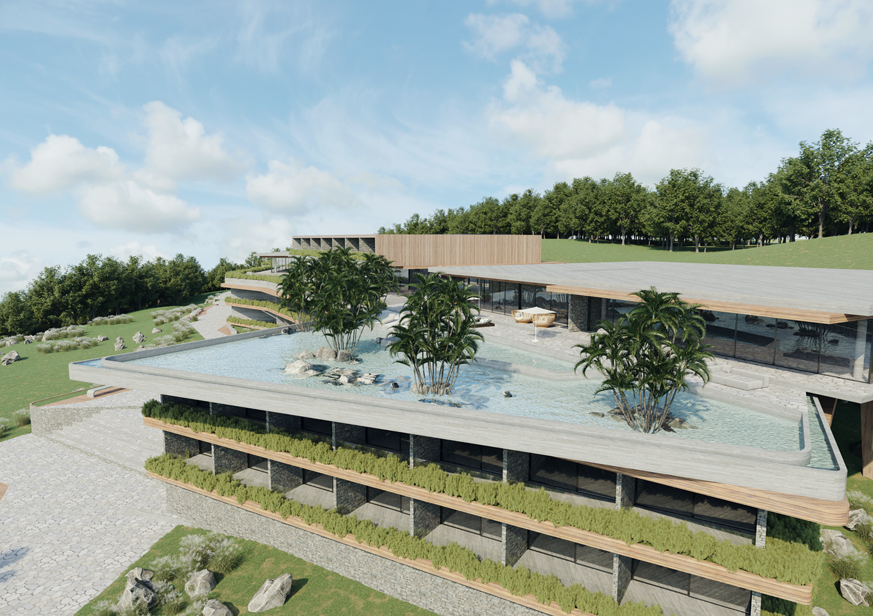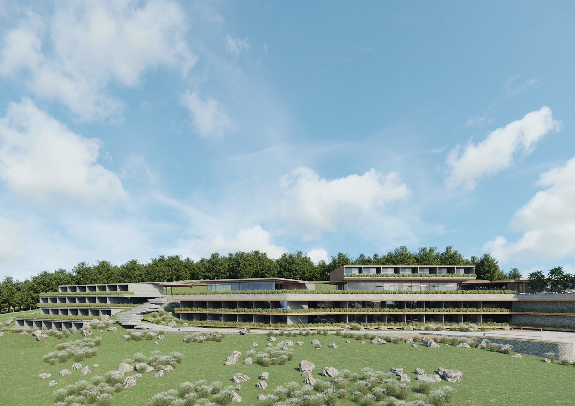 With a linear and horizontal architectural style, constructed using exposed concrete, natural stone, wood, glass, and steel, the resort combines sophistication with seamless integration into the landscape. Planters and garden terraces enhance the visual and sensory experience for visitors.