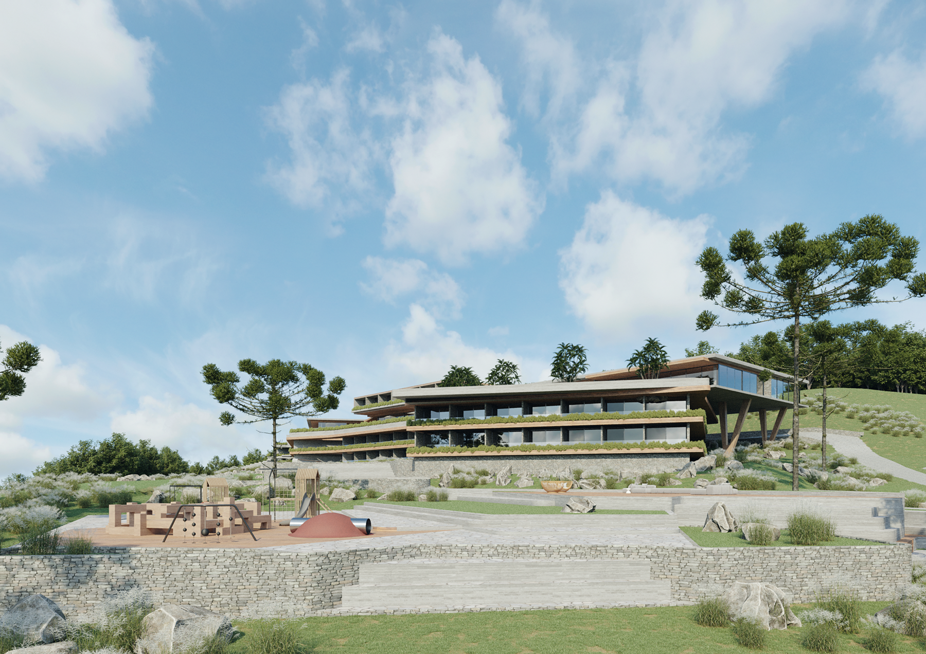Located in the charming city of Canela, the Hotel Vale da Montanha offers a unique experience amidst nature. Spanning a total area of 16,000 m², its design harmonizes with the mountainous terrain, respecting the topography and providing breathtaking views of the valley and surrounding mountains.