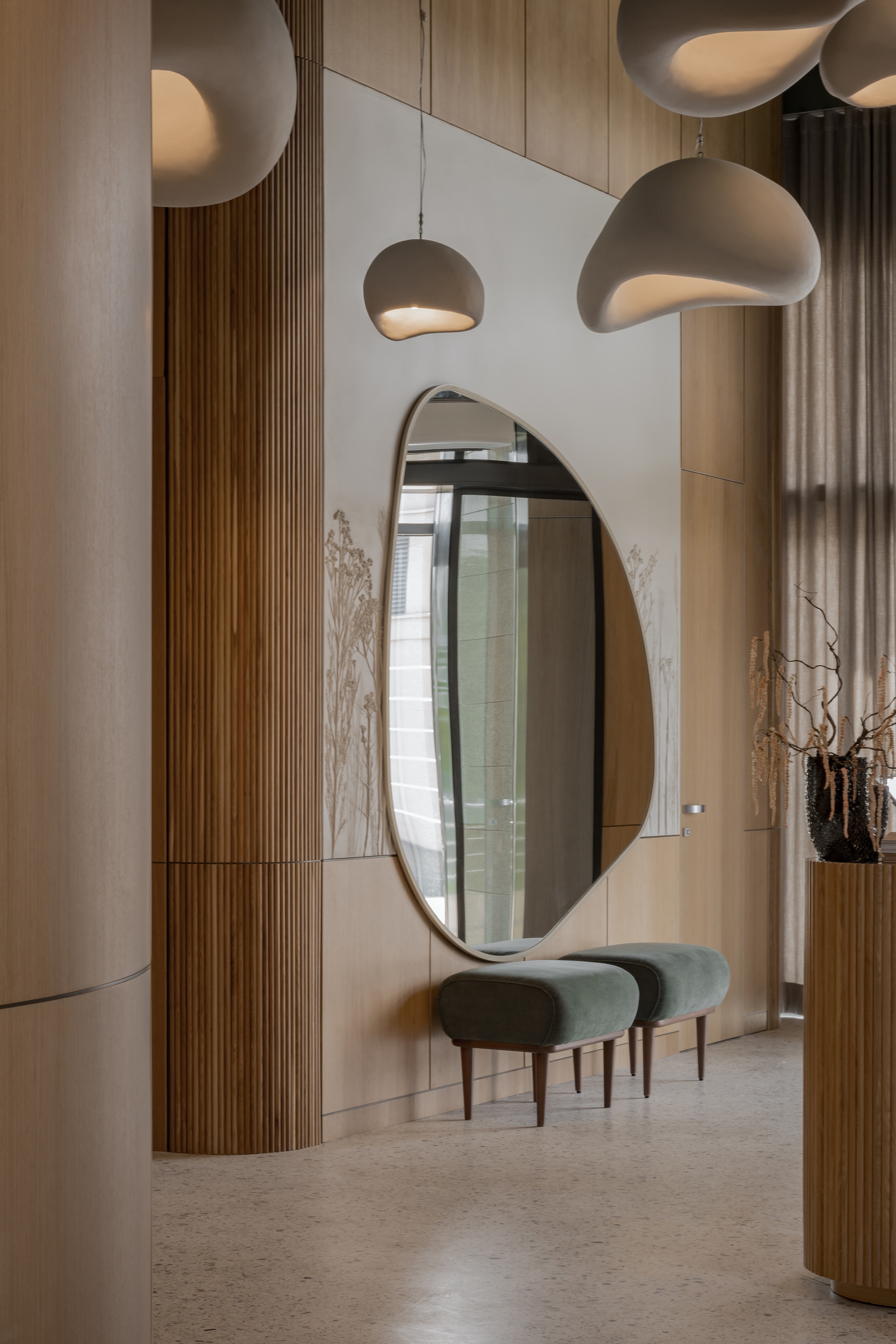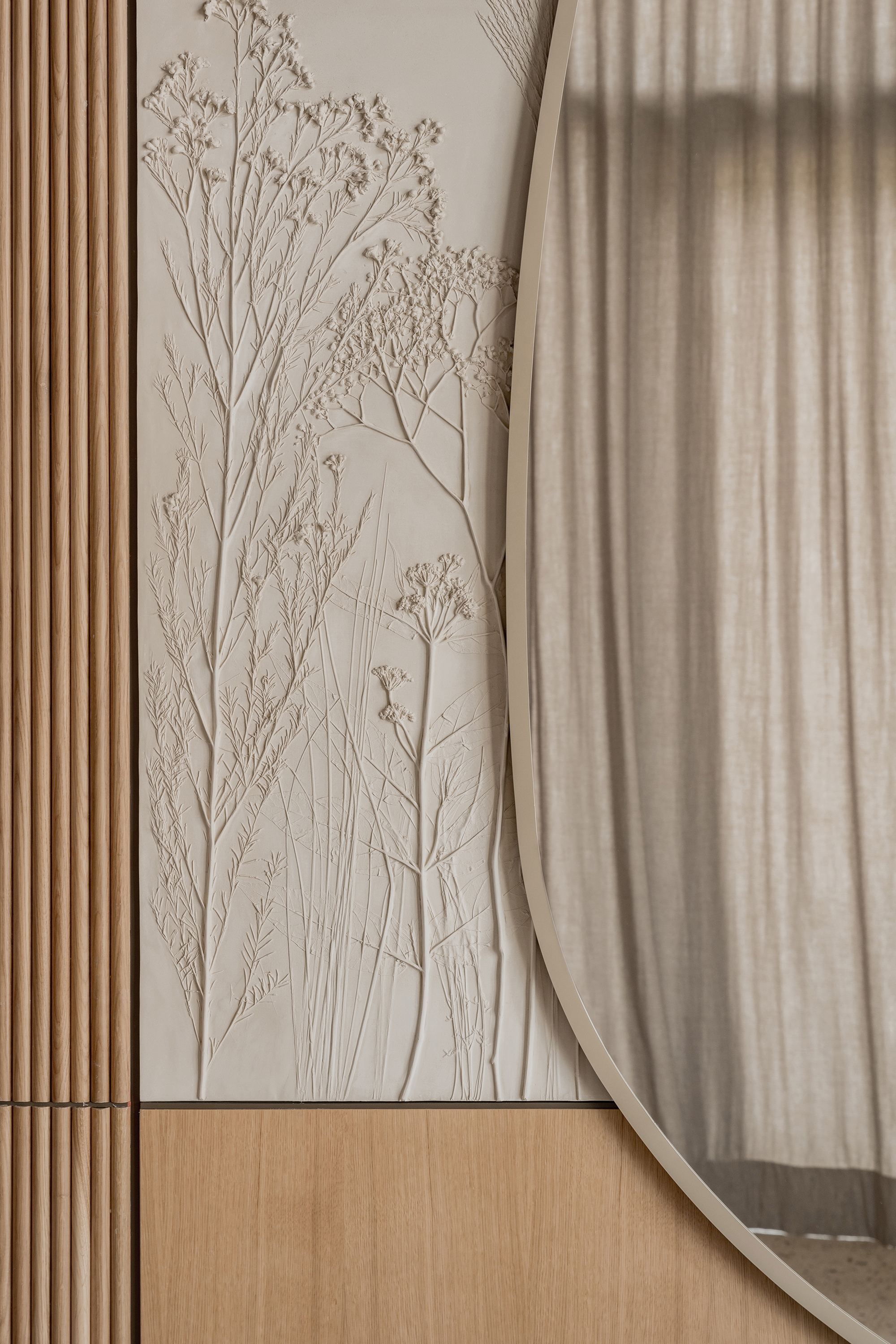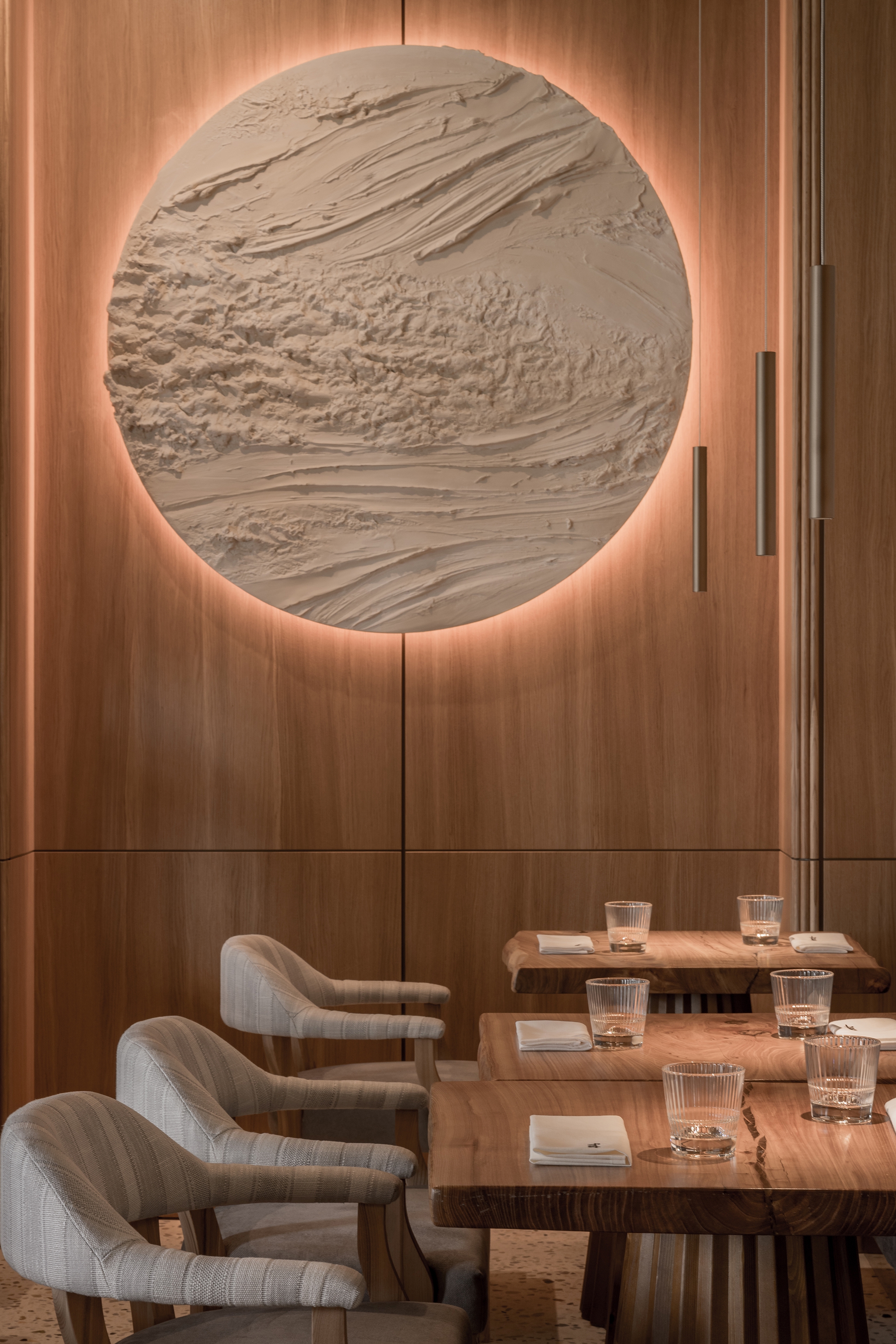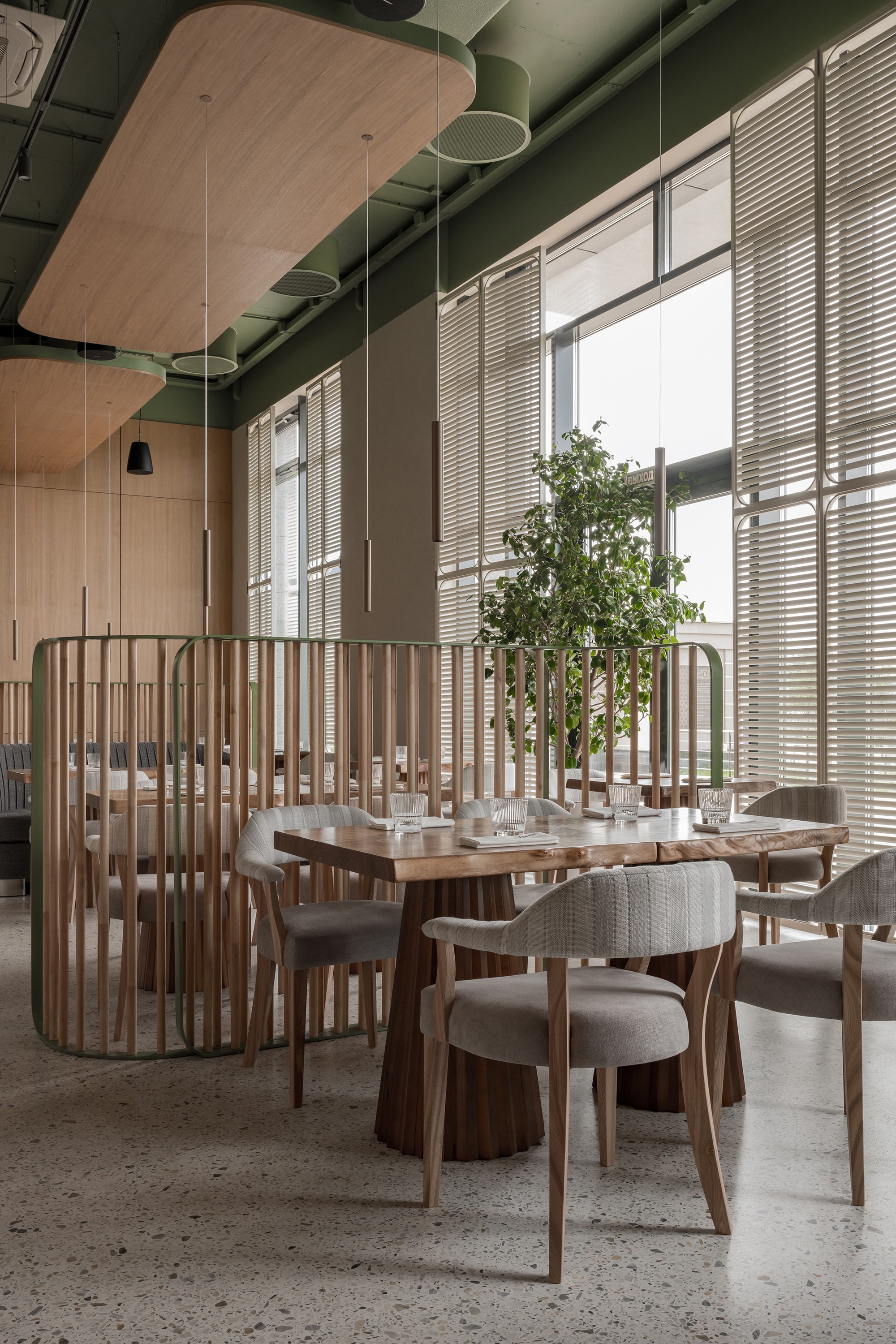 Forest is a restaurant of modern cuisine for every day. The philosophy of the interior is that nothing in the restaurant should distract from cuisine. The interior is made in a modern style and natural colors. The main finishing materials are wood, stone, metal and plaster. The cement-polymer floor is made using the natural terrazzo technique using local stones.The main decorative accent in the interior is a botanical bas-relief made by the Ural sculptor. The interior should be calm and stylish. The interior should not be bright. Natural motifs and materials should be present in the interior, because the name of the restaurant is "Forest".