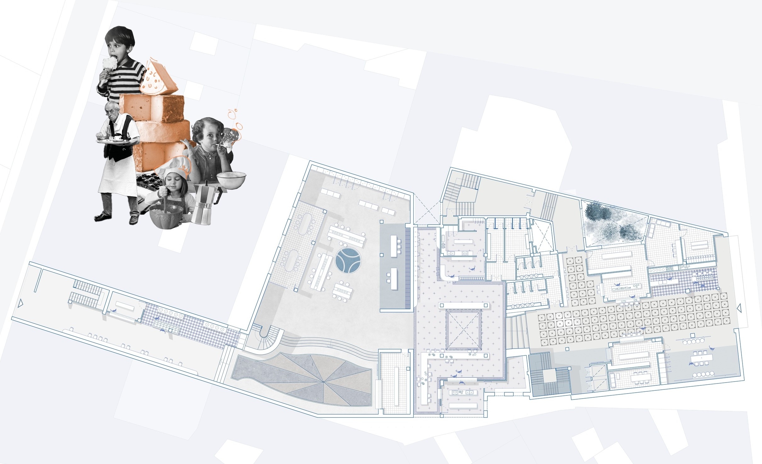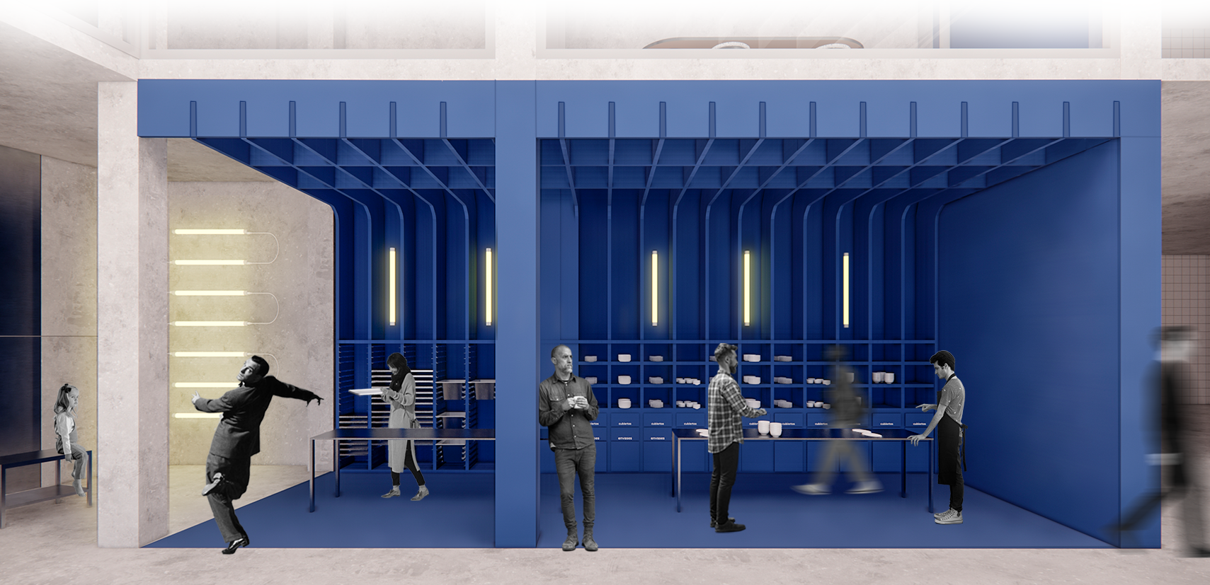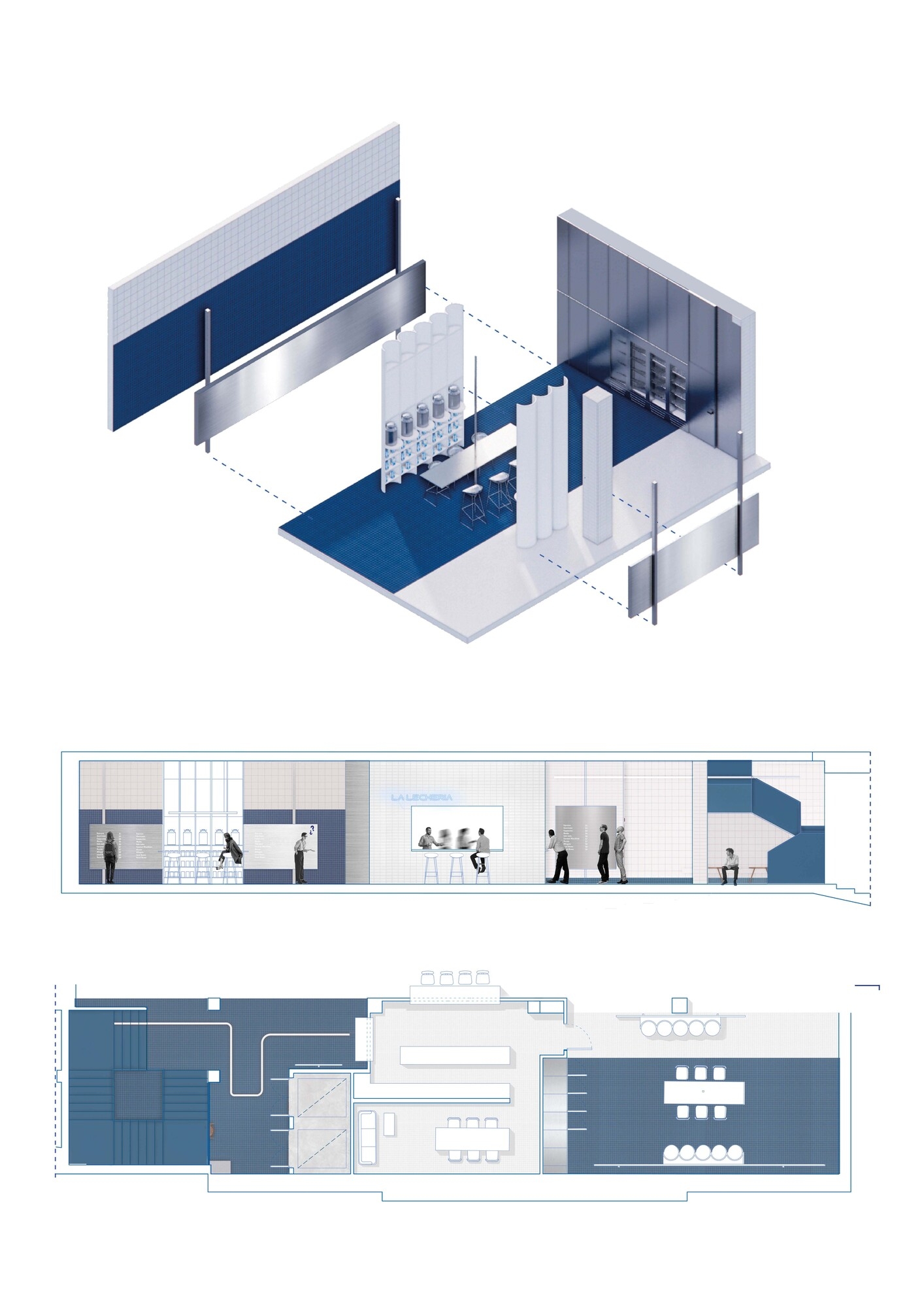 The design of these spaces uses the same materials as in the original premises, but giving them a more contemporary and updated vision. Tiles of different sizes and finishes, the metal that reminds us of milk jugs and the blue colour stand out, making an aseptic and cold space to favour the maintenance of the milk.