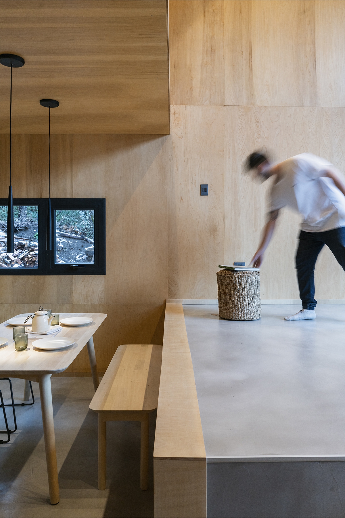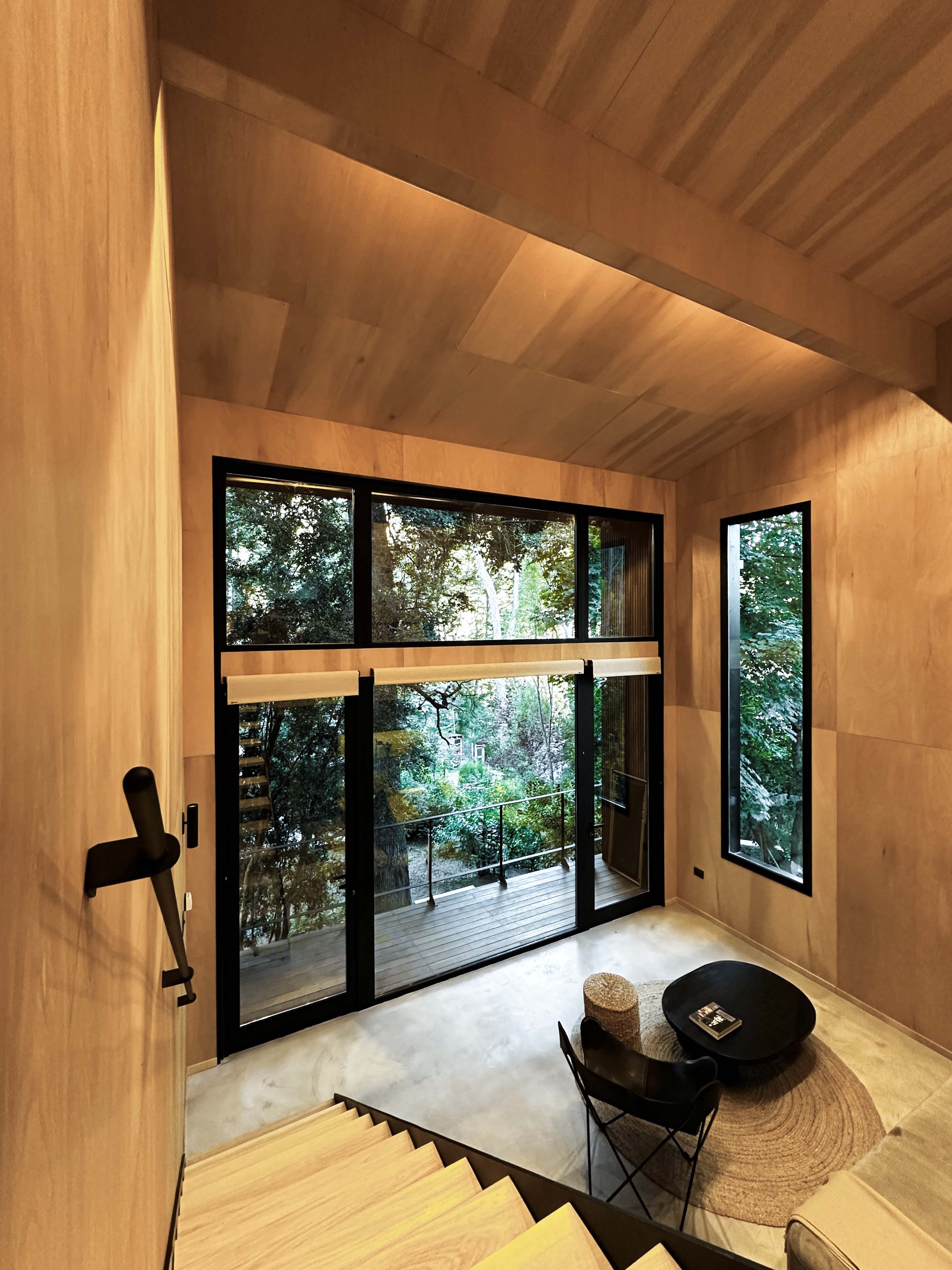 The cabins find their niche within the forest’s vacant spaces, strategically avoiding arboreal vegetation. This strategic placement fulfills the architects’ primary objective: to create an architectural entity that coexists harmoniously with the forest ecosystem, refraining from any intrusive deforestation. The cabins unveil an ingenious spatiality, luring inhabitants to experience the enchantment of melting boundaries between interior and forest, all within a compact footprint.