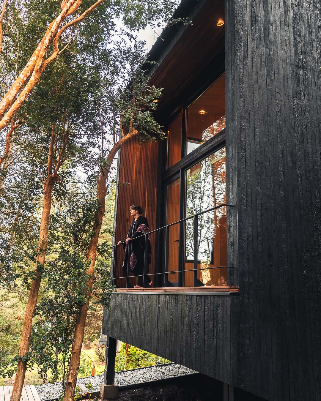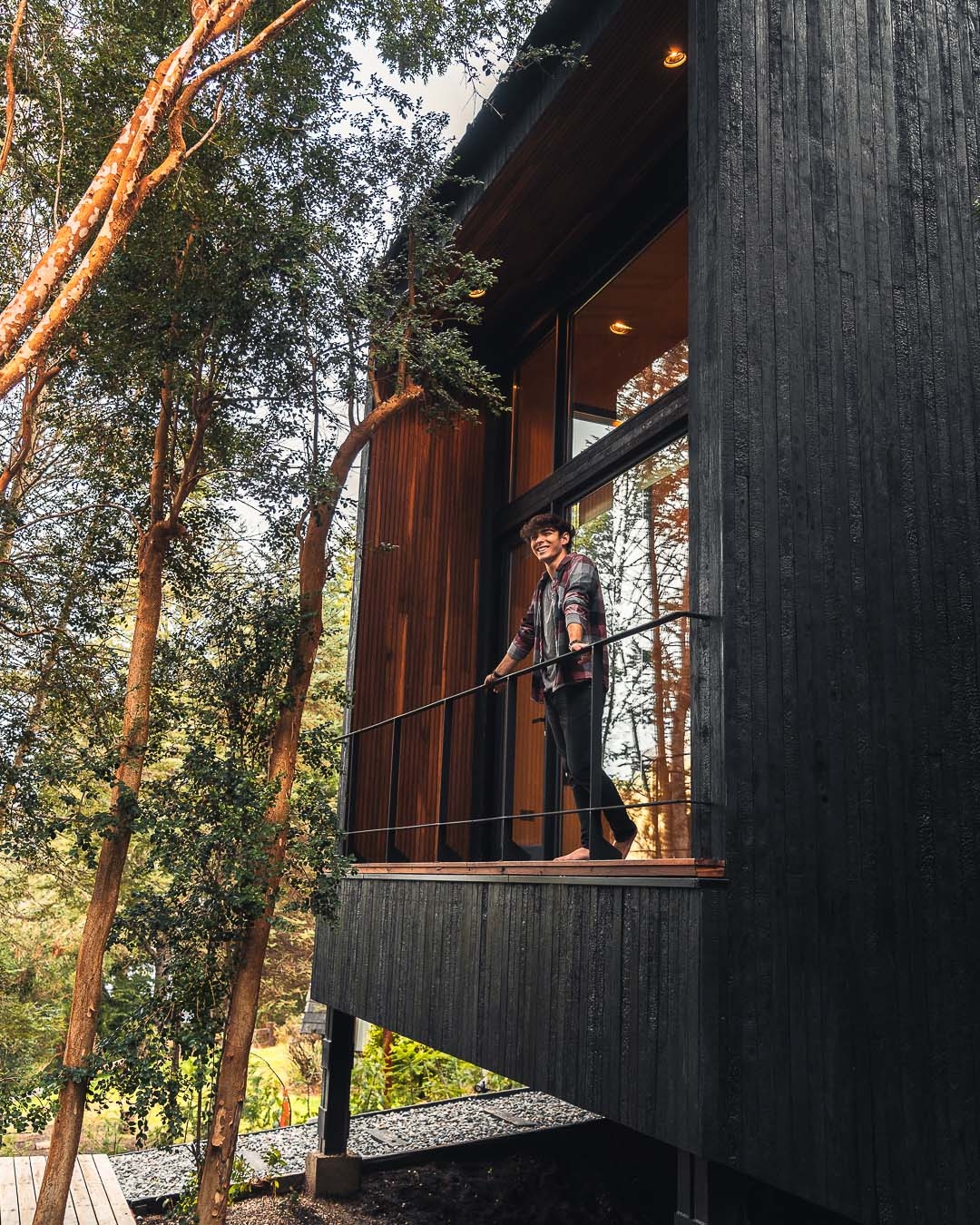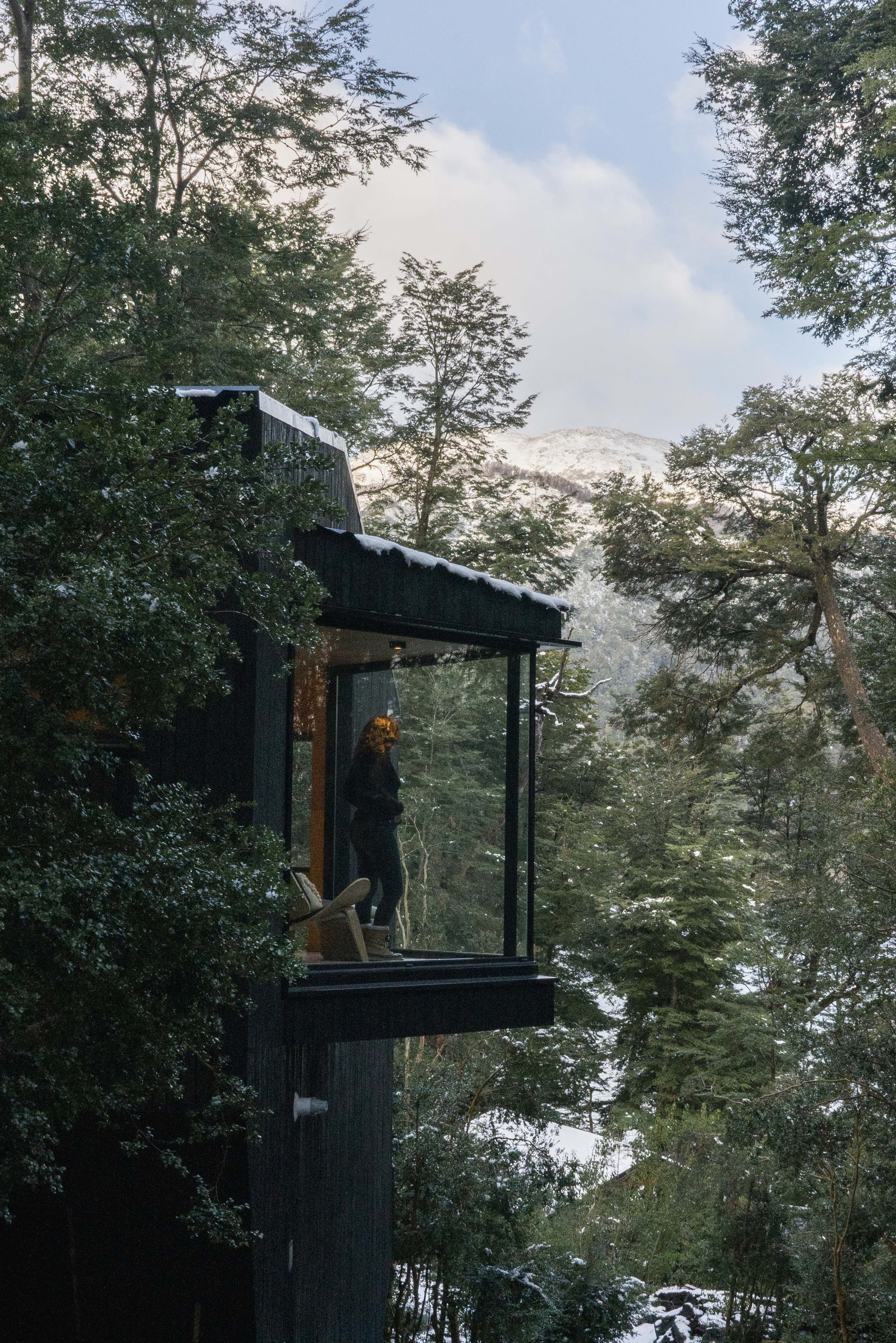 Monolithic cabins of charred eucalyptus wood are scattered among one of Patagonia´s most unique Arrayanes forest.
