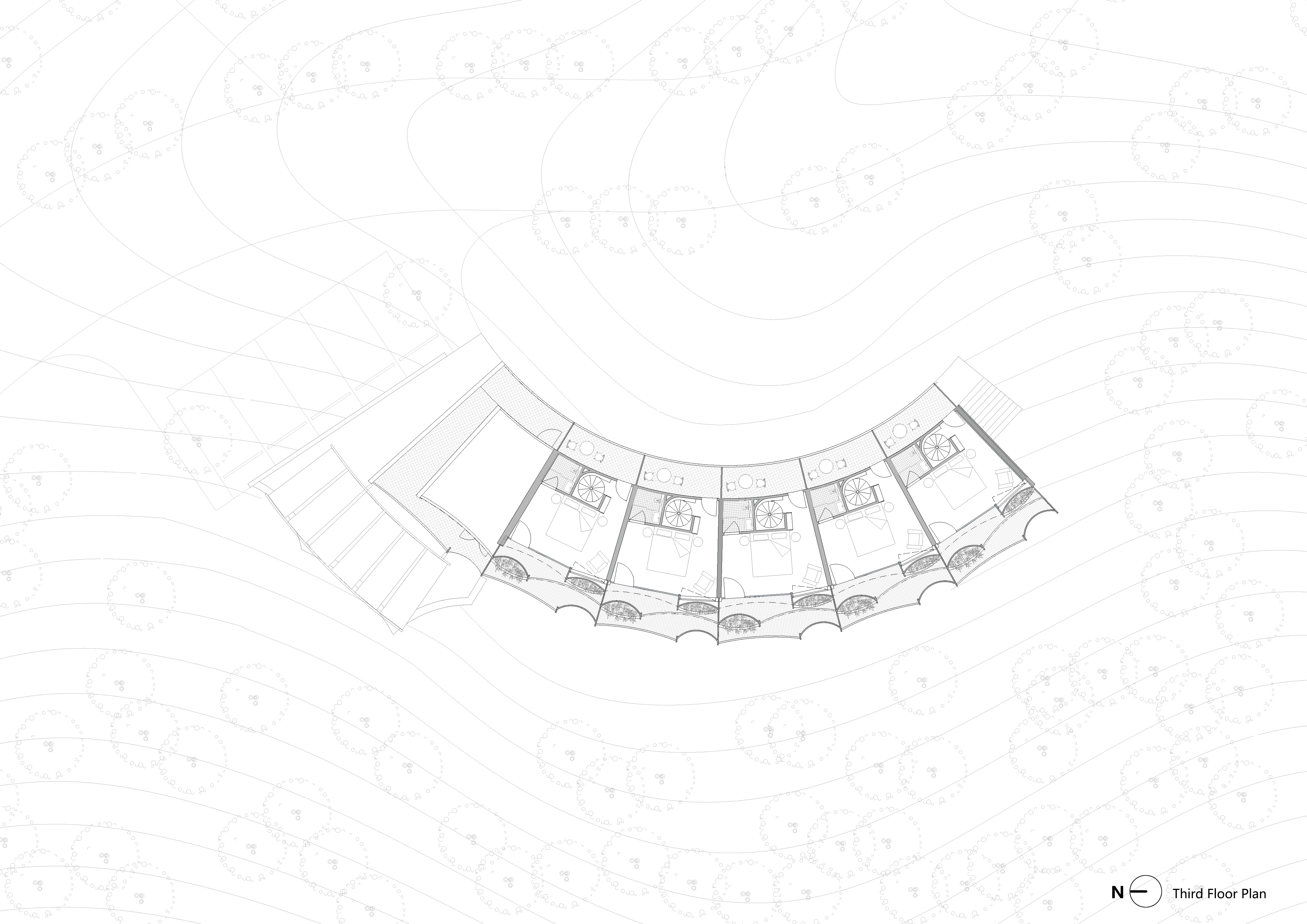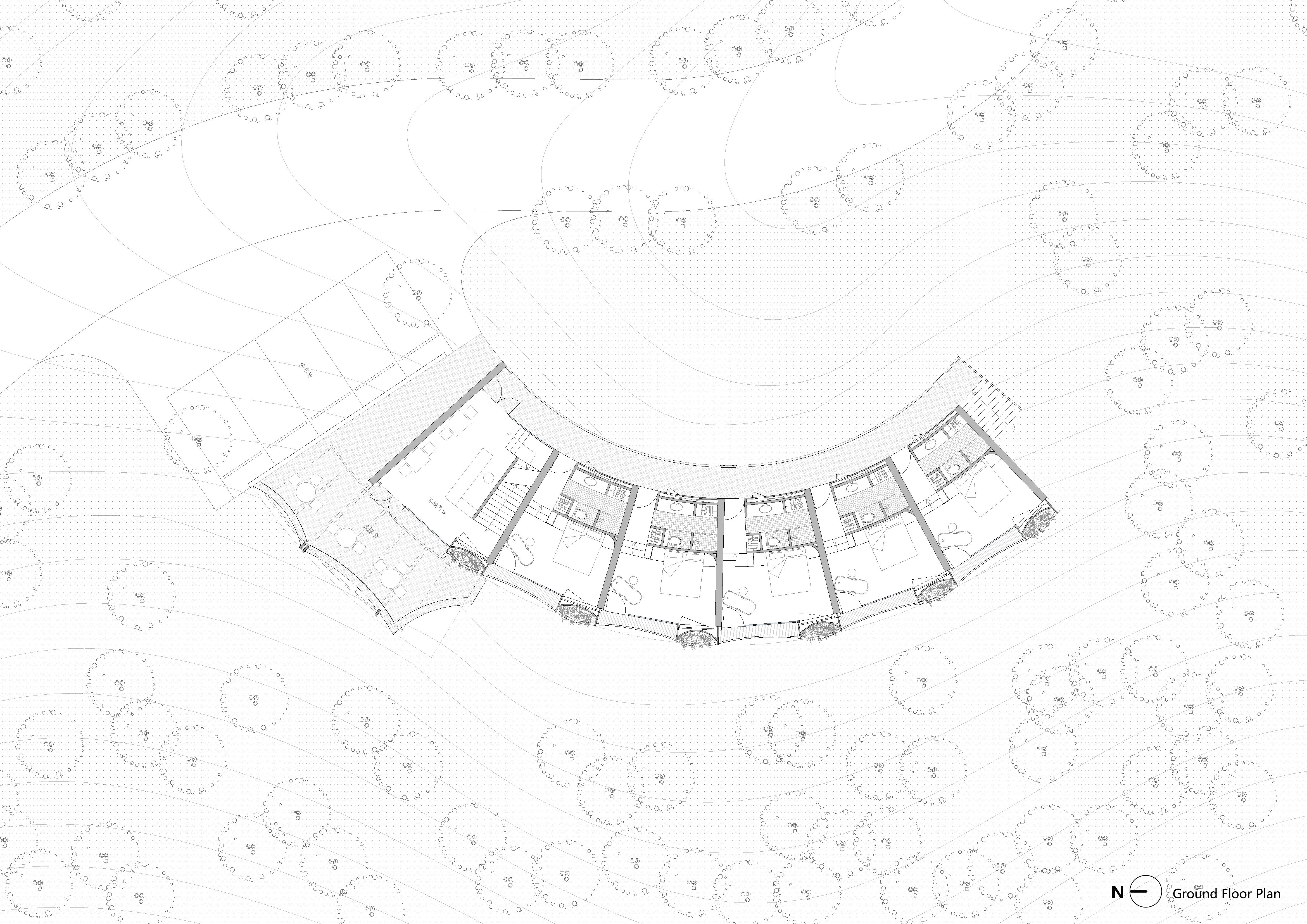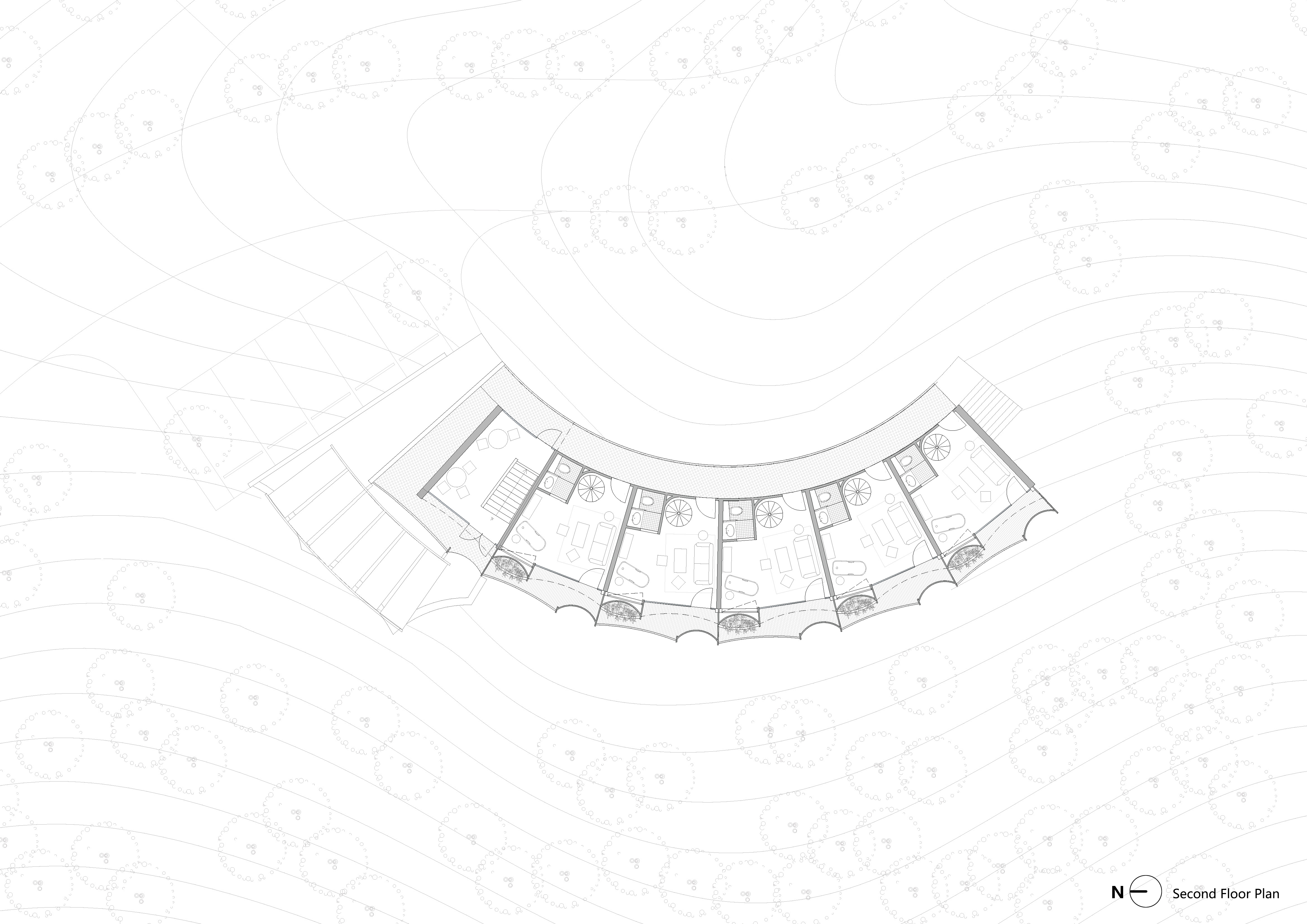 The architecture embraces the natural landscape through a terraced layout, seamlessly adapting to the slope. This design creates tiered terraces for guests to engage with the surroundings. The fan-shaped, west-facing configuration ensures every room captures breathtaking mountain sunsets, offering a tranquil and contemplative atmosphere.