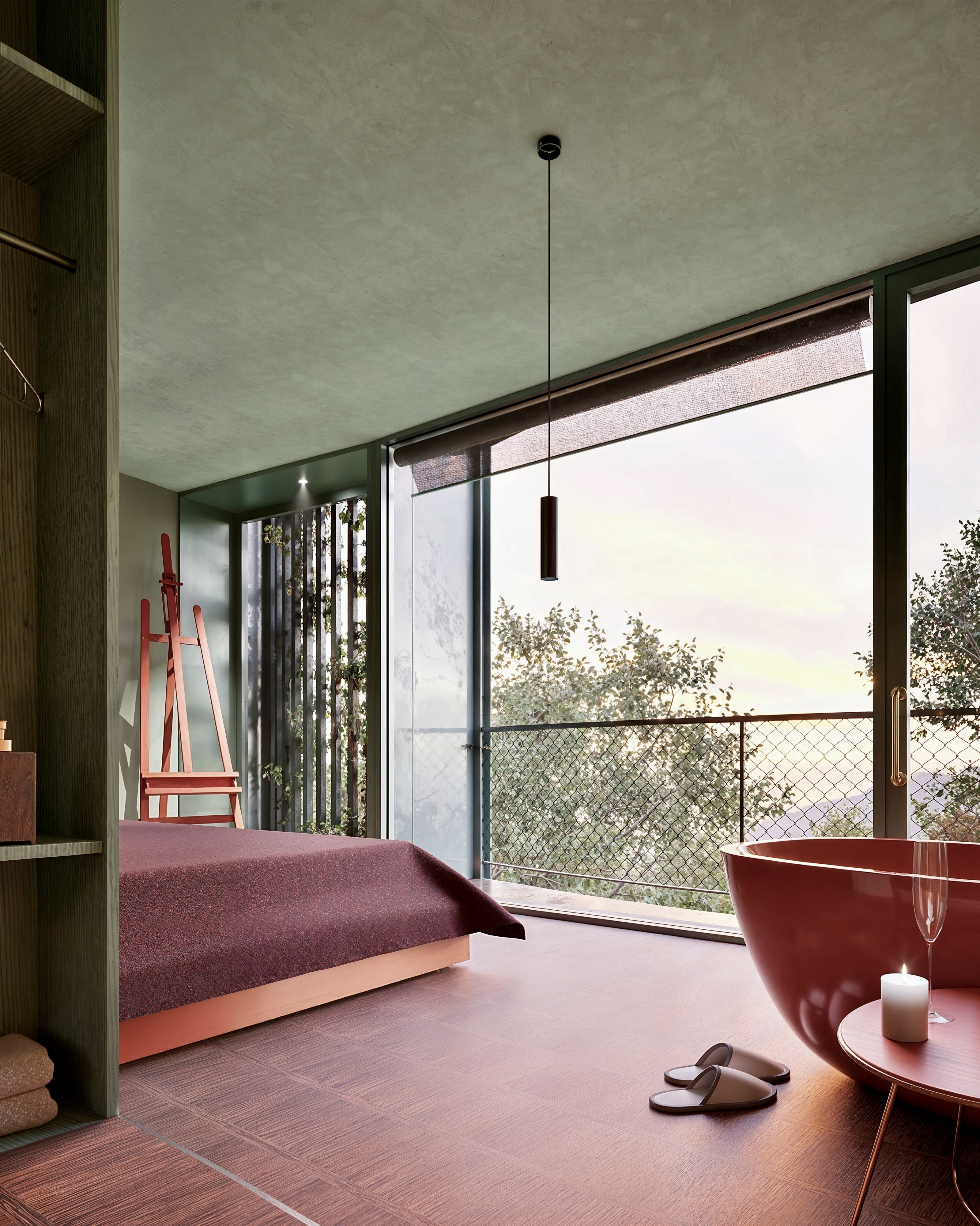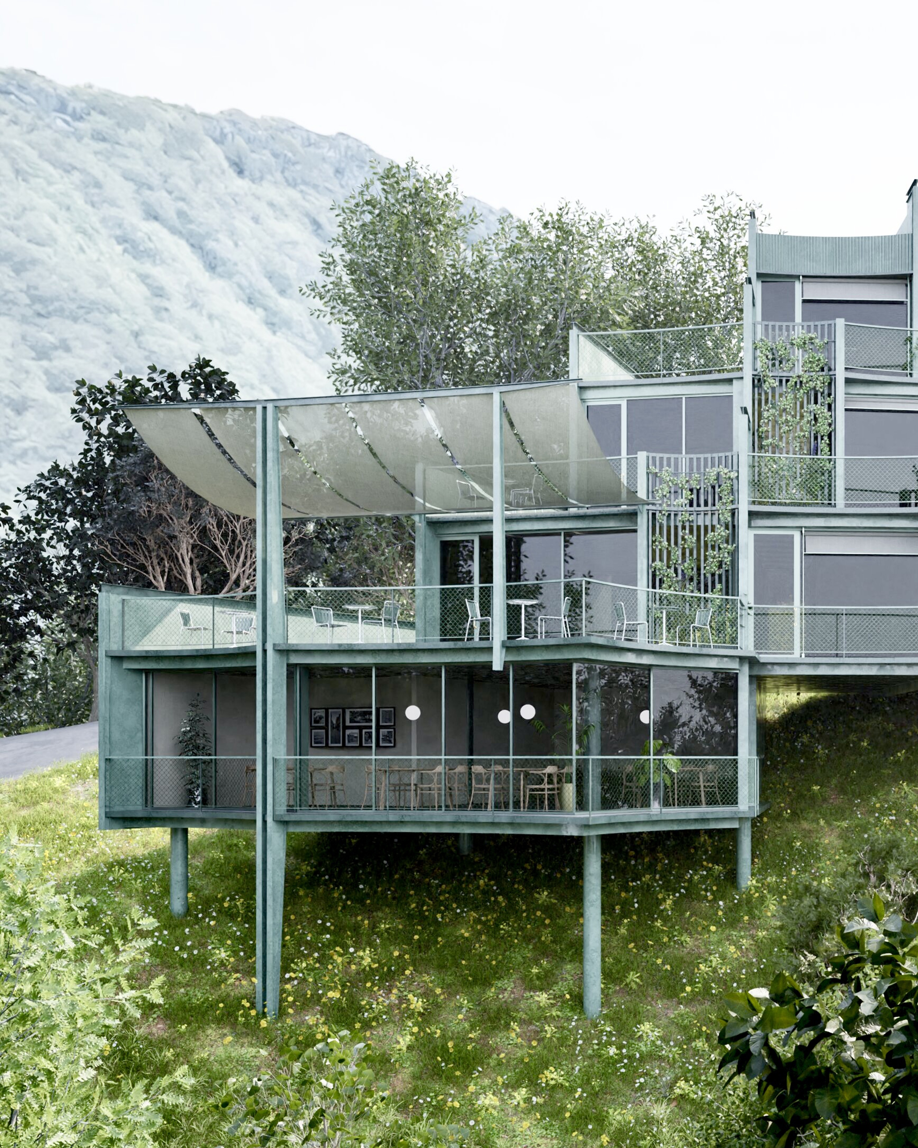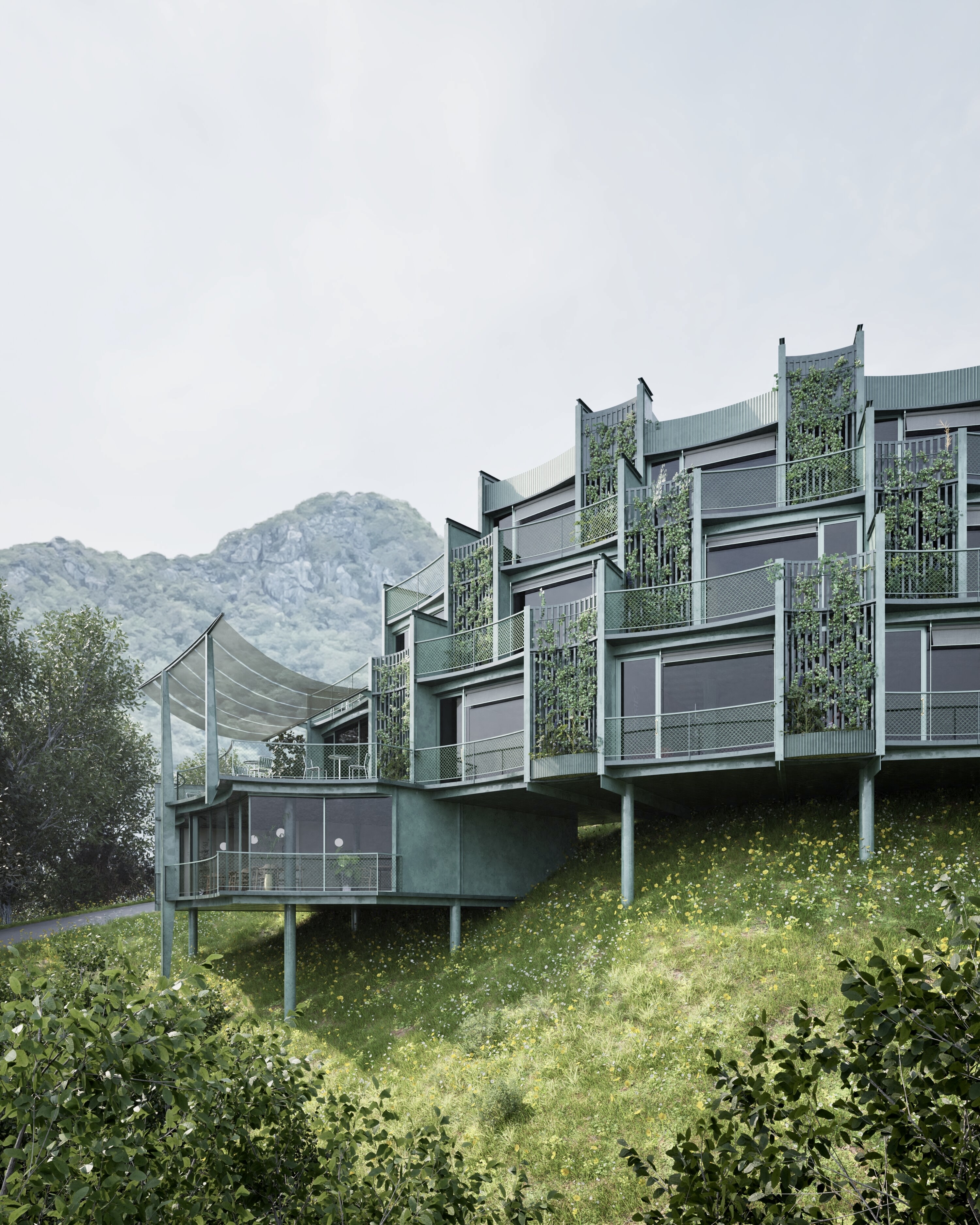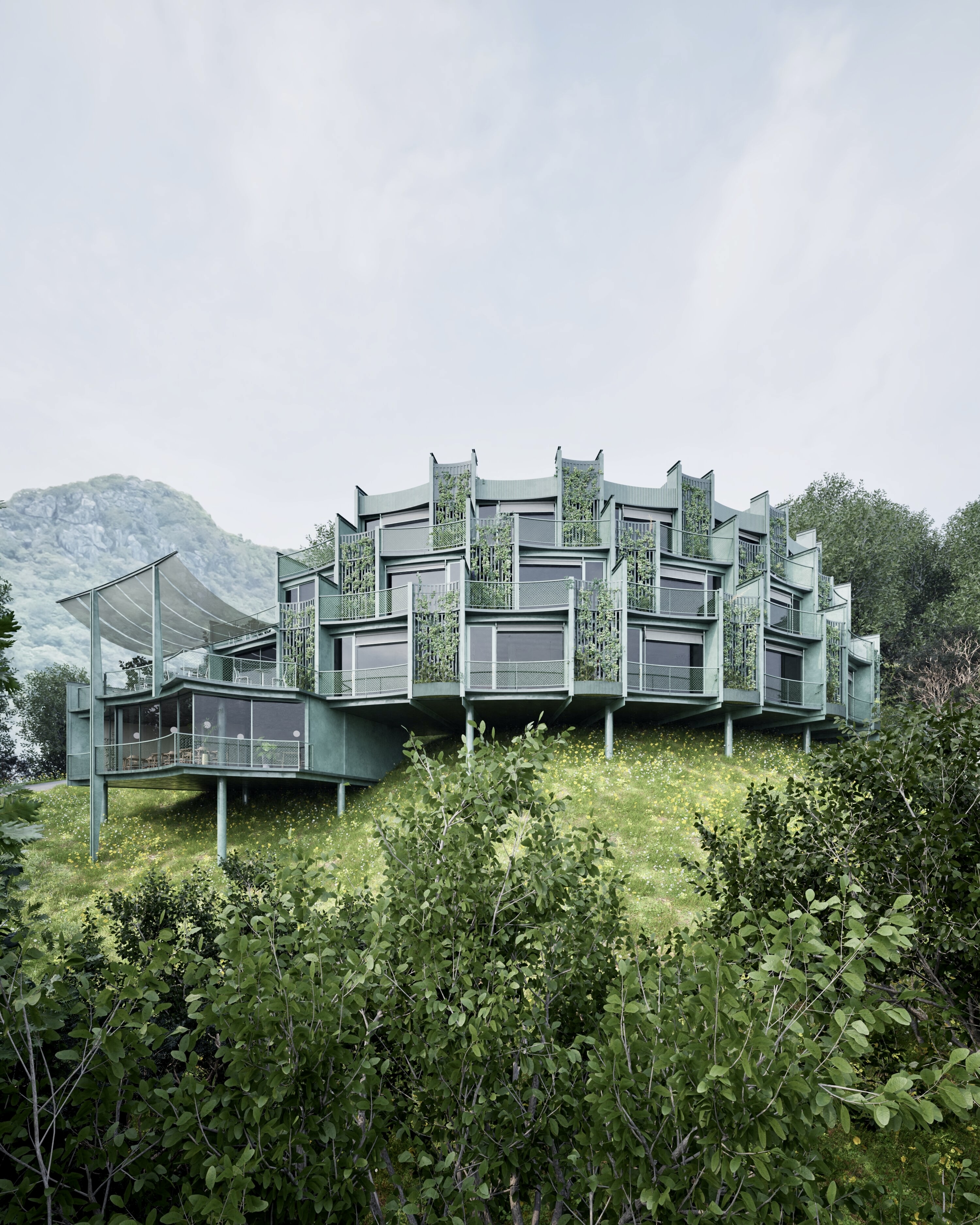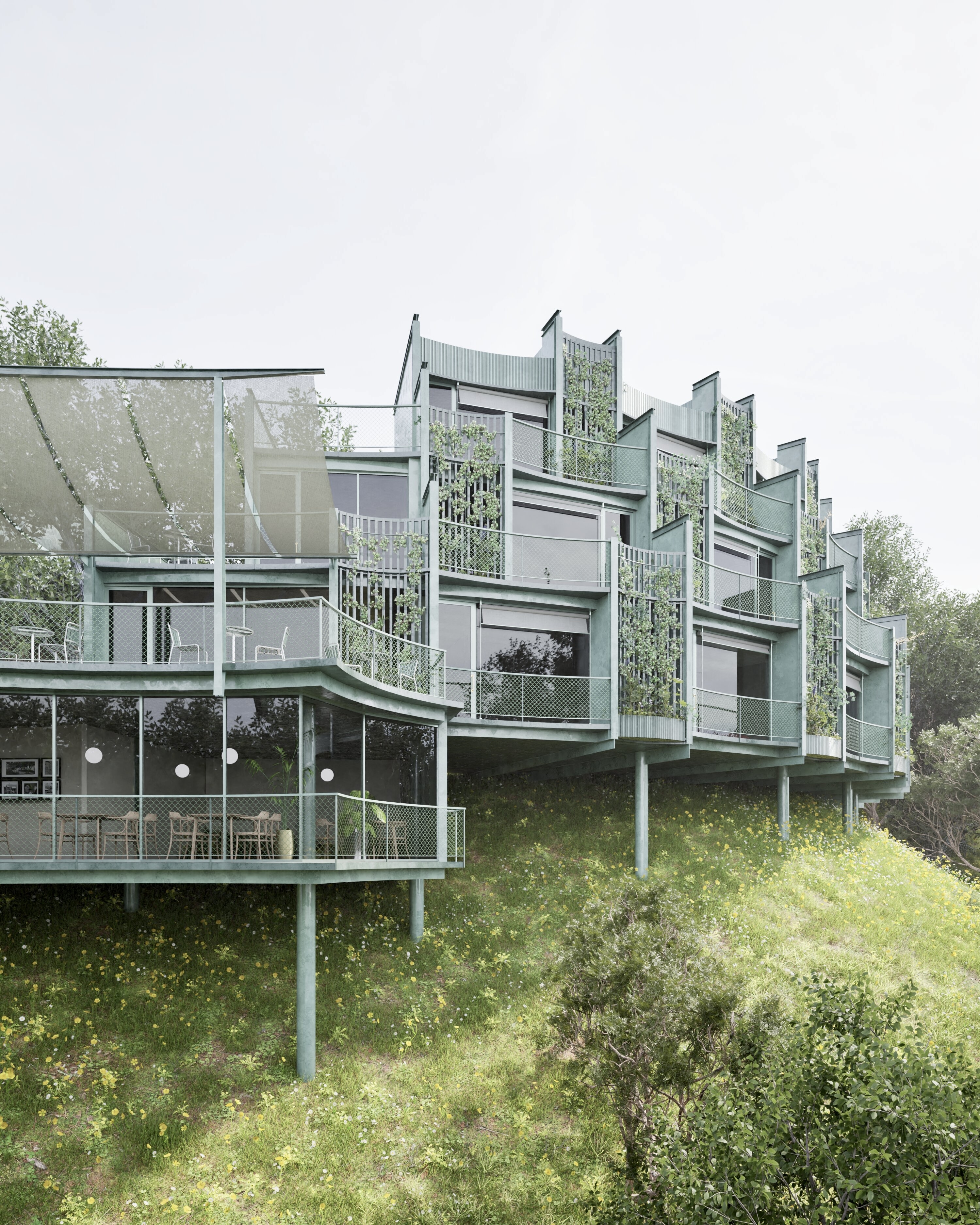 Over time, climbing plants and green exterior hues will merge the building with its natural environment, reflecting a commitment to sustainability and harmony.