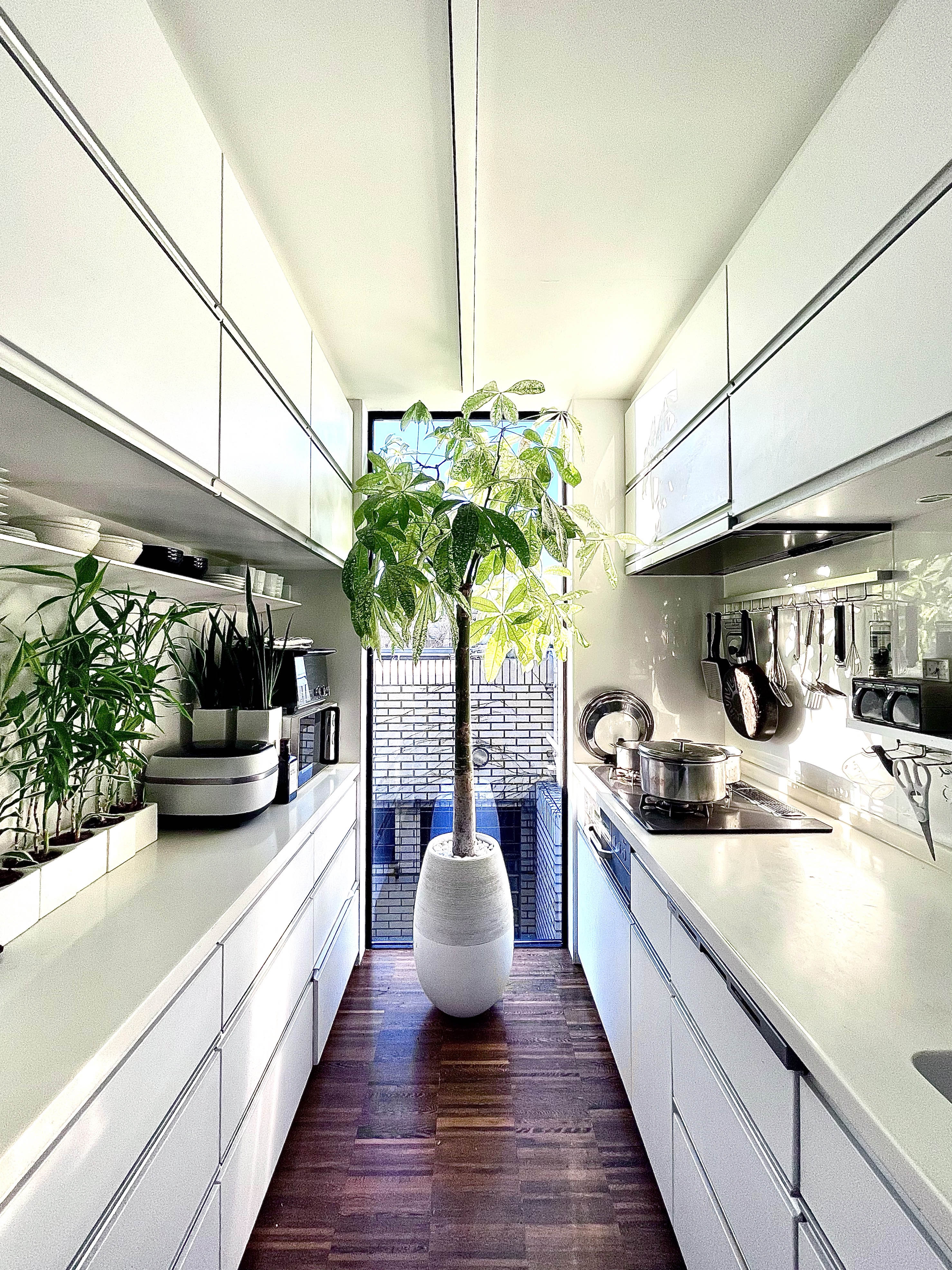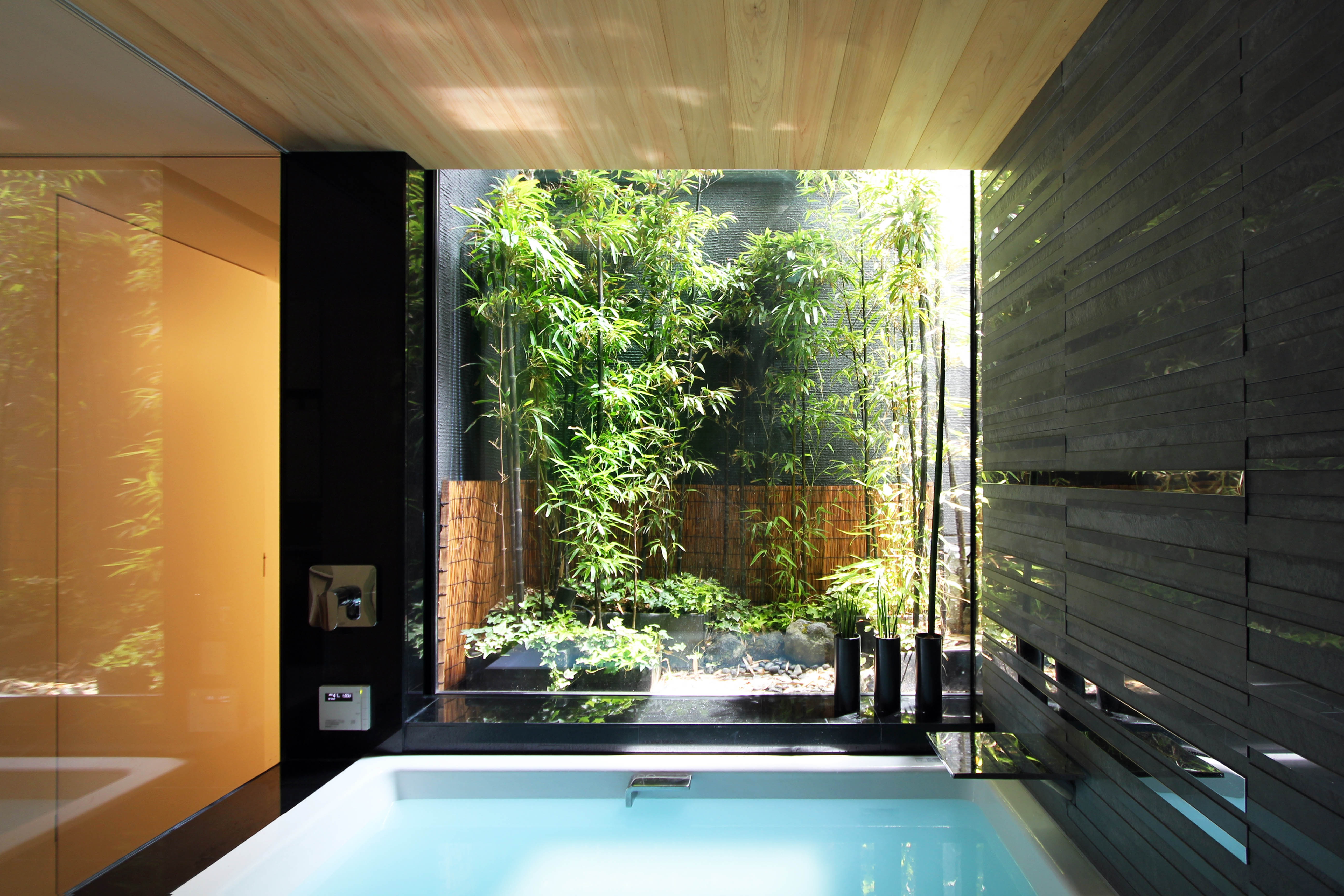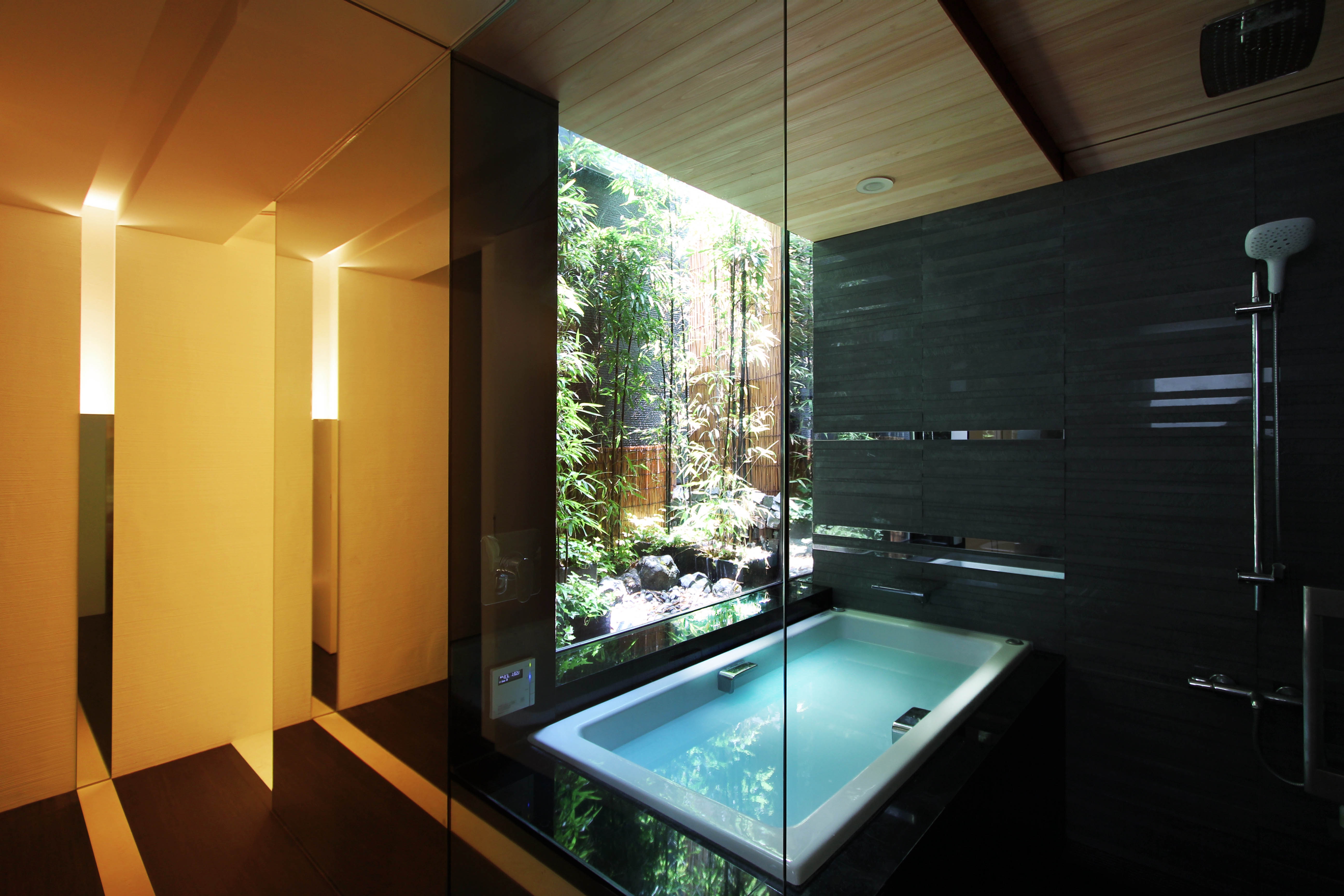 The semi-basement first floor houses private spaces, including a serene master bedroom, studio, and spa-like bathroom with a jetted tub overlooking a tranquil tsubo-niwa courtyard garden. This meticulously designed light-filled centerpiece enhances natural airflow and brings nature into daily life, creating a calming oasis of relaxation and an inviting ambiance.