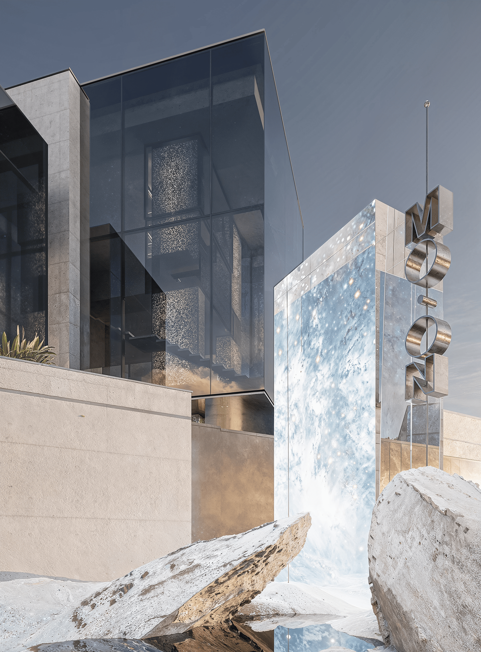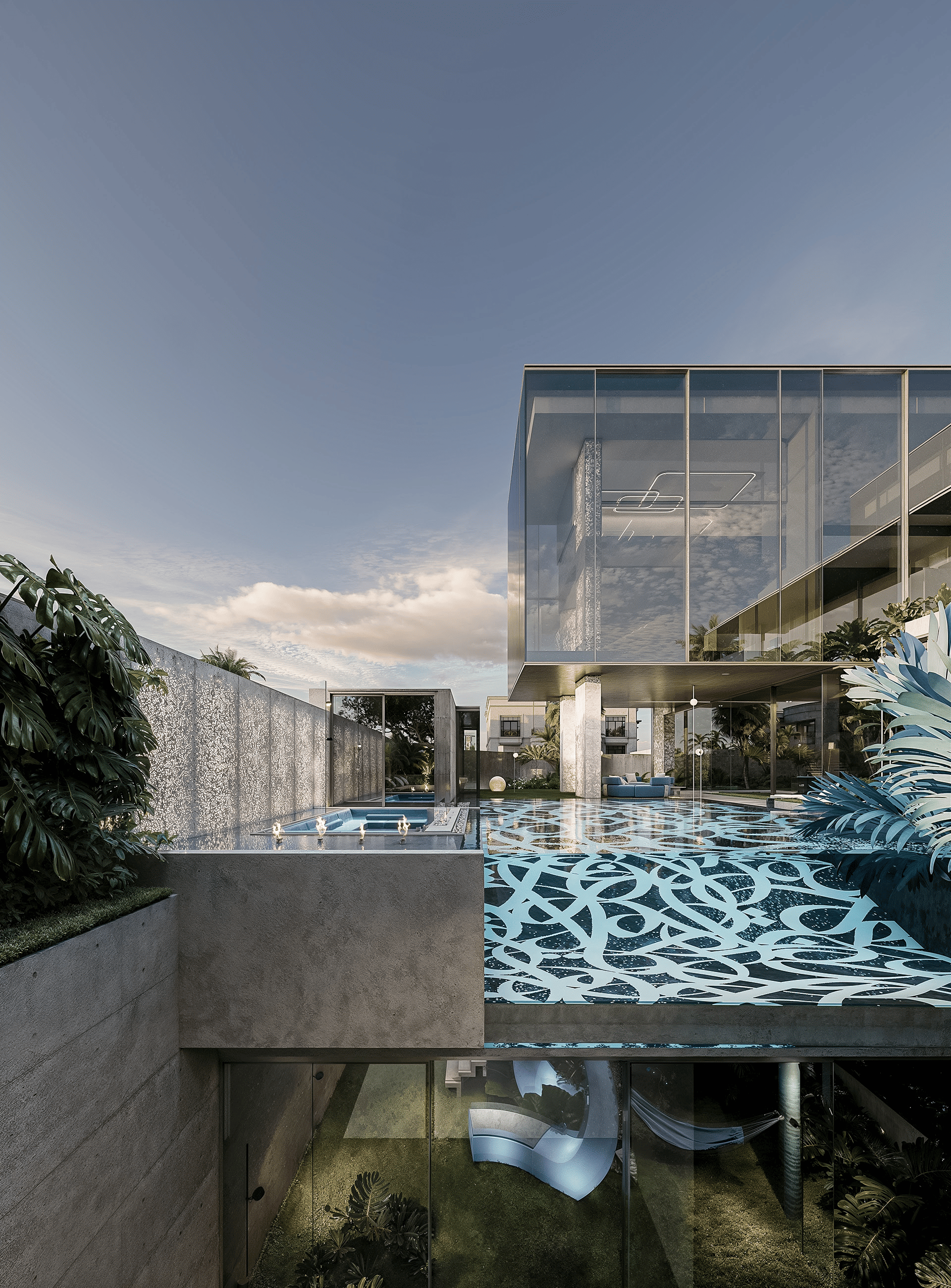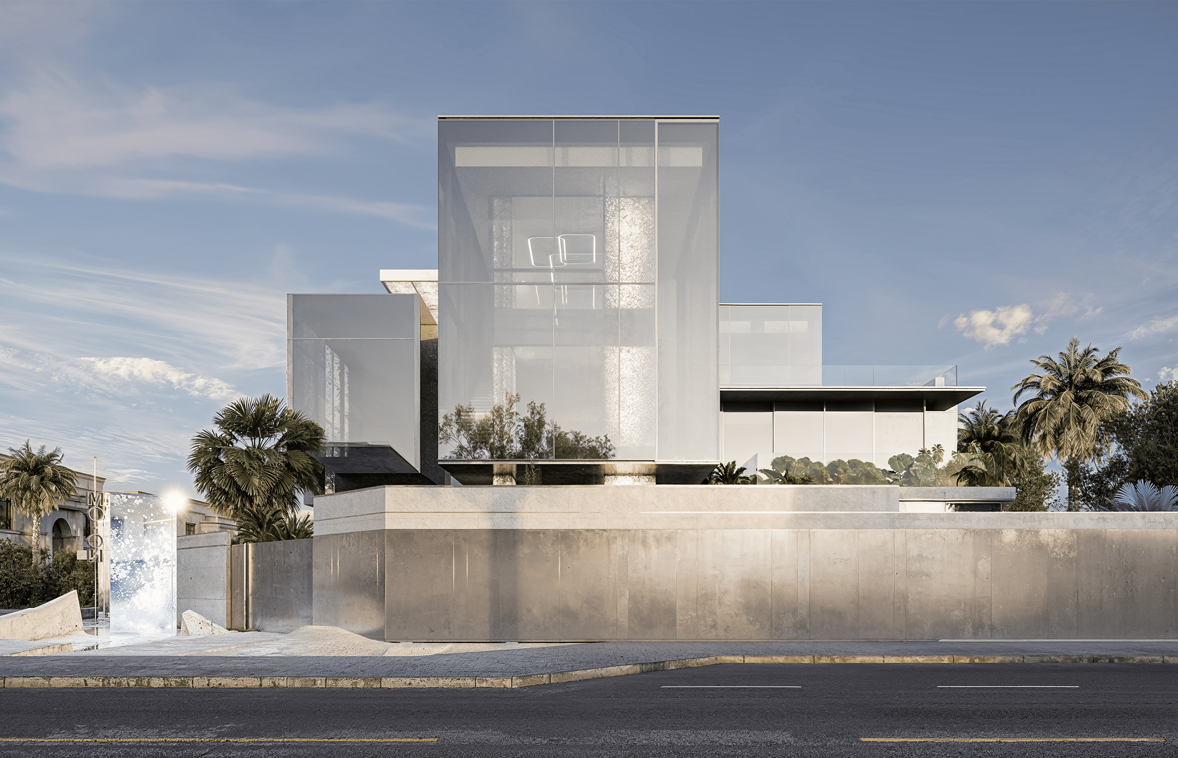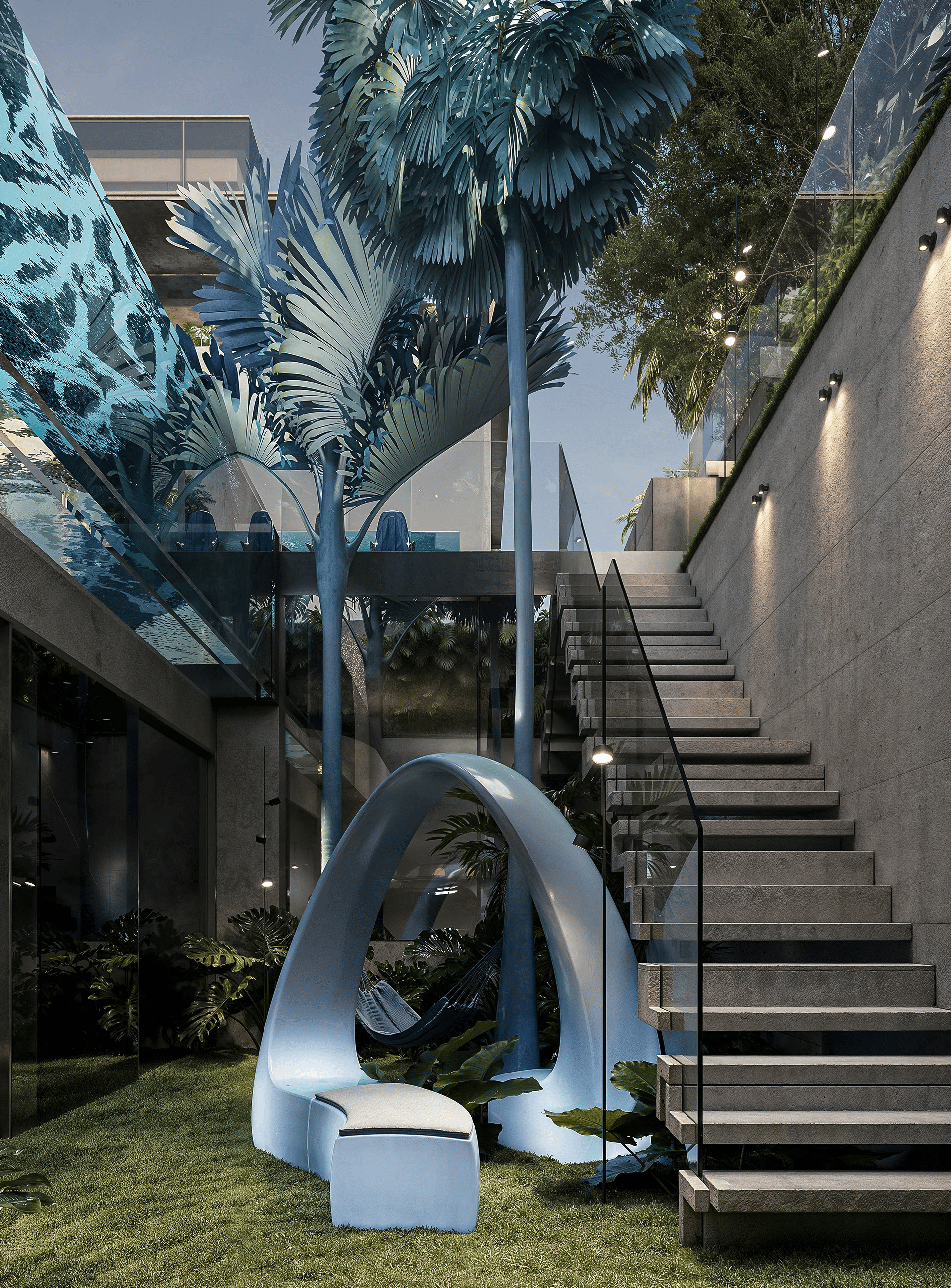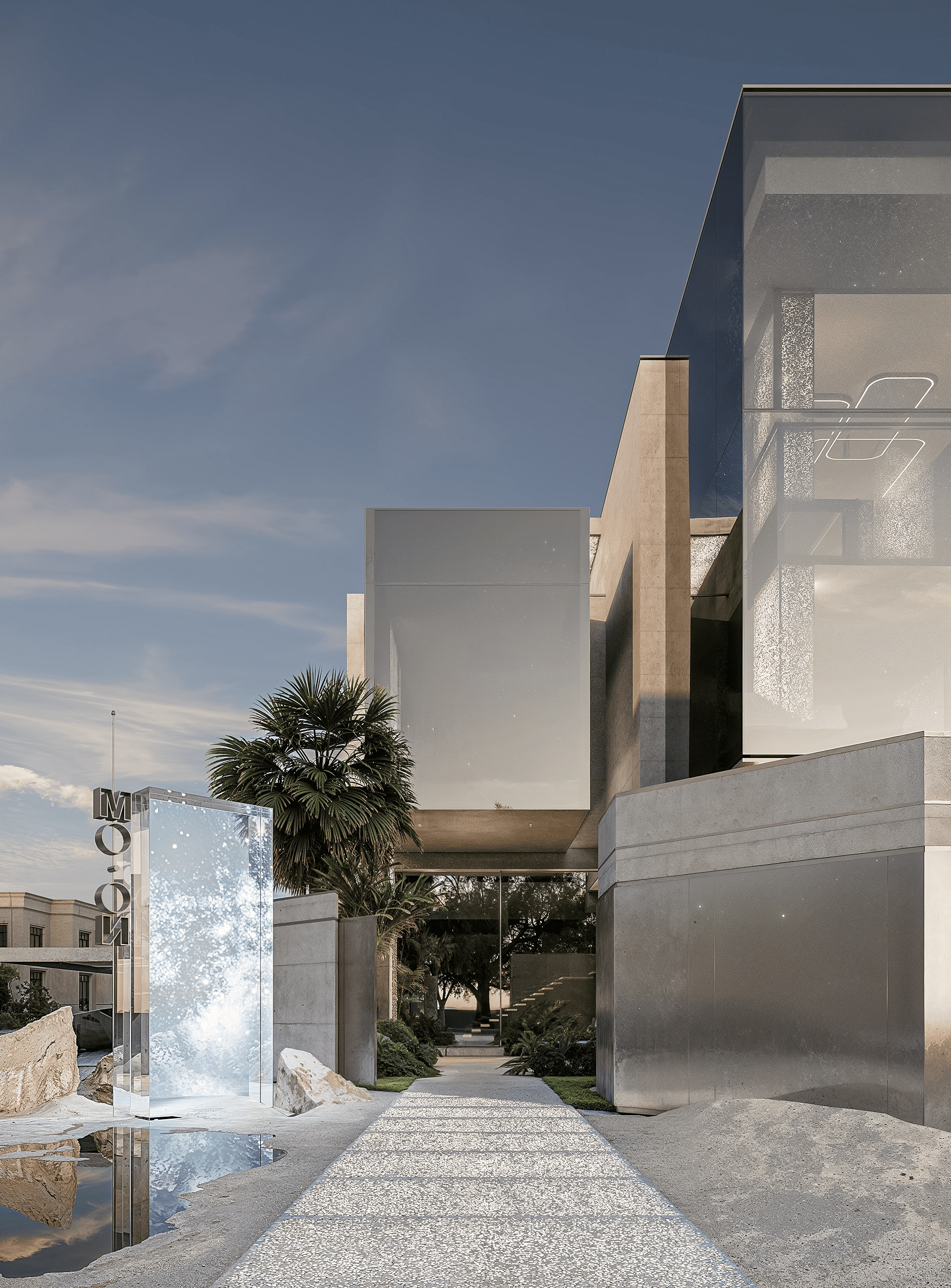 Moon’s outstanding feature is a glass cube within a glass cube. It is a double-high space with a glass facade wall. A double-high space, resembling a long balcony, is bordered by the master bedroom on the rooftop floor to the lounge area on the ground floor. The master bedroom’s and lounge area's walls are of glass as well, so the client can easily look down on the lounge area from a bedroom thankfully to the double-high, as well as have a huge panoramic view of the futuristic city of Dubai.