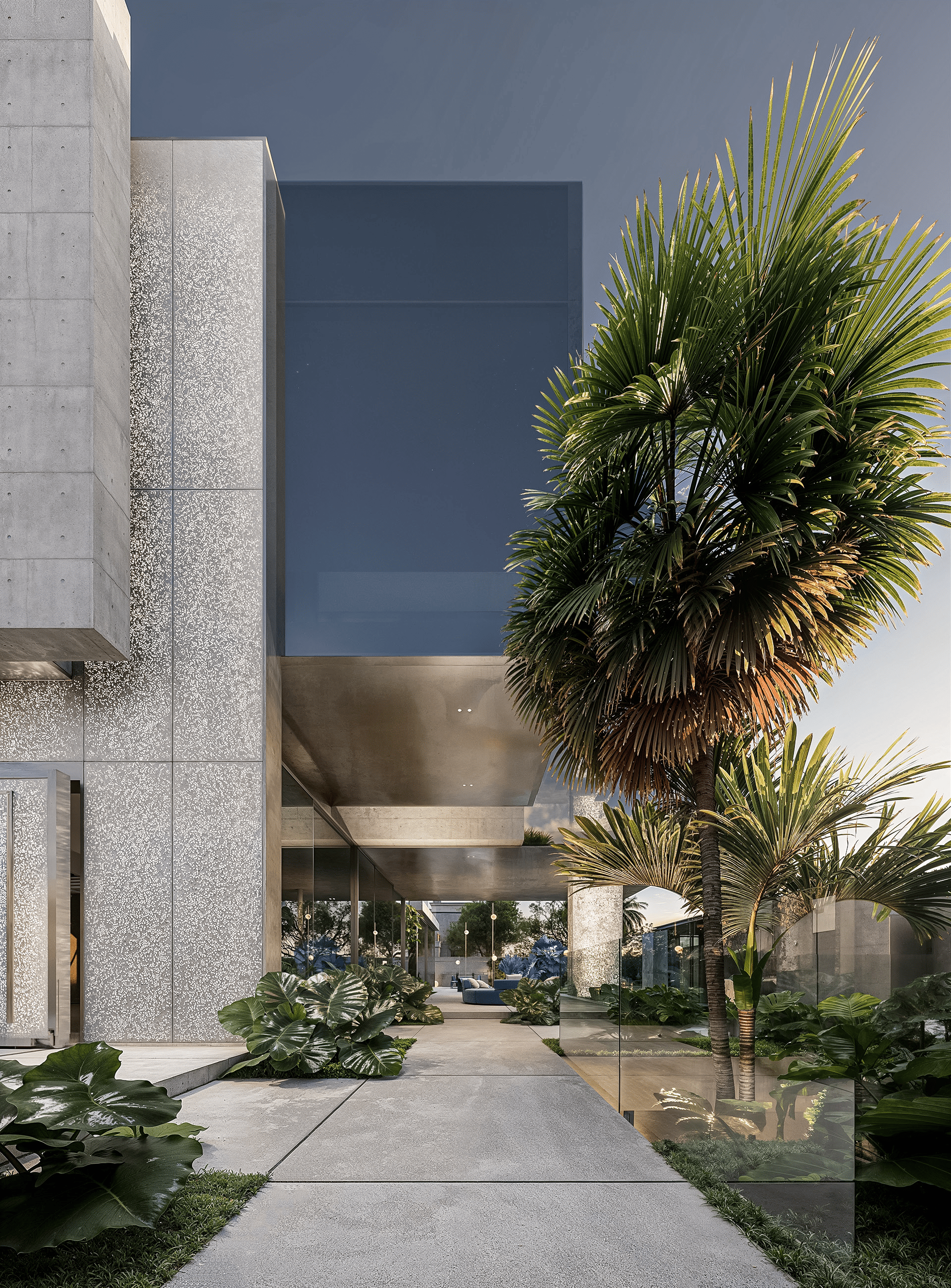 Glass, metal, LiTraCon, concrete materials are dominant. LiTraCon is a light-transmitting concrete that allows light to pass through solid concrete, thanks to the incorporation of optical fibers. It enables the material to transmit light from one side of the block to the other, making it translucent.
