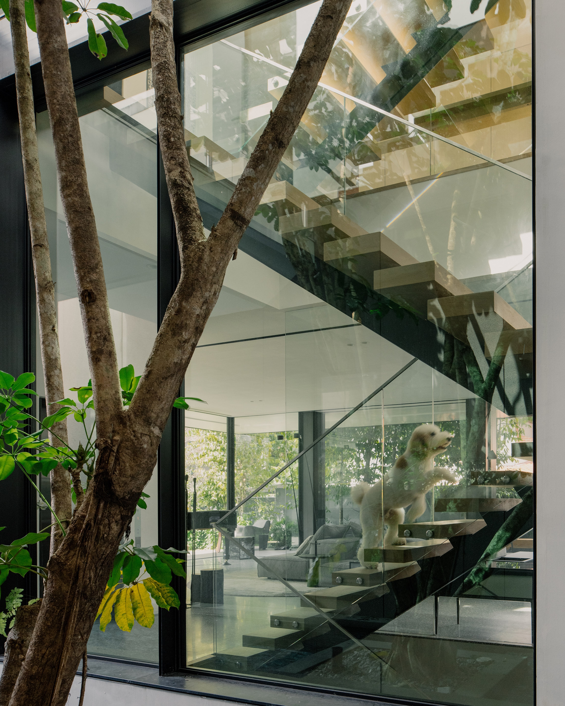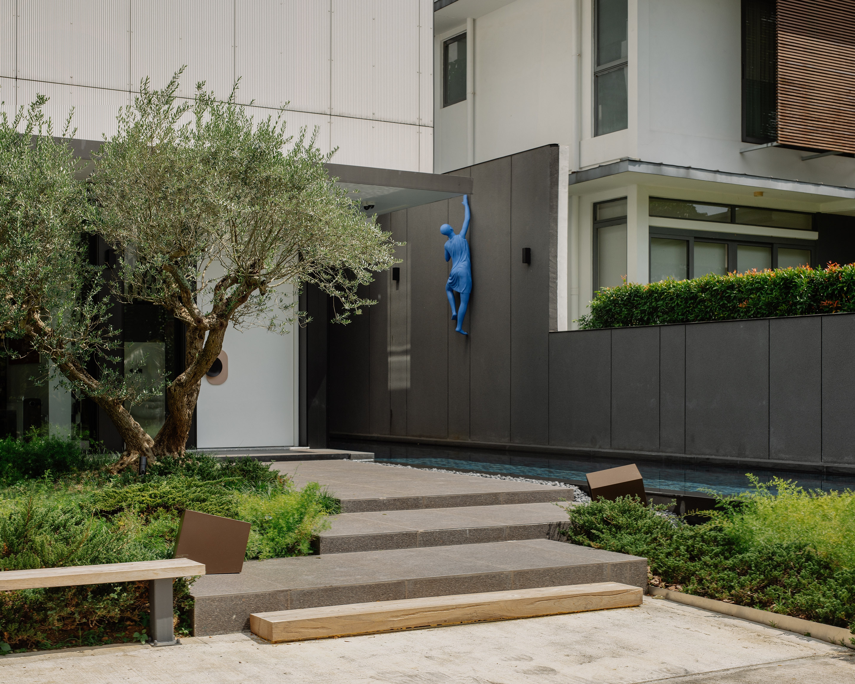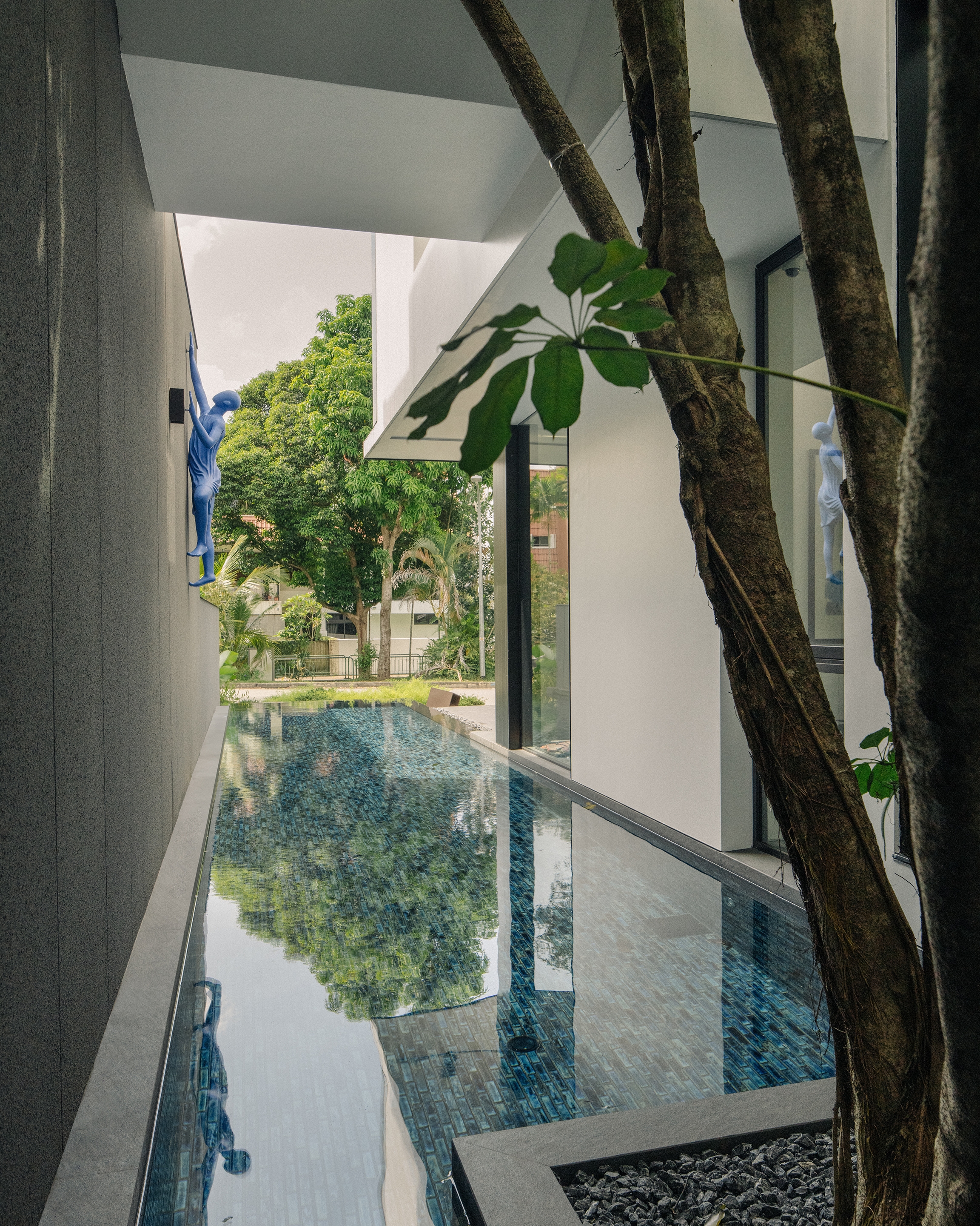 In a departure from the norm, this house reimagines the concept of a traditional semi-detached house. The design prioritises openness and a seamless connection with the surrounding landscape. Eschewing a conventional front boundary wall, a more open approach is featured with landscaping fostering a sense of openness and breathability. The exterior design features stacked volumes subtly shifted to create a dynamic composition. Expansive glass panels create an effect of a floating mass, emphasizing the interplay of light and openness. The contrasting materials used on the exterior echo the interior palette, tying the design together. The design achieves a sense of spaciousness that rivals a detached house. The ground floor features open-plan living spaces that flow effortlessly to the outdoor deck, creating a welcoming space for gatherings. This fosters true indoor-outdoor living, further enhanced by the abundance of natural light. Every room in the house including the stair, is designed to receive natural light, creating a bright and airy atmosphere while having a view to the landscape and pool.