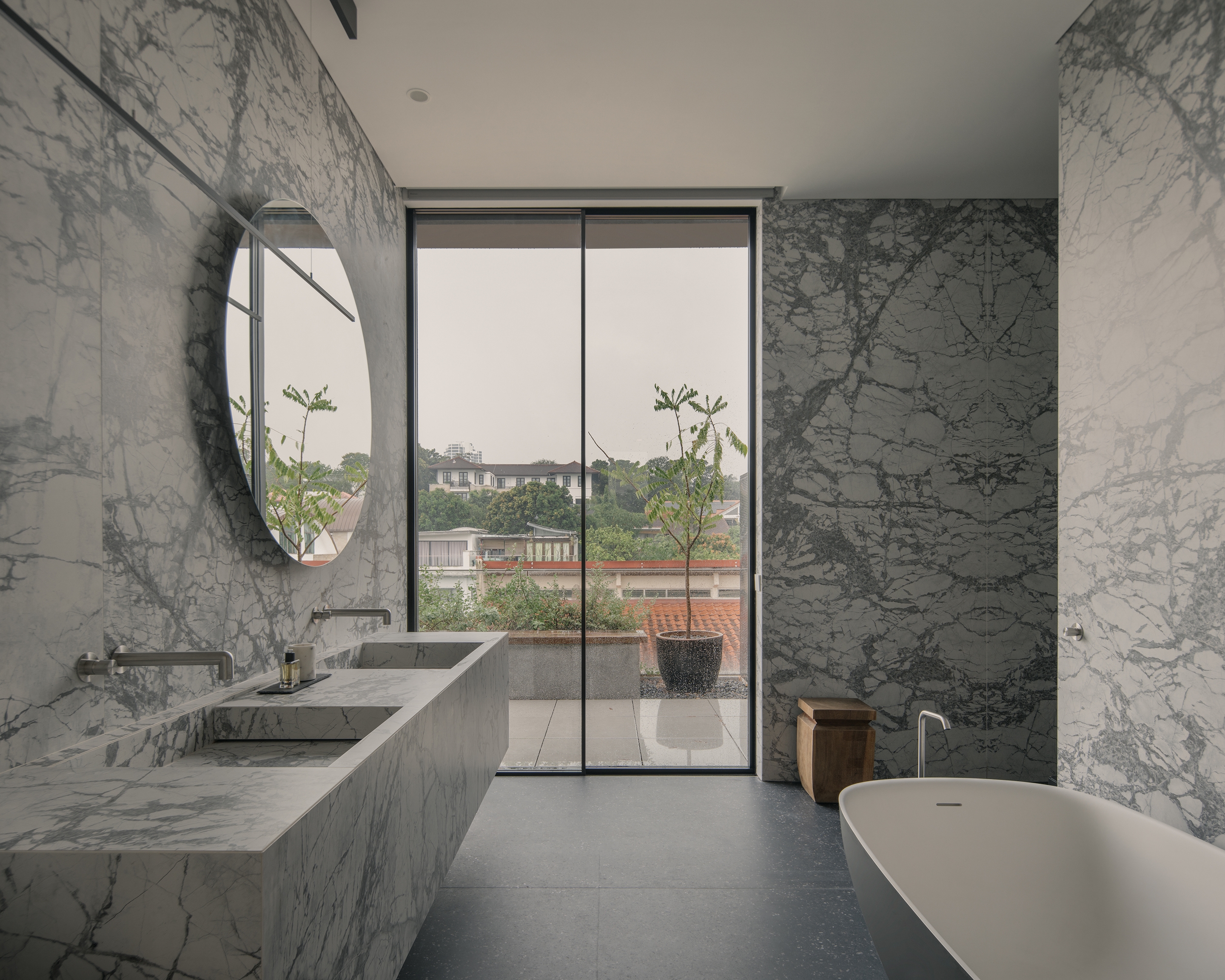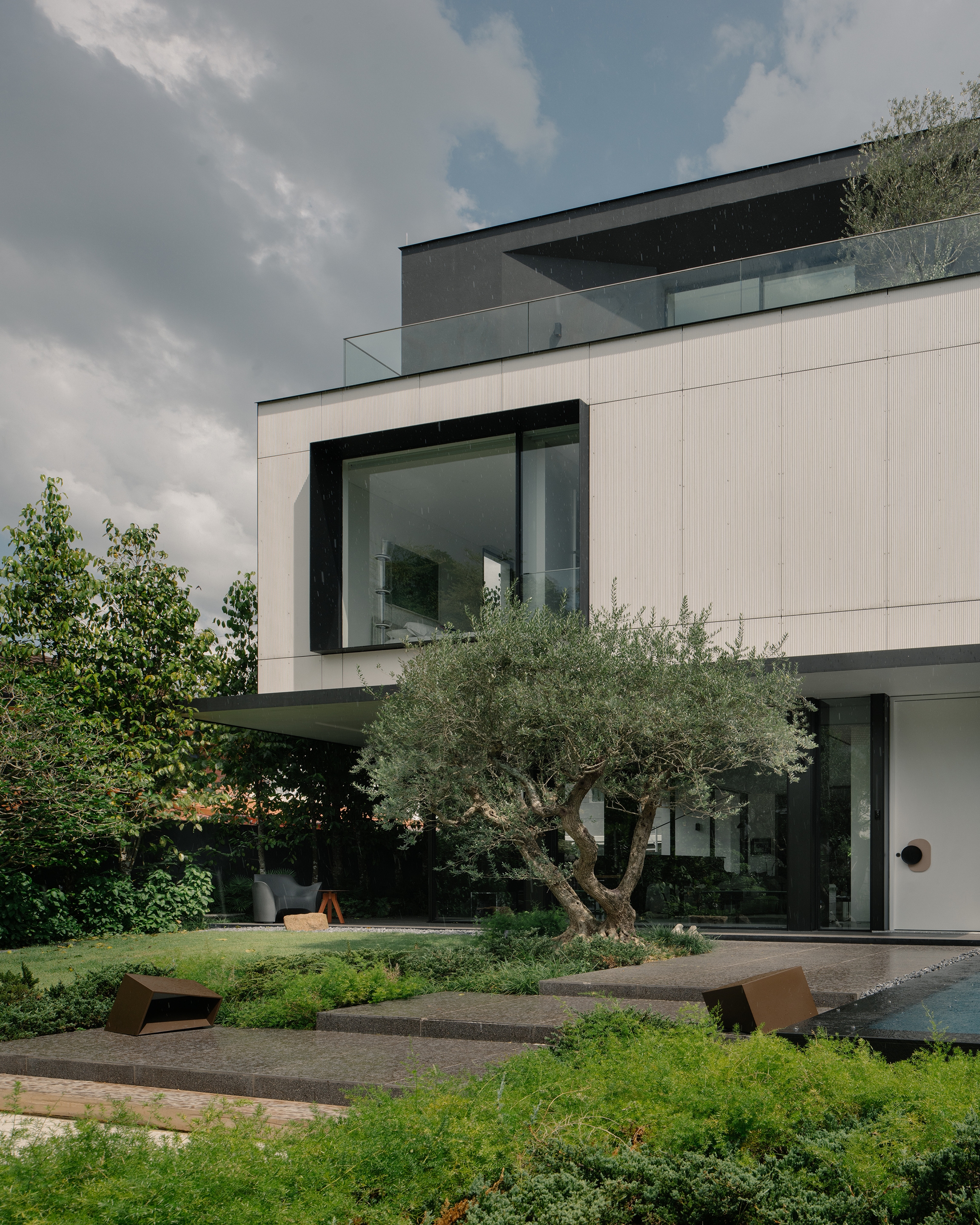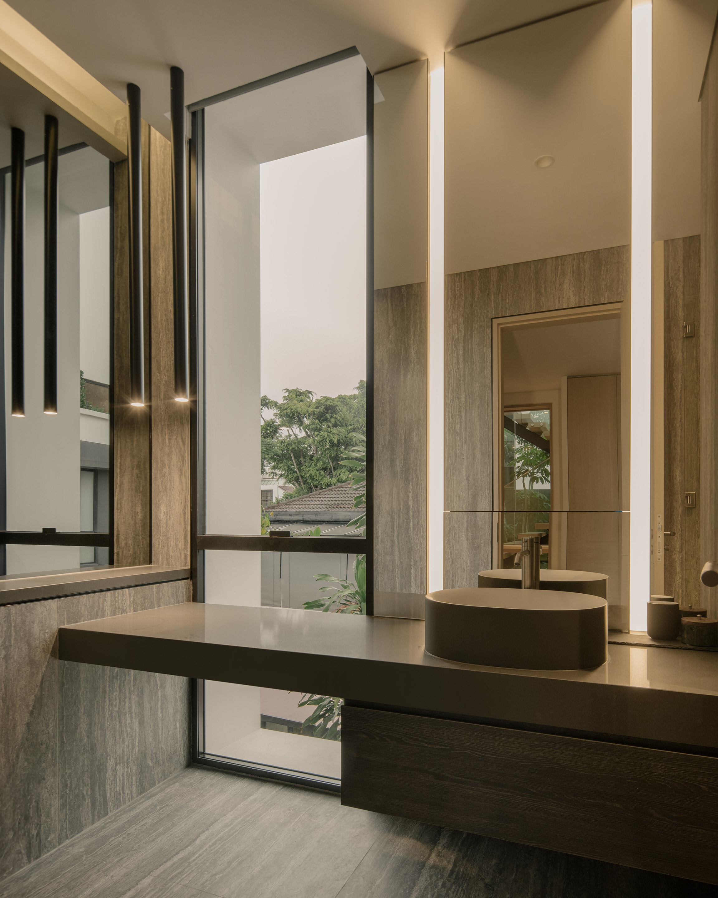 In a departure from the norm, this house reimagines the concept of a traditional semi-detached house. The design prioritises openness and a seamless connection with the surrounding landscape. Eschewing a conventional front boundary wall, a more open approach is featured with landscaping fostering a sense of openness and breathability. The exterior design features stacked volumes subtly shifted to create a dynamic composition. Expansive glass panels create an effect of a floating mass, emphasizing the interplay of light and openness. The contrasting materials used on the exterior echo the interior palette, tying the design together. The design achieves a sense of spaciousness that rivals a detached house. The ground floor features open-plan living spaces that flow effortlessly to the outdoor deck, creating a welcoming space for gatherings. This fosters true indoor-outdoor living, further enhanced by the abundance of natural light. Every room in the house including the stair, is designed to receive natural light, creating a bright and airy atmosphere while having a view to the landscape and pool.