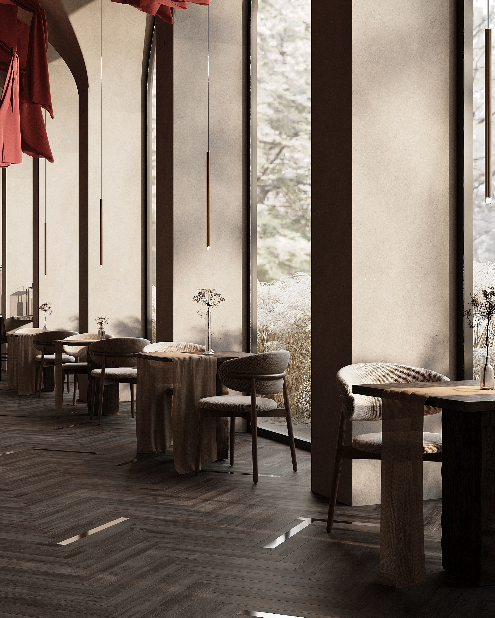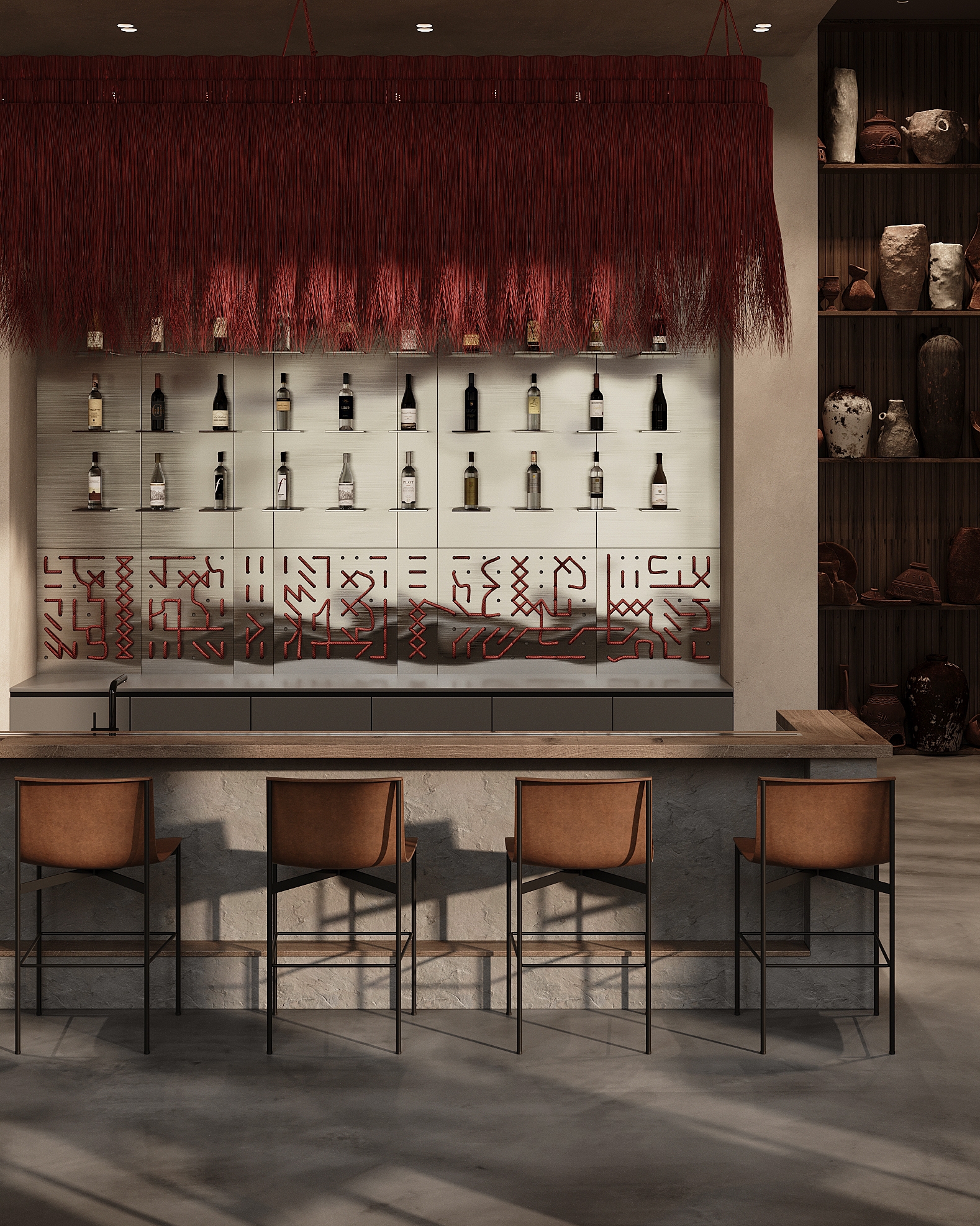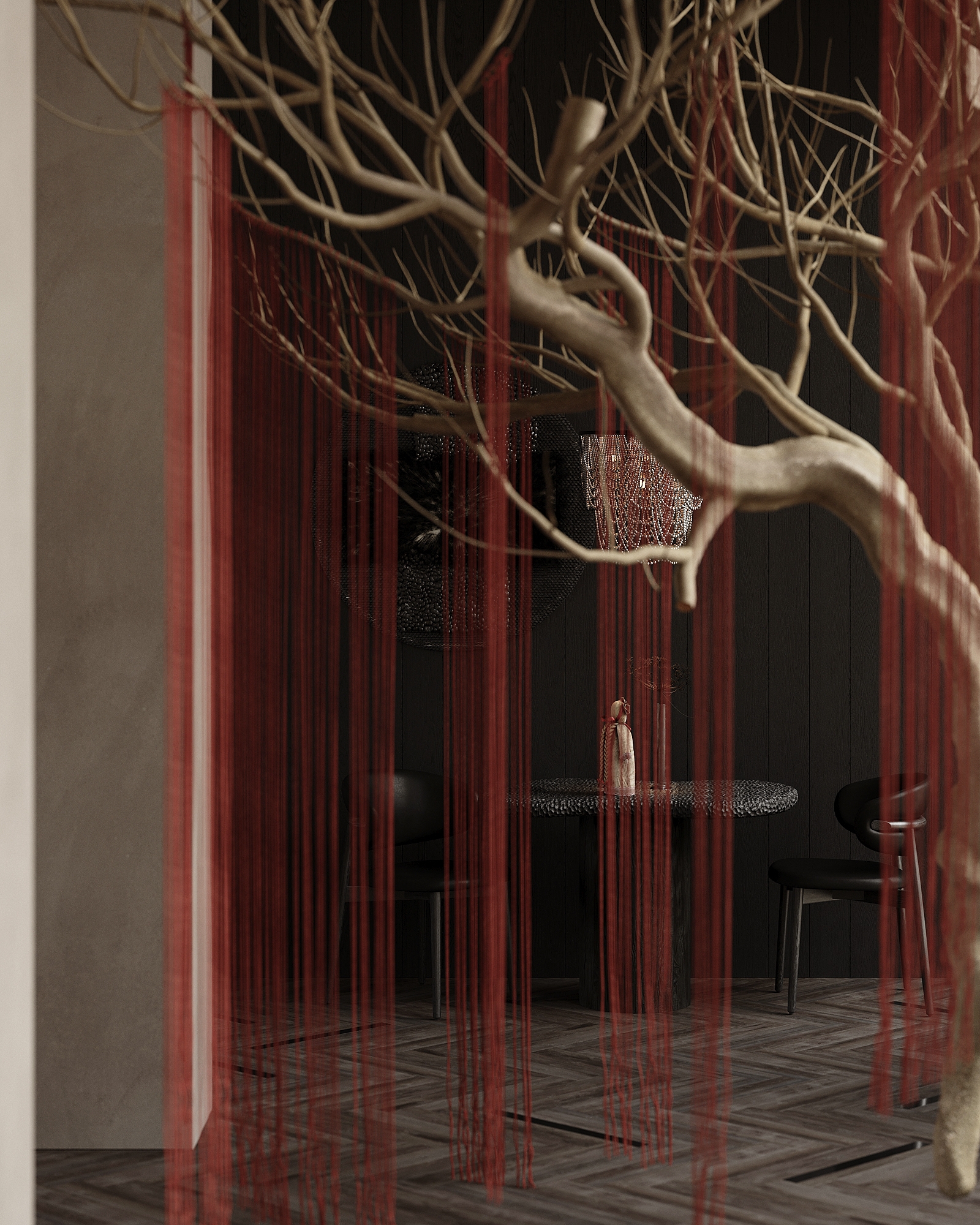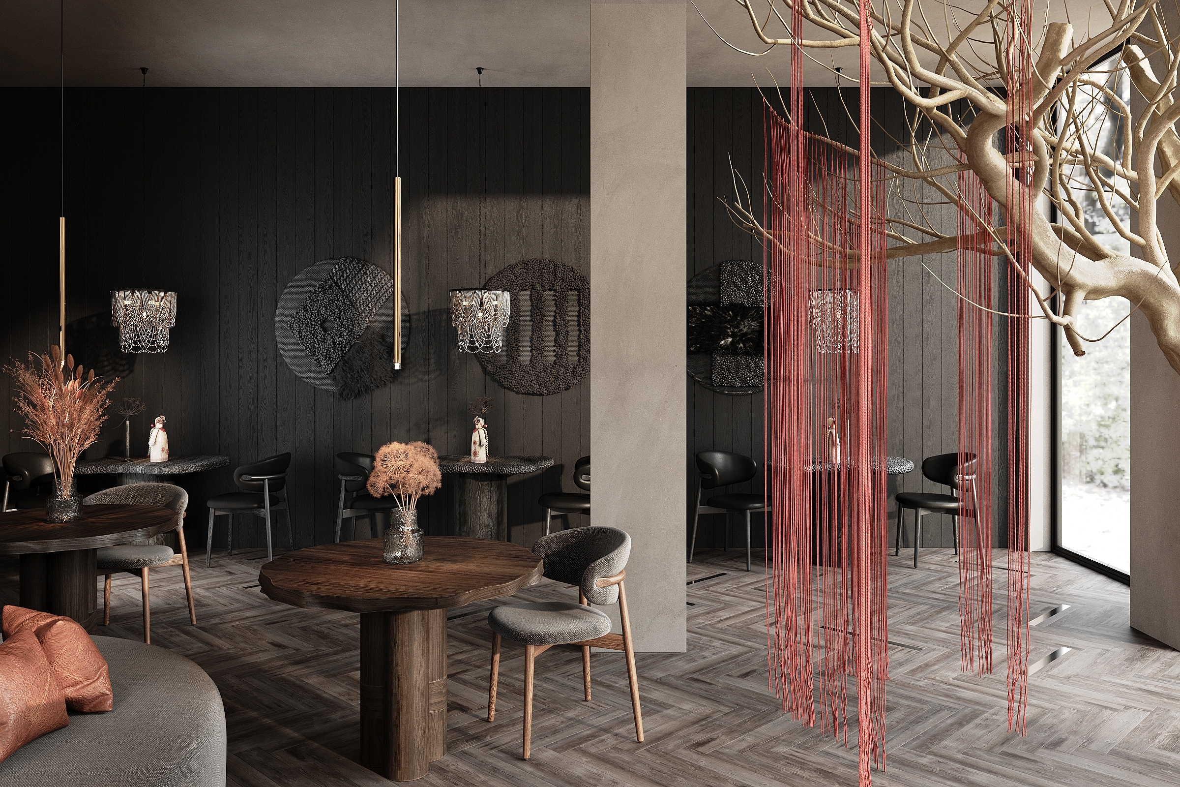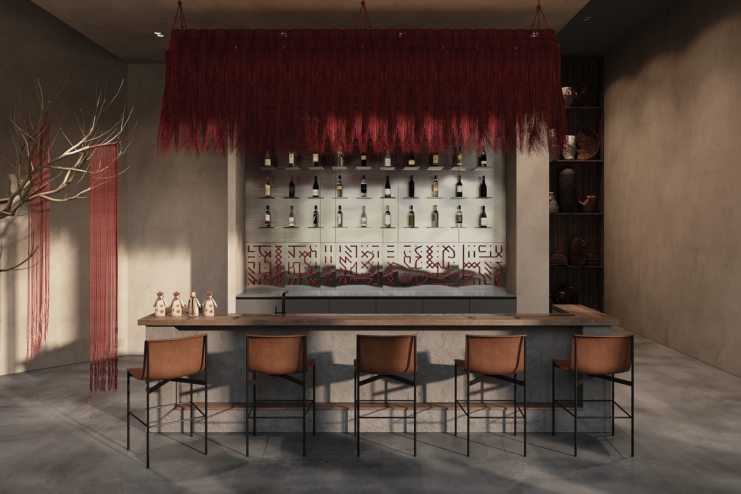 The main focus of the interior is on two bright, branching trees symbolizing a connection to roots, conveying family values, and honoring cultural traditions. Well-thought-out details form a cohesive composition, unraveling the conceptual thread of the interior and enhancing the unforgettable atmosphere. Red delicate cords hanging from the trees symbolize the threads of traditional Ukrainian embroidery. The theme of the Ukrainian folk symbol, the embroidered shirt (vyshyvanka), serves as the leitmotif of the interior. Handmade panels on the walls, rag dolls (motanky), and clay dishes evoke the ancient Ukrainian culture and the values of ancestors.