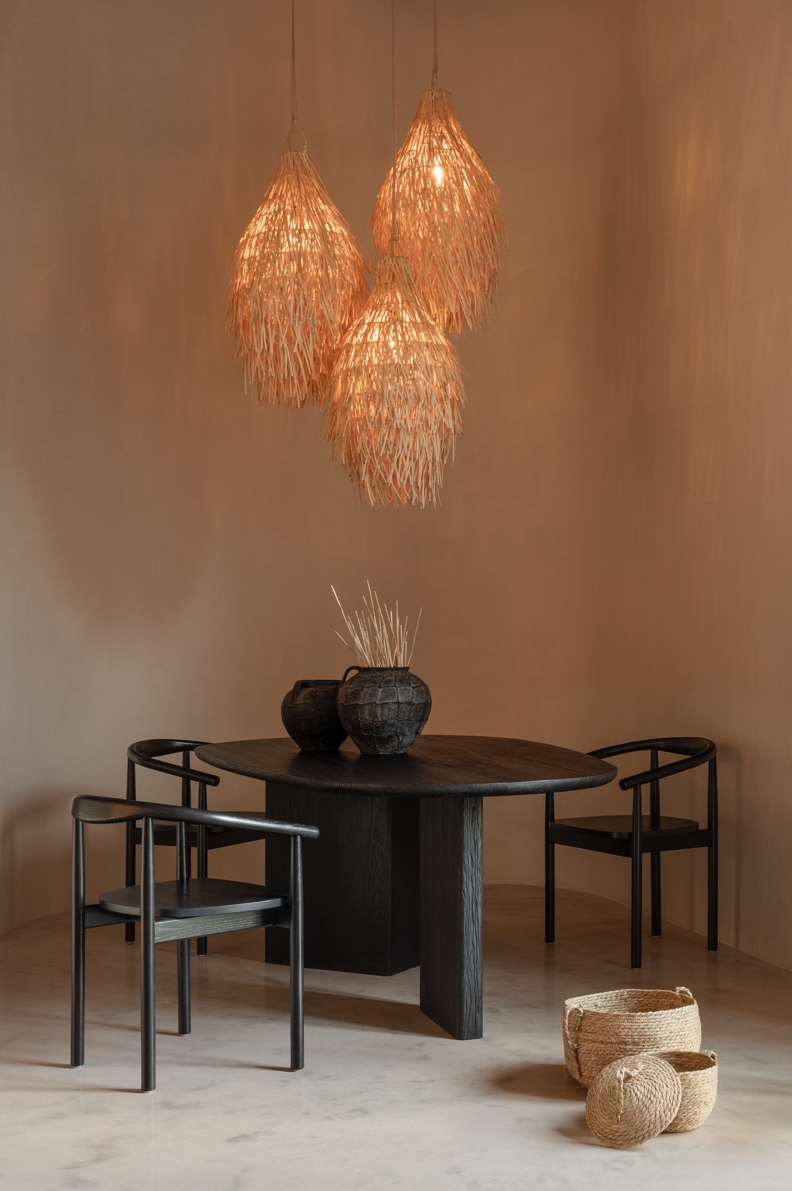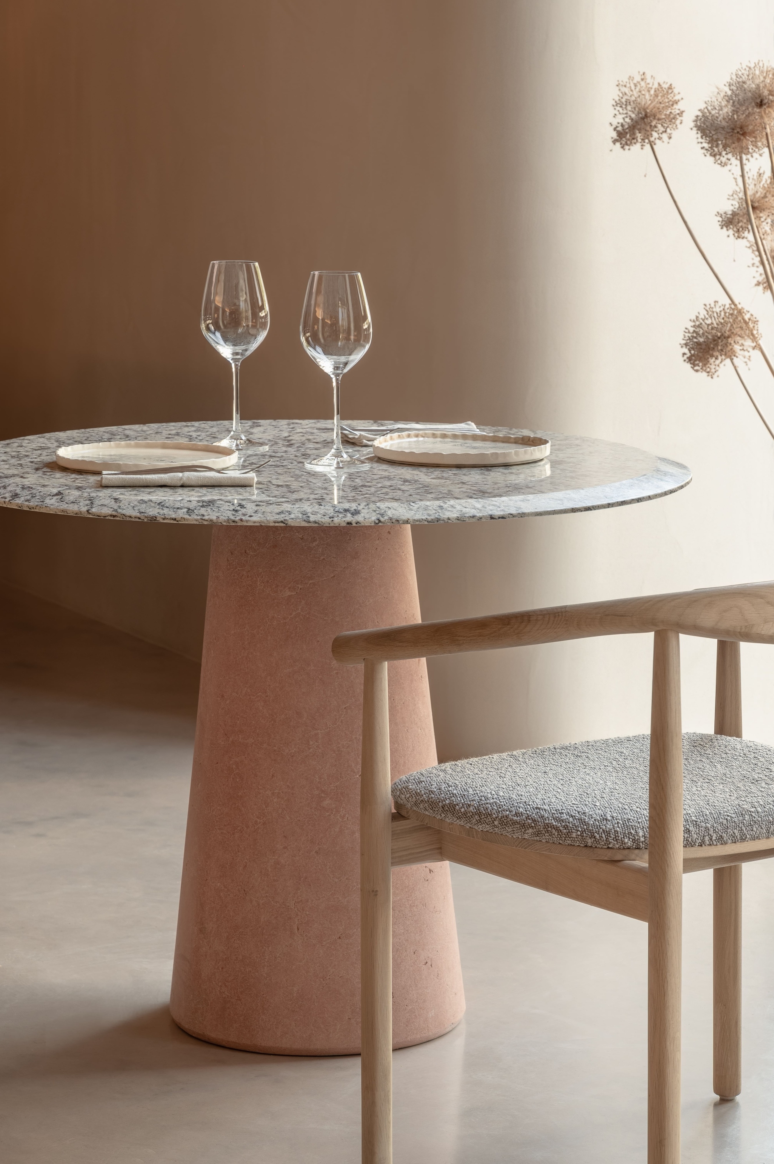 Textured walls, inspired by traditional Ukrainian clay huts, ground the design in architectural heritage, while bespoke furniture and decor, made by regional masters, unify the space like a ribbon. Authentic Opishnia ceramics and Tripillian-era jugs add a sense of timeless artistry, and floral arrangements of wildflowers fill the air with natural warmth and aroma.