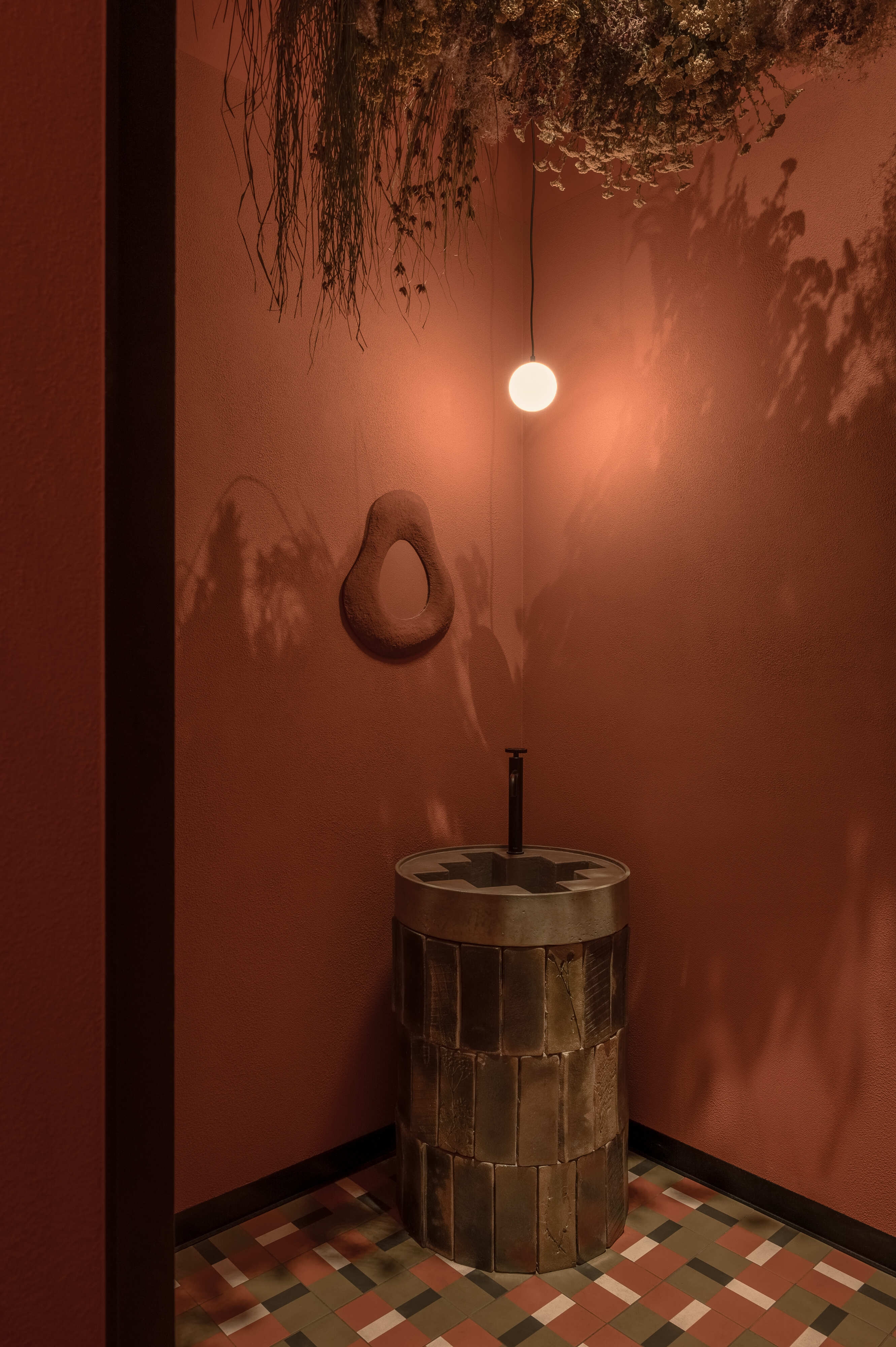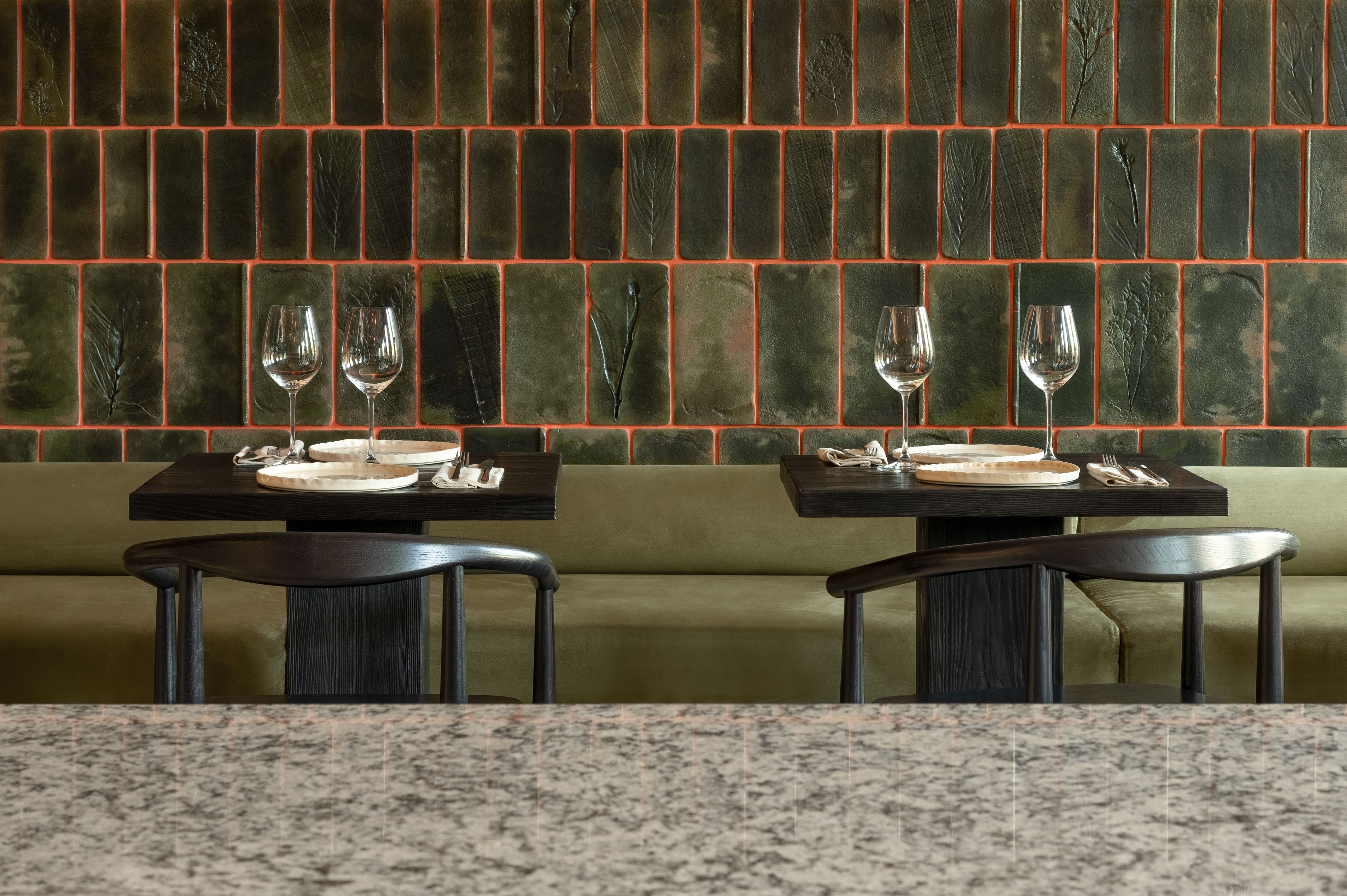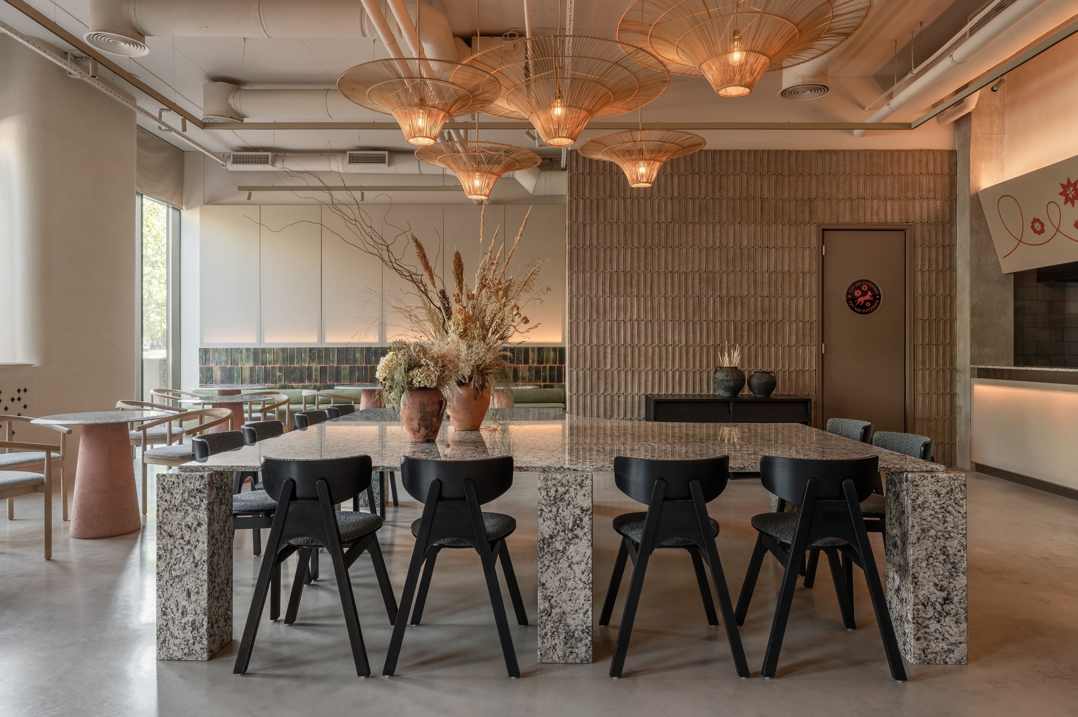 These ideas are reflected in the interior, where every detail has meaning. Decorative tiles and ceramic plates with unique meadow flower imprints were handmade exclusively for STRICHKA by local artisans. These custom pieces symbolize the connection between culture and nature while giving the space an unmistakable character.