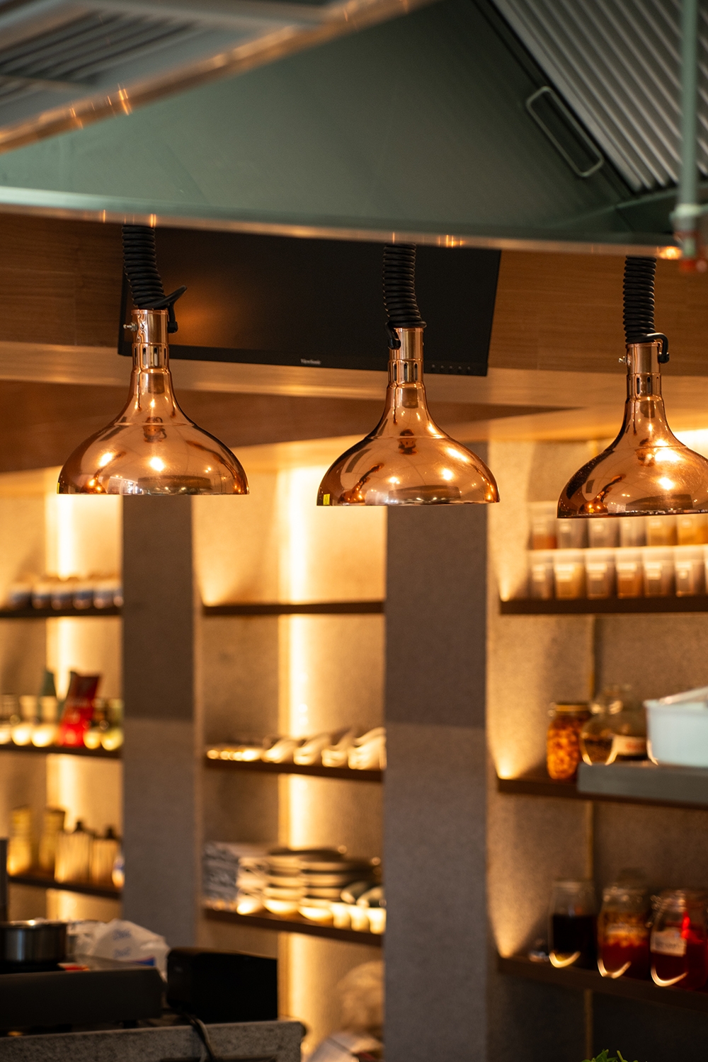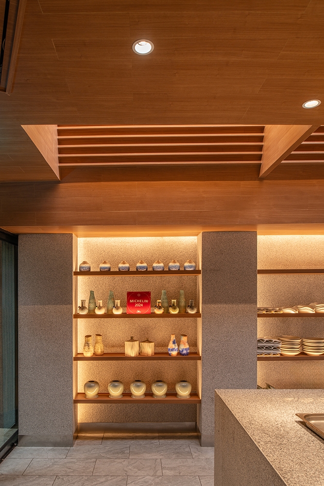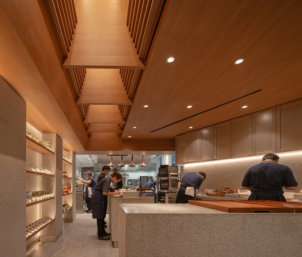 The entire counter structure is made of granite, while the ceiling is entirely wooden. Additionally, there are natural light openings in the passageway connecting to the hot kitchen, allowing sunlight to brighten the area and reduce energy consumption during the day.