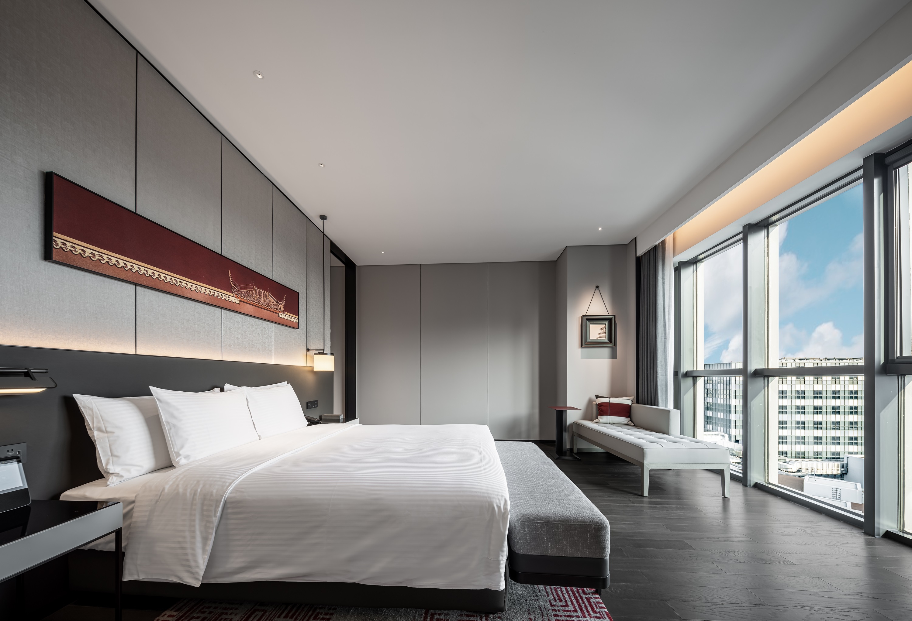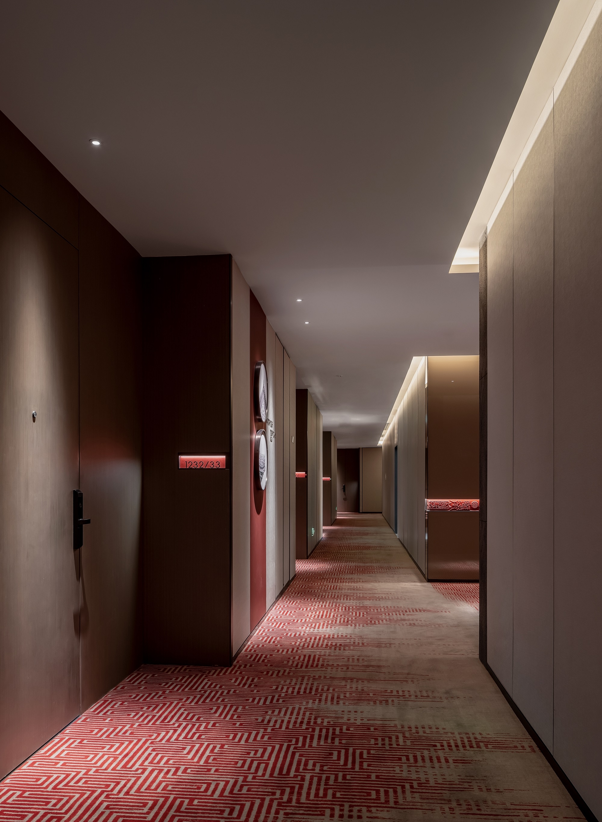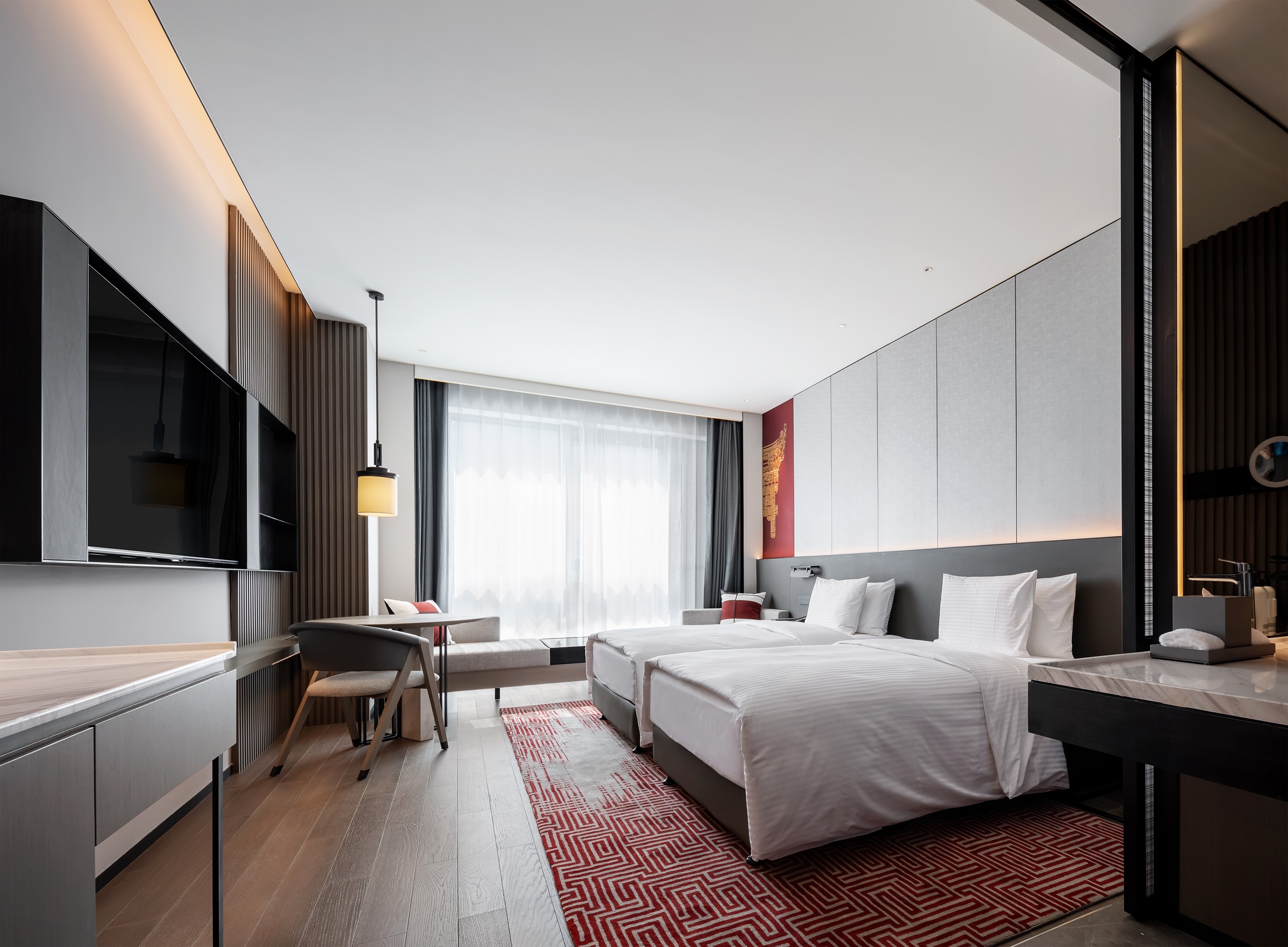 Located in Building 1, Dongba International Business Center, Chaoyang District, the project has a total floor area of 29,200 square meters, and consists of 13 floors above ground and 3 floors below ground, among which, the 1st, 5th and 6th floors are the public area of the hotel, and the 7th to 13th floors are hotel room floors, a total of 203 rooms.In the context of the capital city culture, through refining such cultural symbols as colors, architectural elements, and ancient cultural charm, the hotel design showcases a modern, stylish hotel by means of modern Chinese aesthetics.The capital city’s architectural culture and the color red are used as design elements to embody the profound deposits of the city. The ripple design of the carpet shows the spatial expression of the implication that the water from Dam River is nourishing a land. For standard rooms, we have made a layout of open bathrooms to make the space more spacious and transparent.