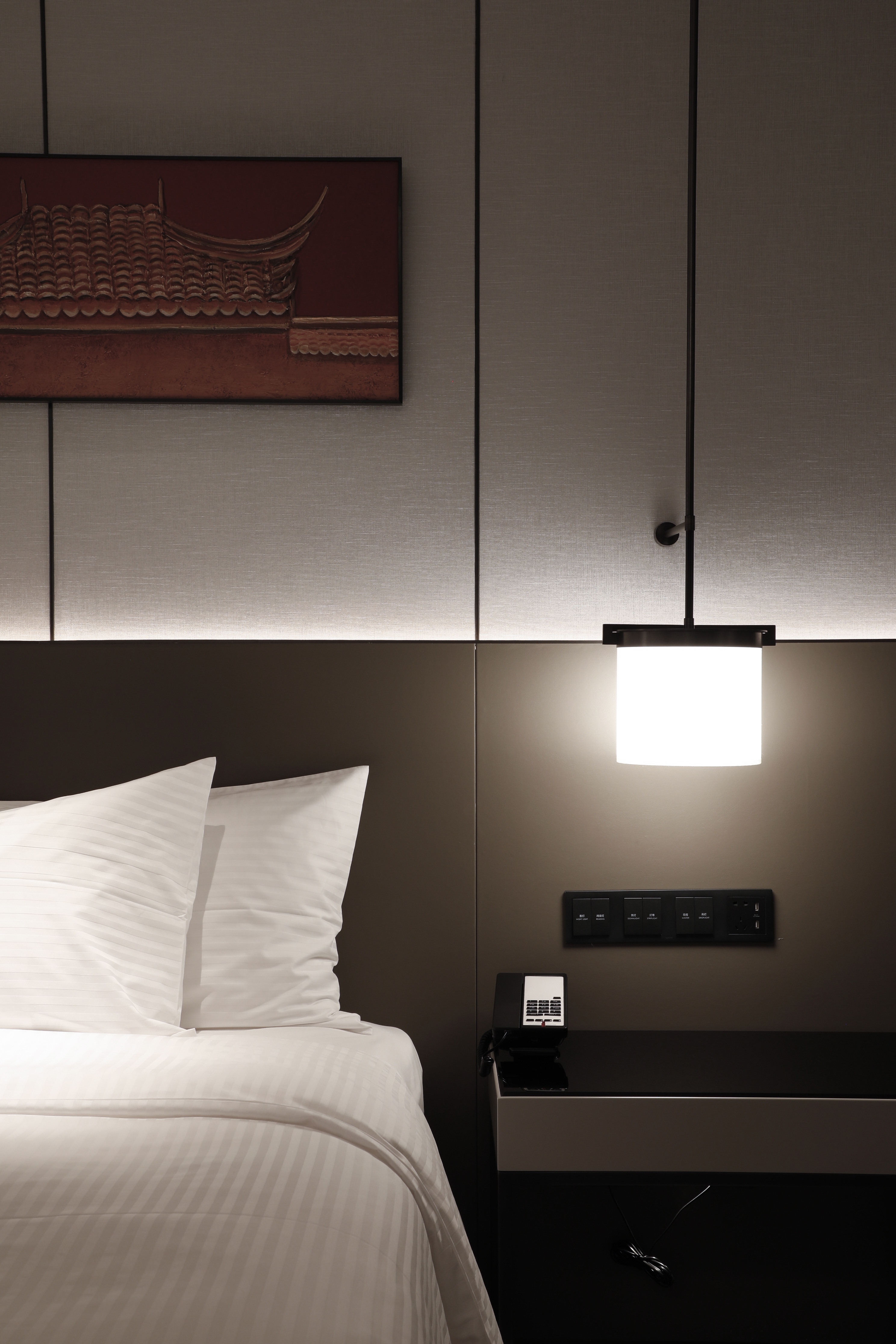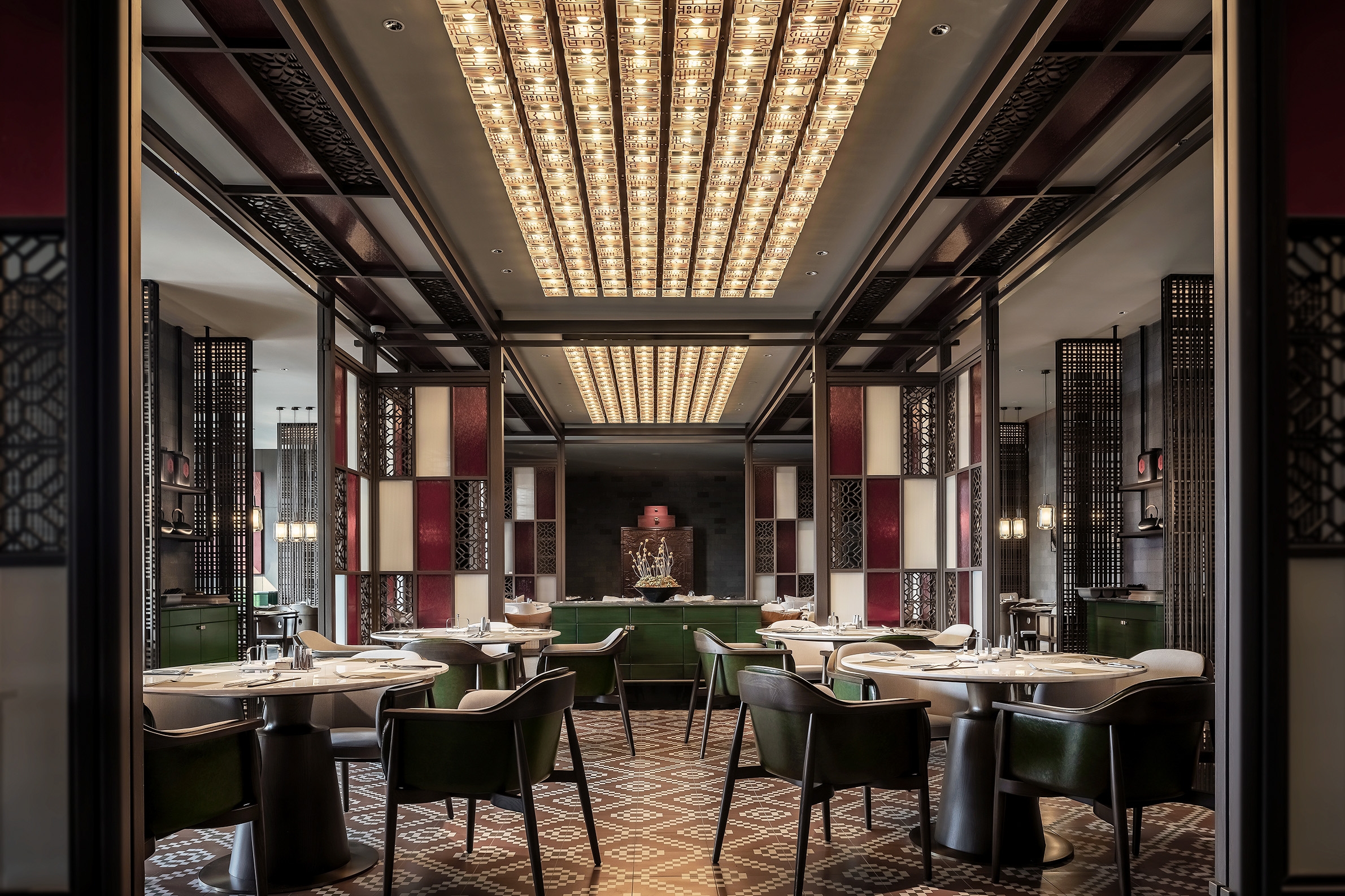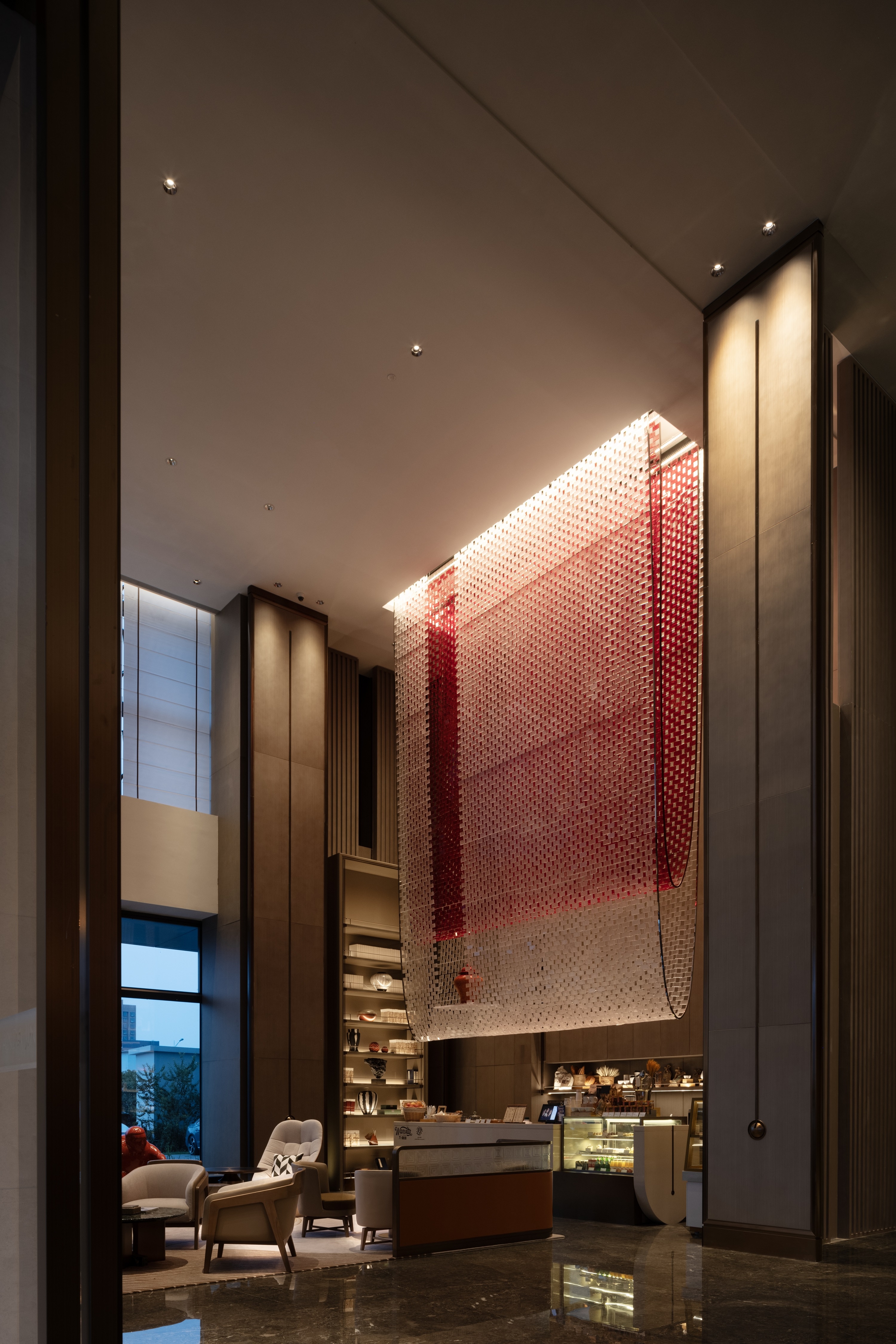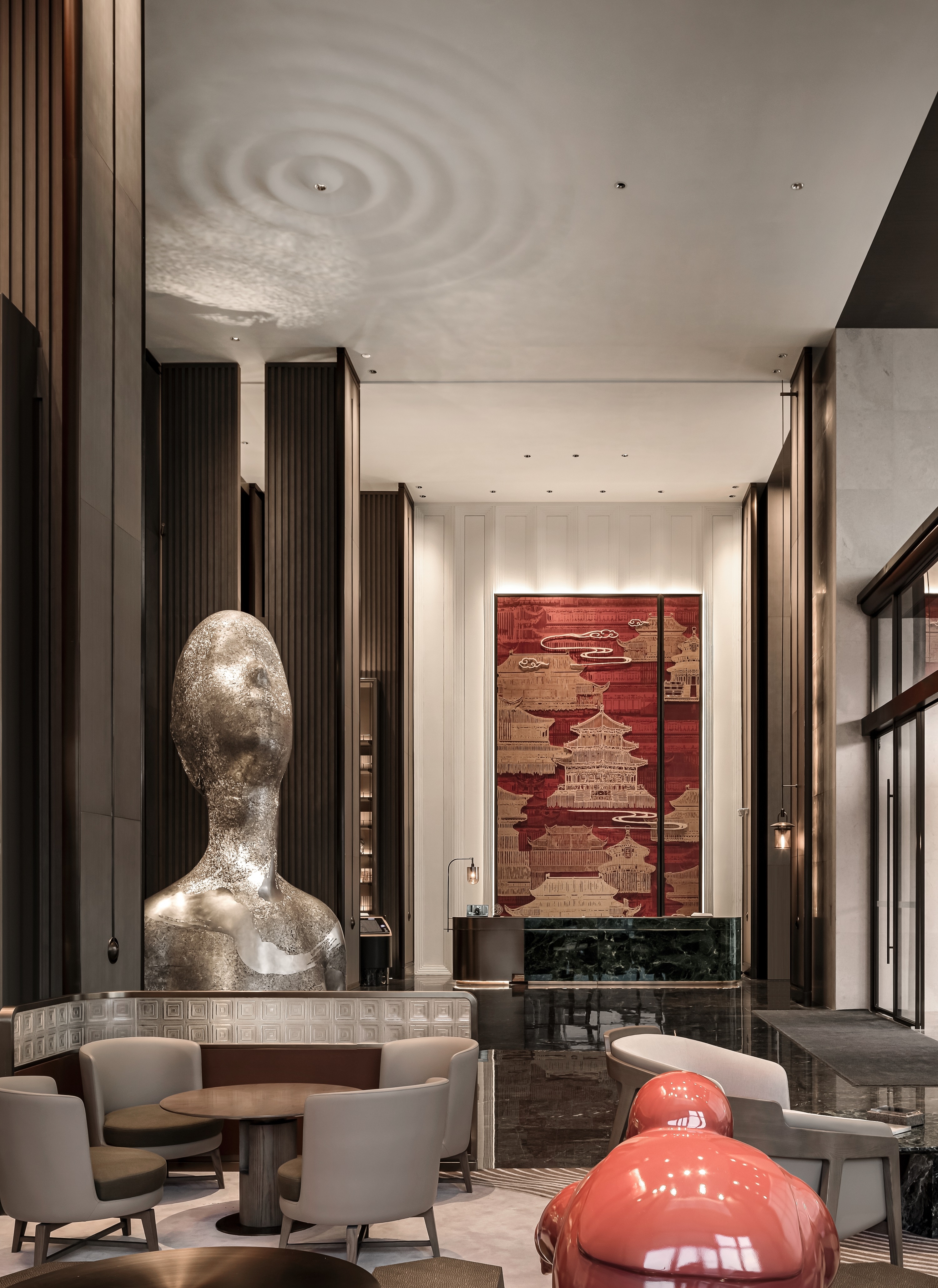 Located in Building 1, Dongba International Business Center, Chaoyang District, the project has a total floor area of 29,200 square meters, and consists of 13 floors above ground and 3 floors below ground, among which, the 1st, 5th and 6th floors are the public area of the hotel, and the 7th to 13th floors are hotel room floors, a total of 203 rooms.In the context of the capital city culture, through refining such cultural symbols as colors, architectural elements, and ancient cultural charm, the hotel design showcases a modern, stylish hotel by means of modern Chinese aesthetics.The capital city’s architectural culture and the color red are used as design elements to embody the profound deposits of the city. The ripple design of the carpet shows the spatial expression of the implication that the water from Dam River is nourishing a land. For standard rooms, we have made a layout of open bathrooms to make the space more spacious and transparent.