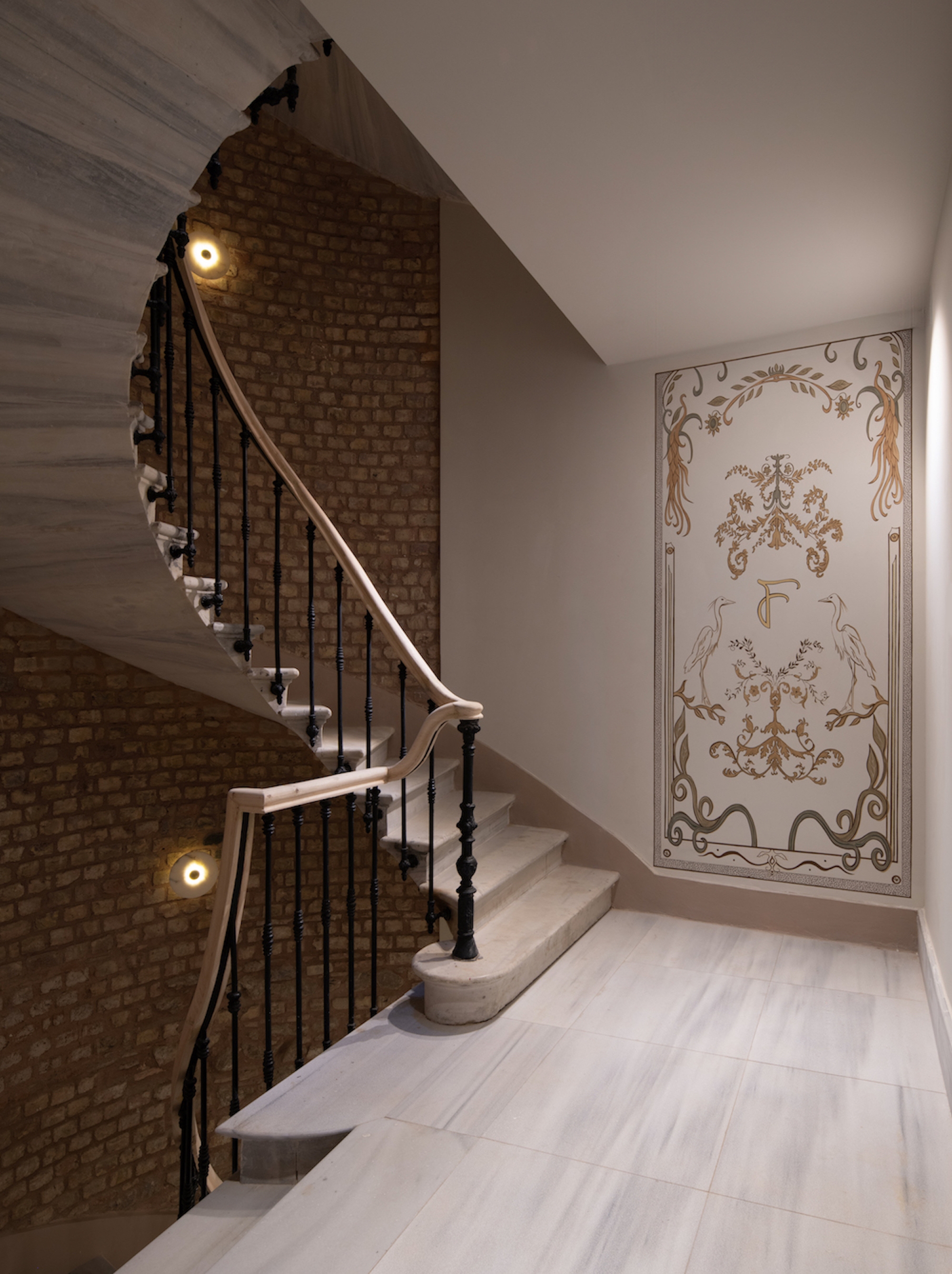 Set in the heart of Istanbul’s historic Asmalimescit district, Casa Foscolo is a transformative design project that reimagines a 19th-century structure as a boutique hotel, art gallery, and café. This reborn, history-rich space is a place where art, culture, locals, and guests interact, creating an experience that is both timeless and forward-looking. Emphasizing Istanbul’s historical heritage, the design allows guests to immerse themselves in the culture-rich Pera area through the lens of history. The building’s neoclassical architectural elements, including spacious high ceilings, original stone walls, and period-specific details, were meticulously restored to provide an authentic Beyoglu experience. Warm pastel tones, marble, tile mosaics, and decorative ceramics enhance the historical ambiance, while the blended use of brick and travertine stone highlights the structure’s elegance. Handcrafted ceiling motifs in the lobby and rooms add unique character, and the hotel’s walls double as an exhibition space, showcasing various artworks. Casa Foscolo blends tradition and modernity, preserving heritage while embracing contemporary design.