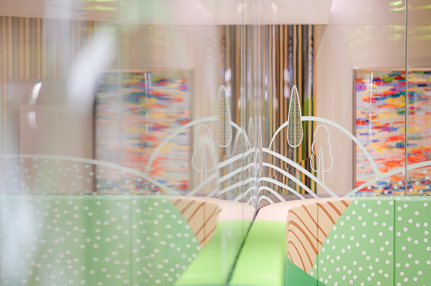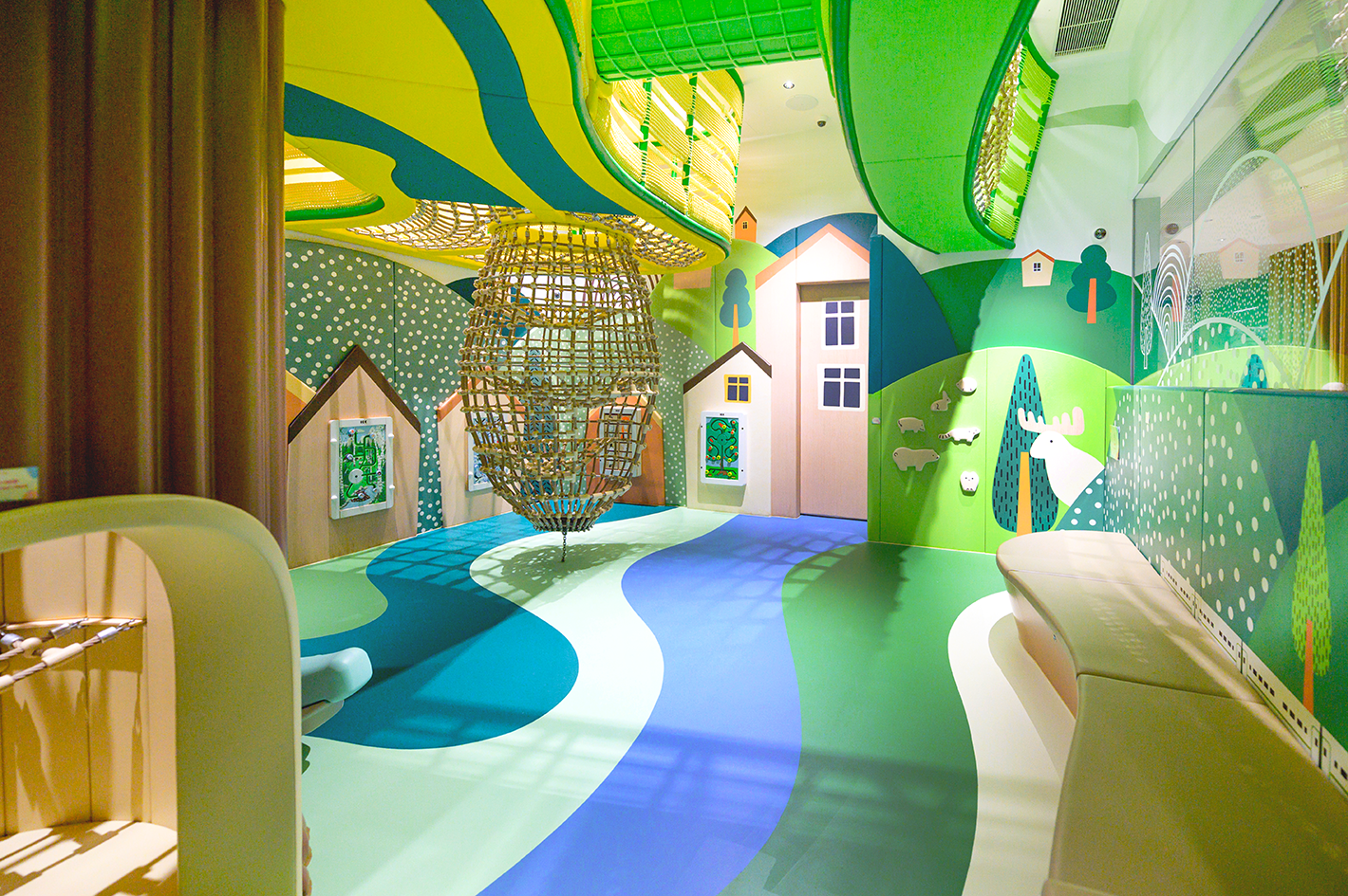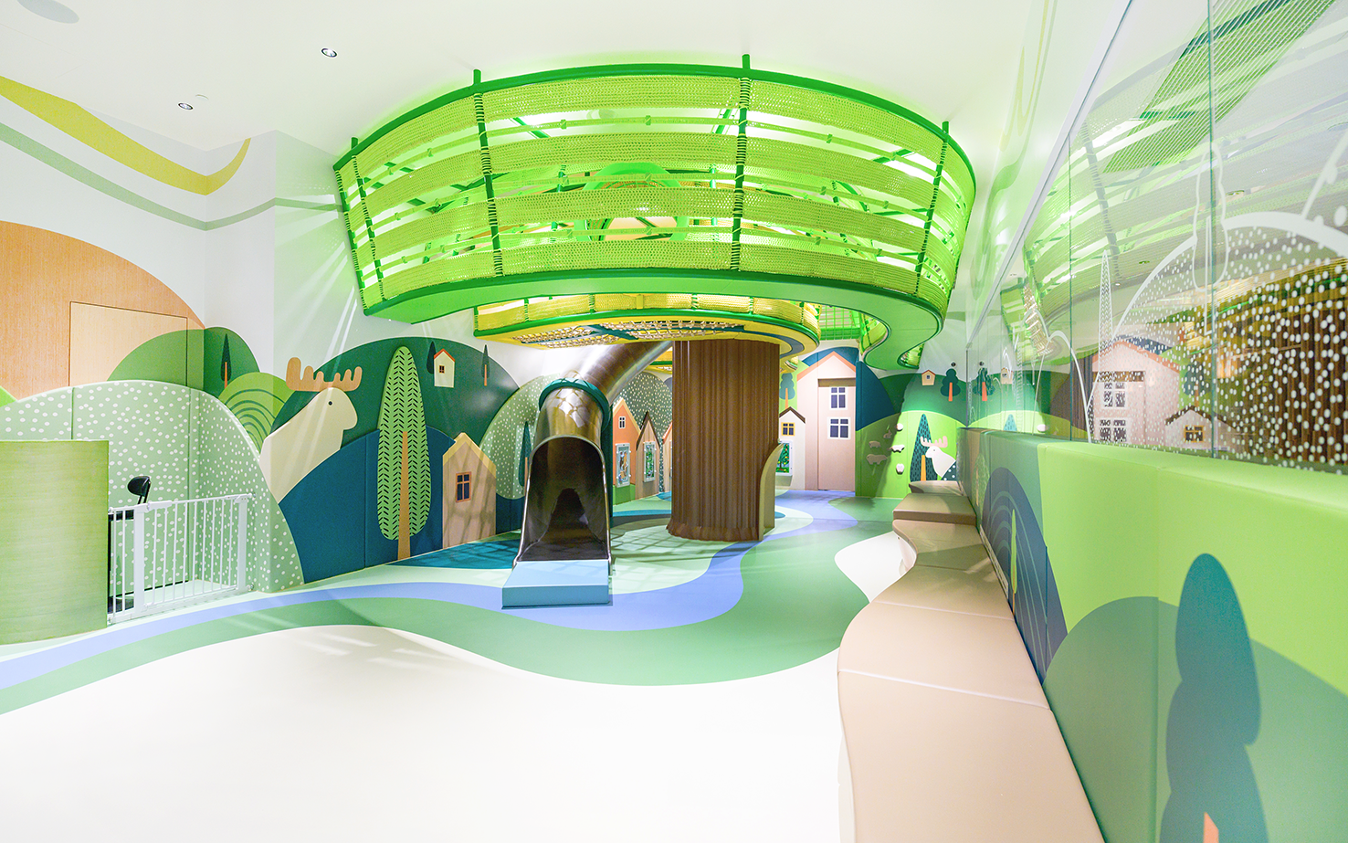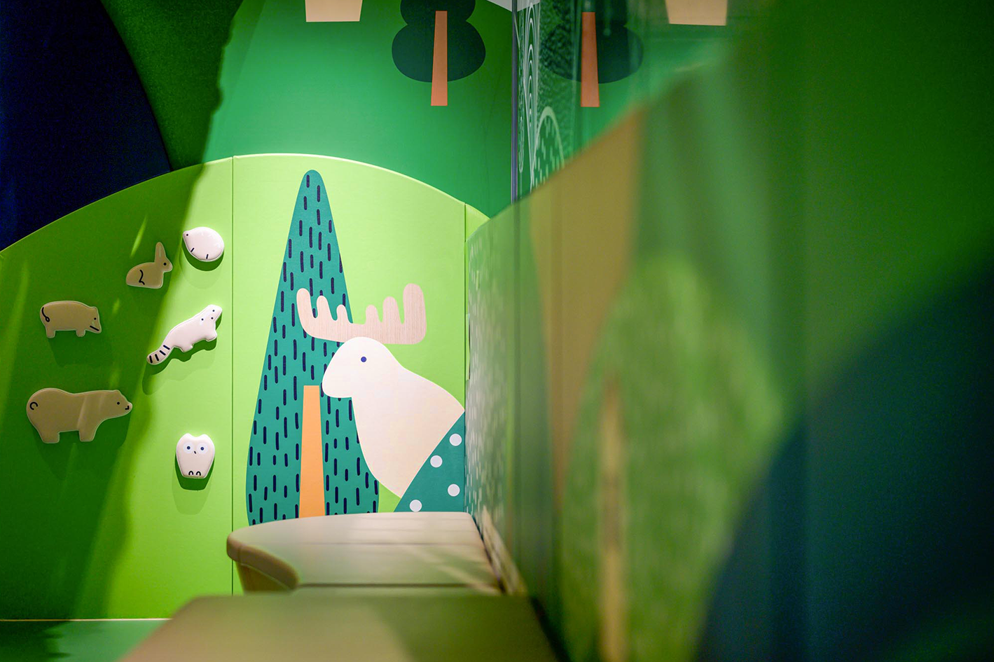 We are determined to once again “play out of the box” and create an indoor natural world amidst the hustle and bustle. Jolly Woodland is designed based on an aurora town in the northern hemisphere. Through different patterns, colors and lighting that deliver a natural vibe, we aim to literally turn this playroom into a woodland full of joy and laughter, so that children can feel the unique freshness and coziness of a Nordic town.