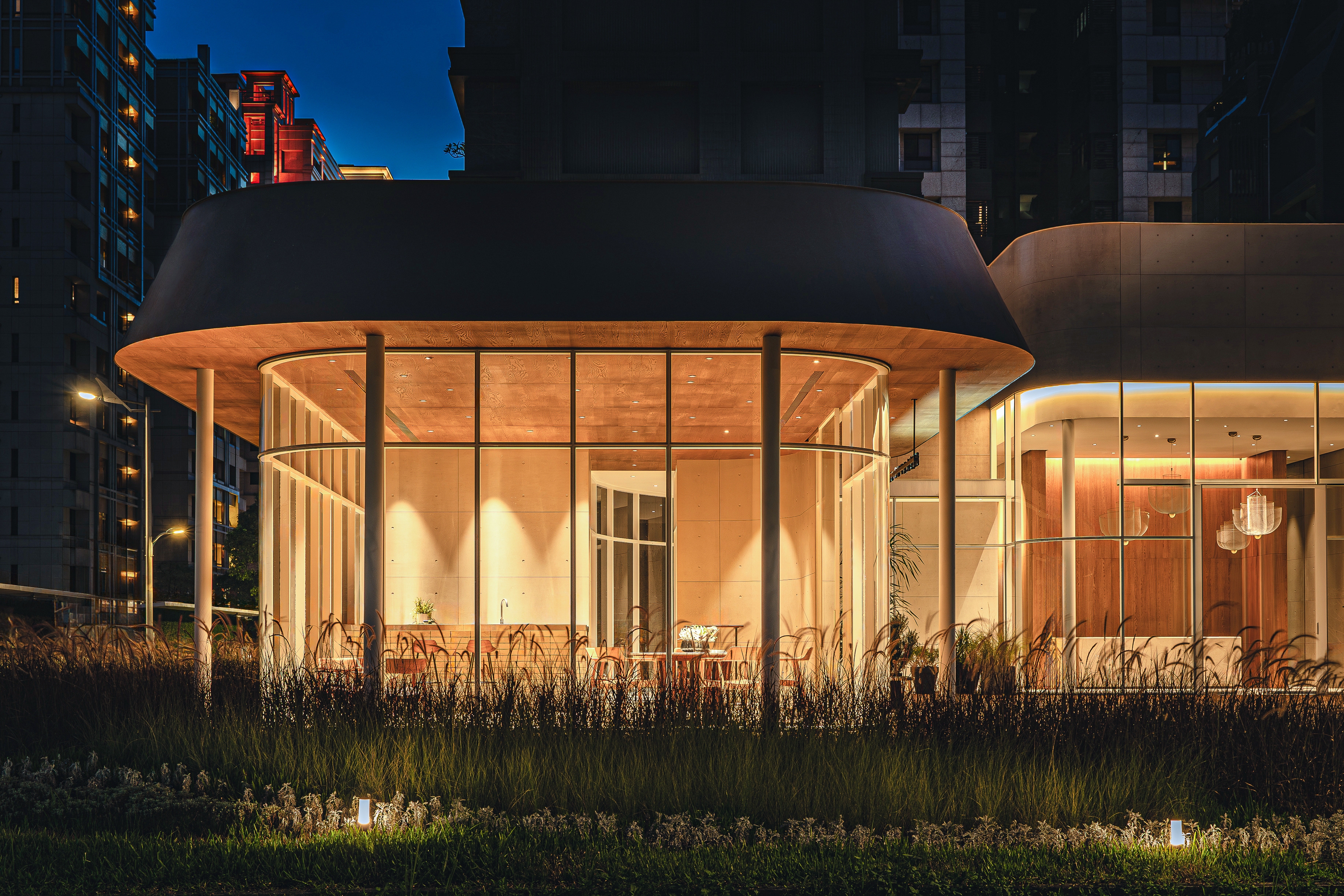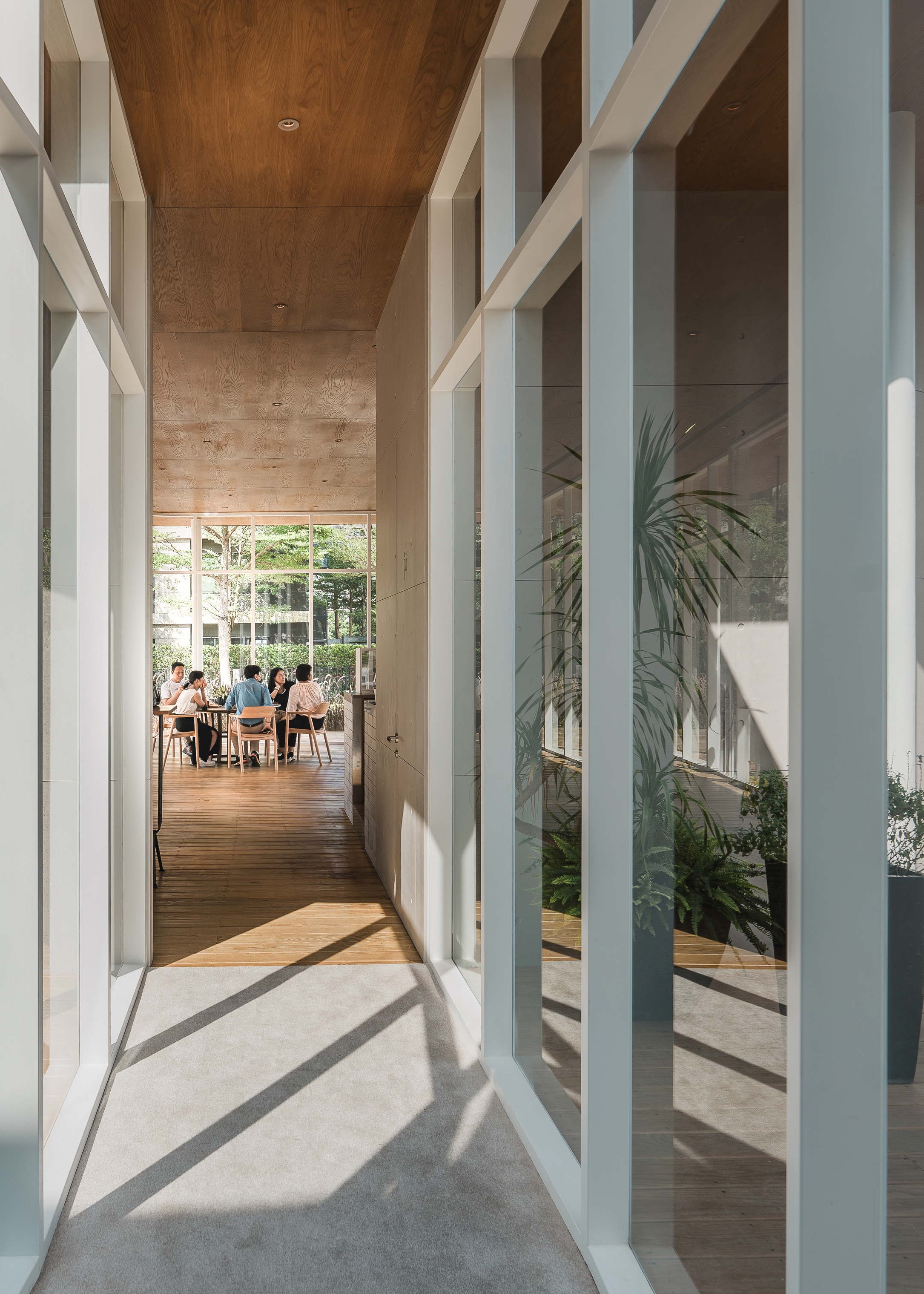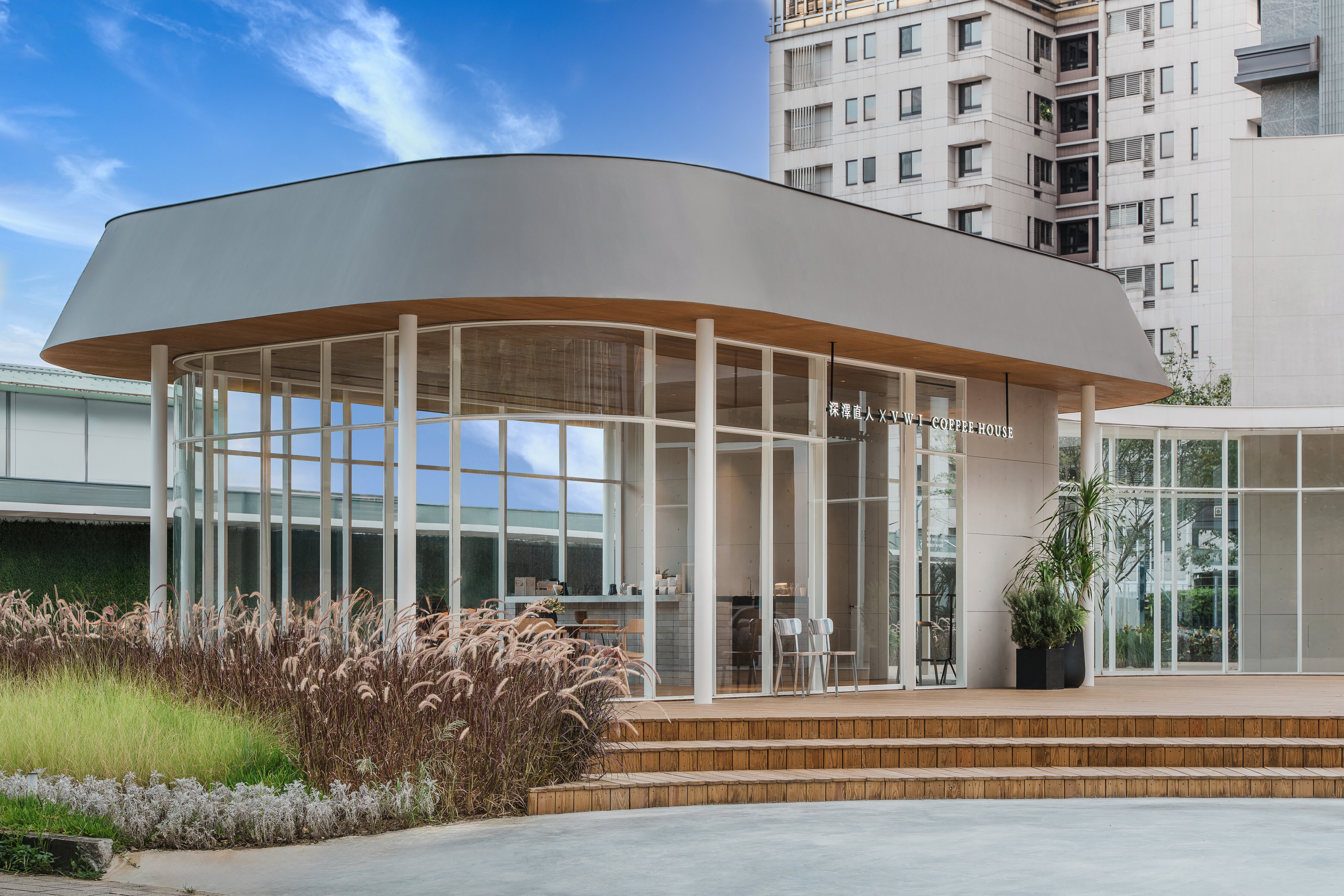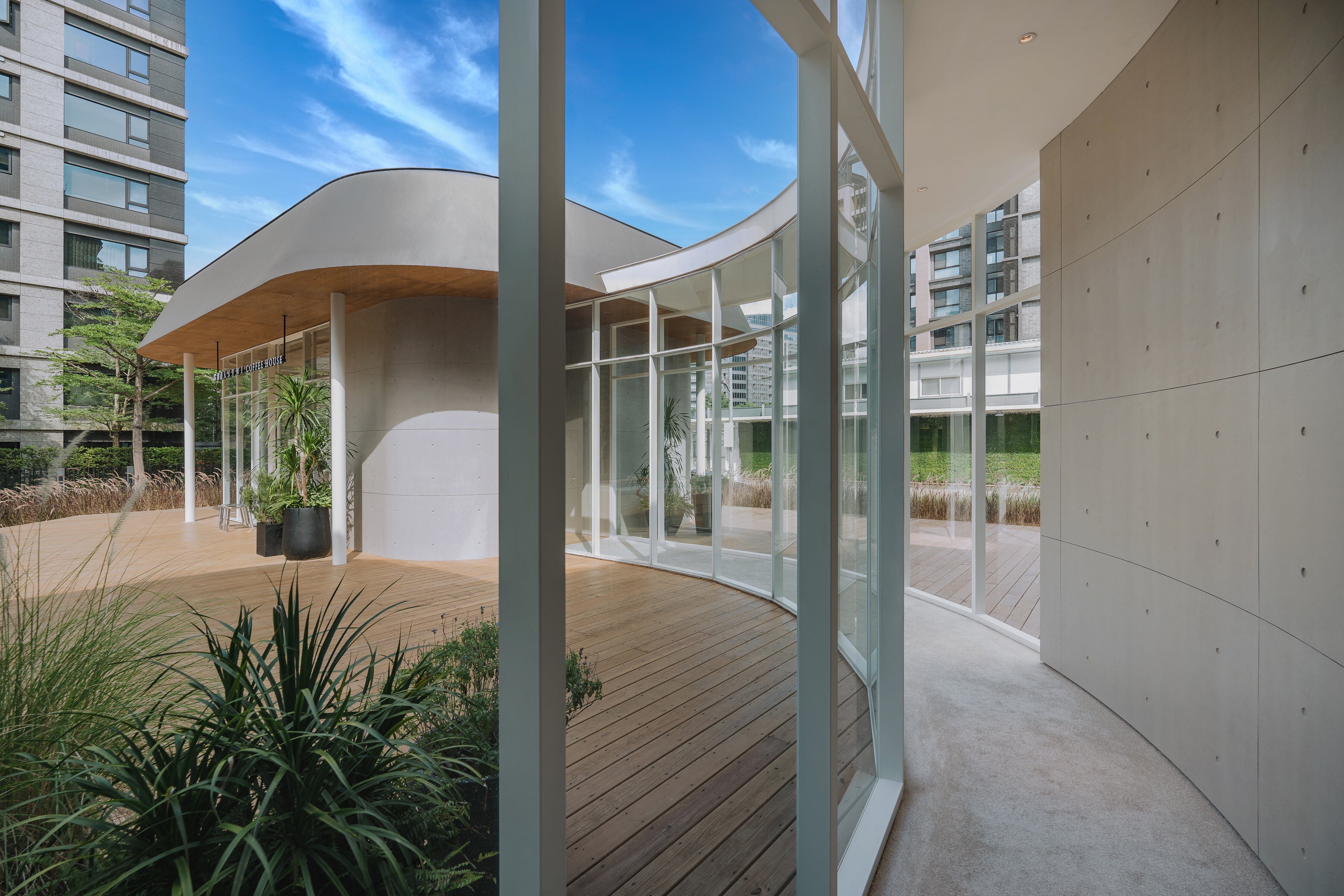The water-like glasshouse design allows passersby to see the volumes of the interior clearly and customers to see the scope of the building's base from inside. The shape of the glass corridor connecting the café and the reception center corresponds to the curved shape of the building base. The monolithic roof gives the illusion of an amorphous shape, and the use of recessed lights with hidden frames in the interior makes the space appear seamless.