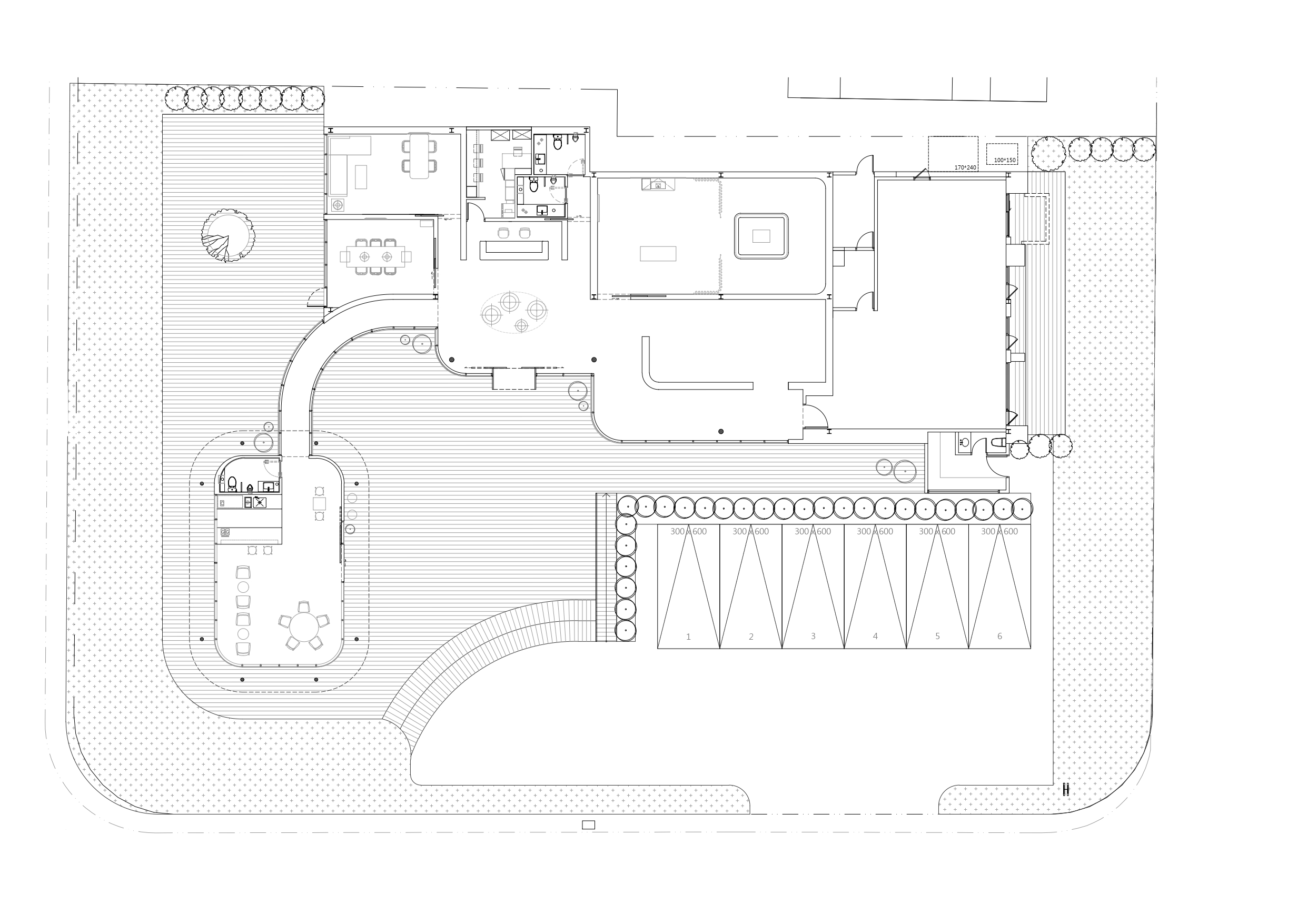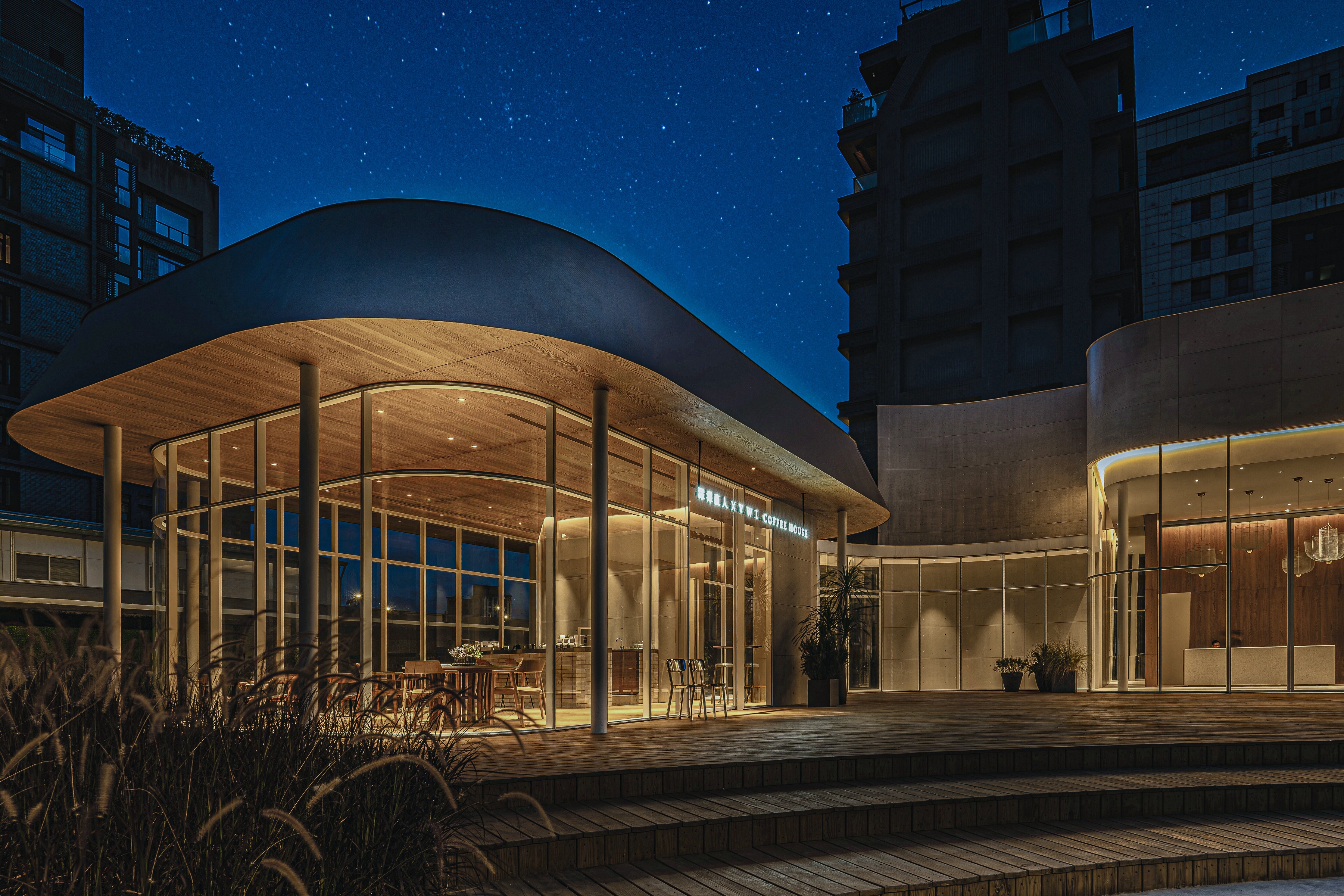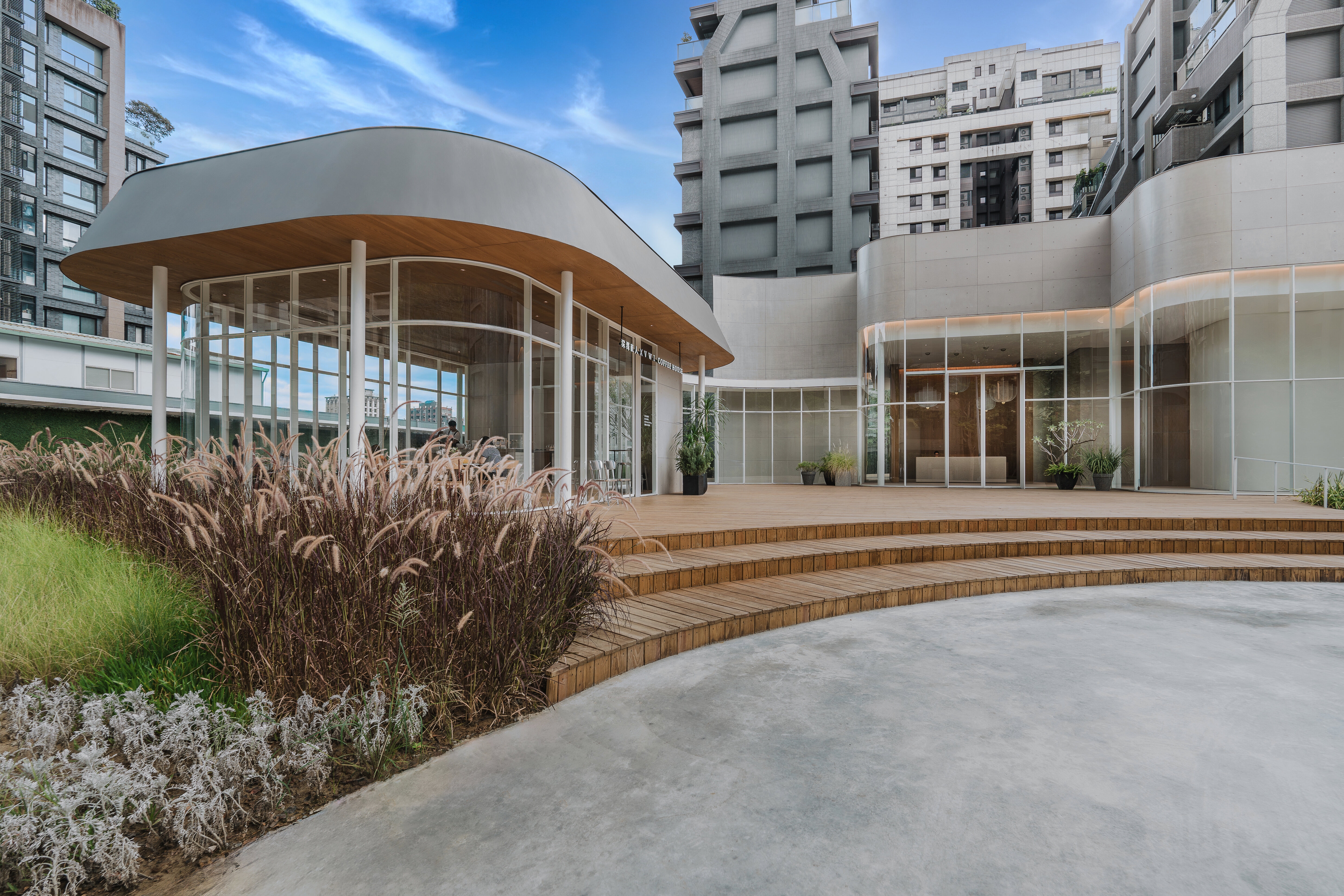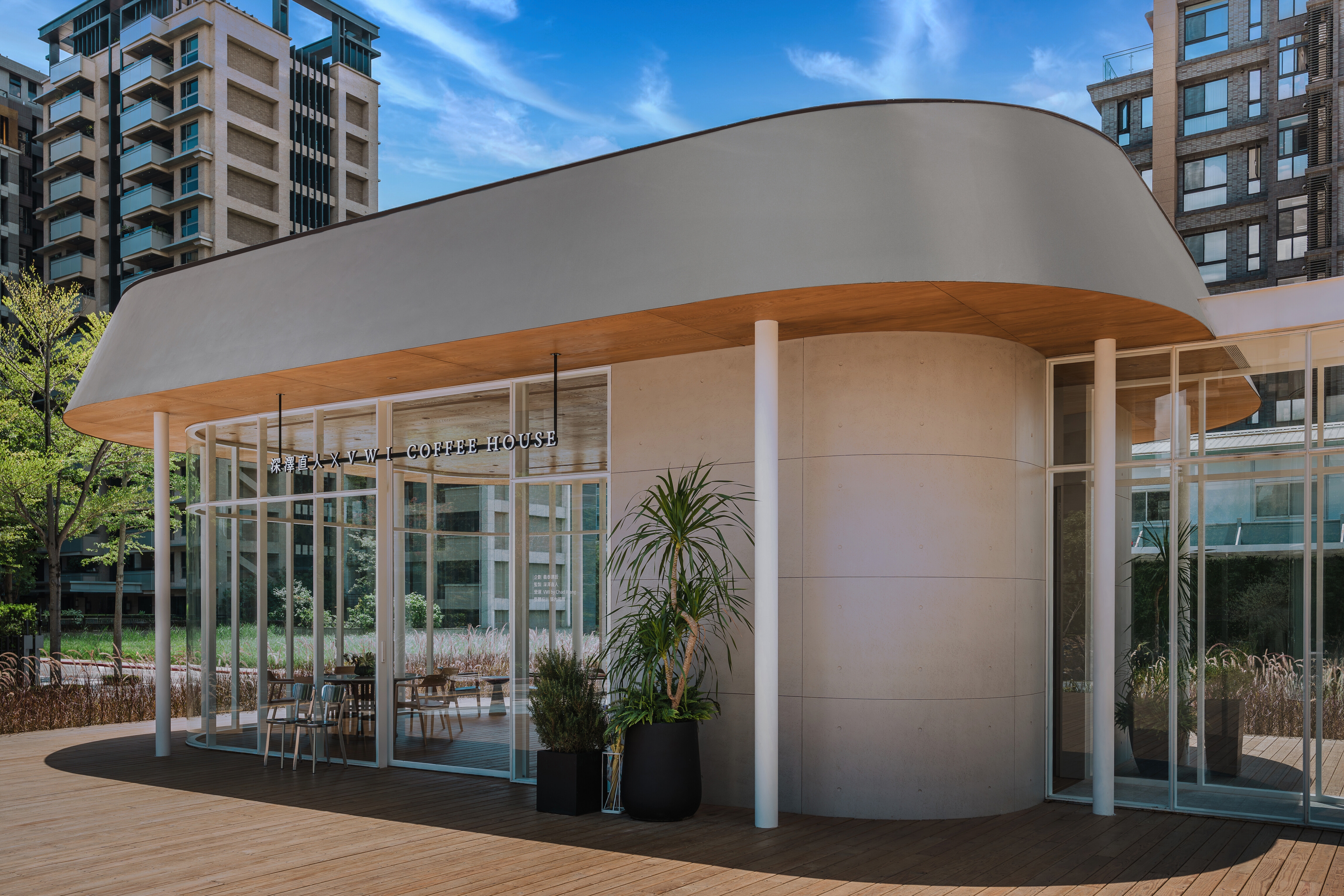 The water-like glasshouse design allows passersby to see the volumes of the interior clearly and customers to see the scope of the building's base from inside. The shape of the glass corridor connecting the café and the reception center corresponds to the curved shape of the building base. The monolithic roof gives the illusion of an amorphous shape, and the use of recessed lights with hidden frames in the interior makes the space appear seamless.
