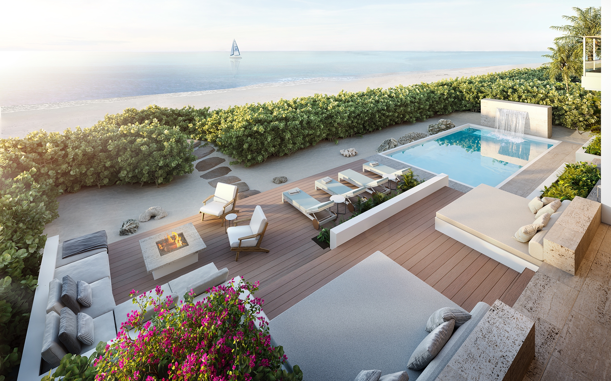 Stone and sustainably harvested wood are utilized throughout the units and paired with luxury appliances. All selections were made in partnership with the contractor and local vendors to facilitate ease of procurement and maintenance while achieving an elegant result for a discerning clientele. White travertine terraces and pool decks blend into white sand shores, seamlessly blending architectural elements with the site’s context. The kitchens feature a “surfboard” style island with stone and fluted wood bases, cabinets with a cerused wood finish and quartzite stone countertops, and Brokis Knot pendants that evoke sailboats at sea.
