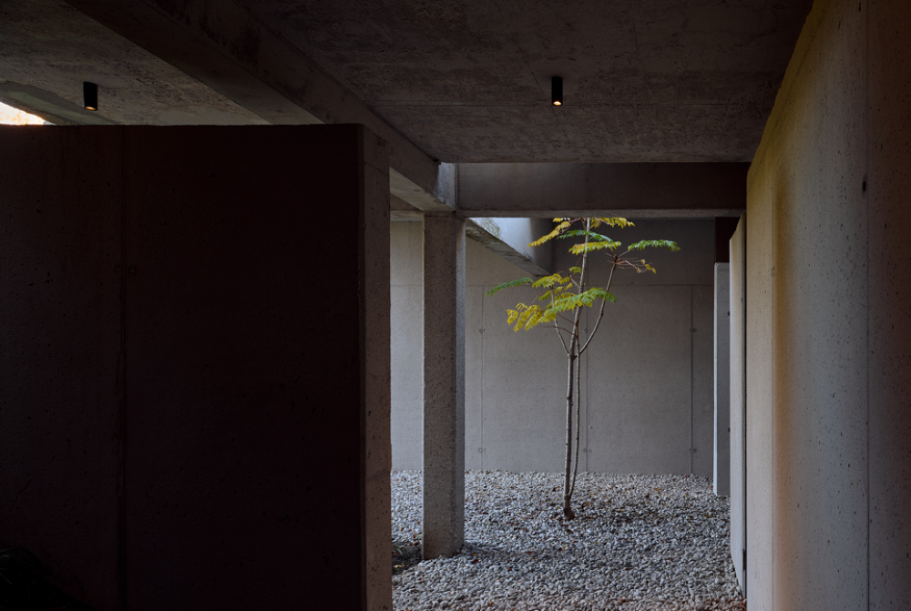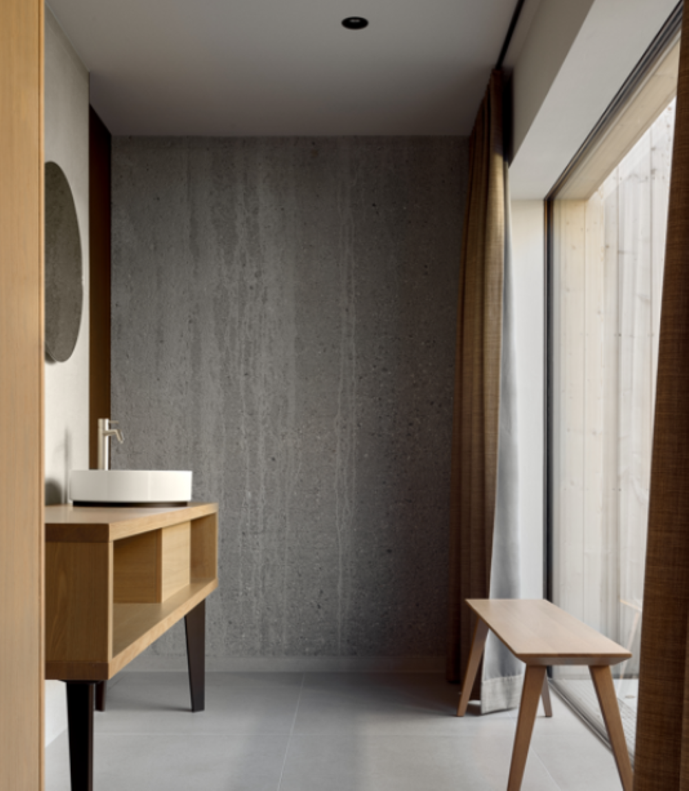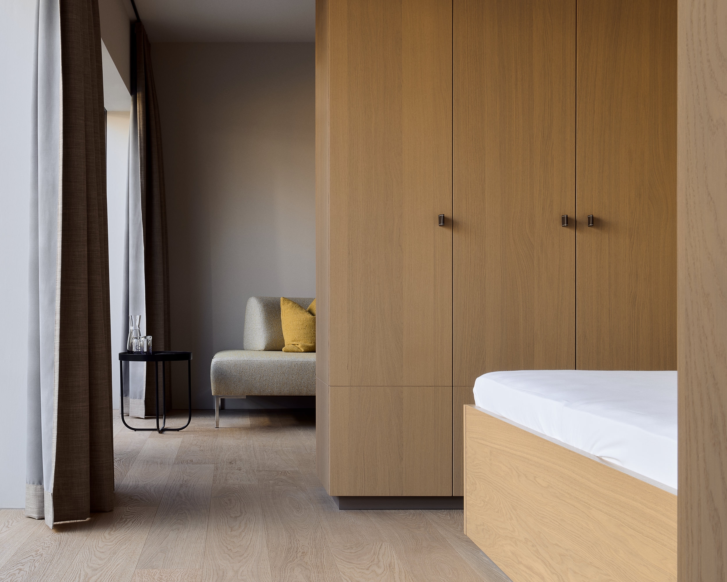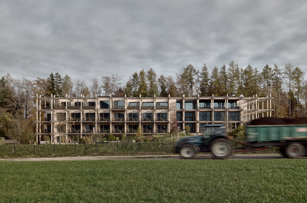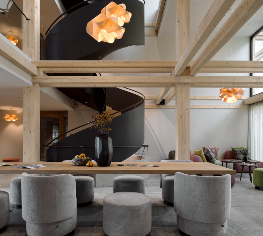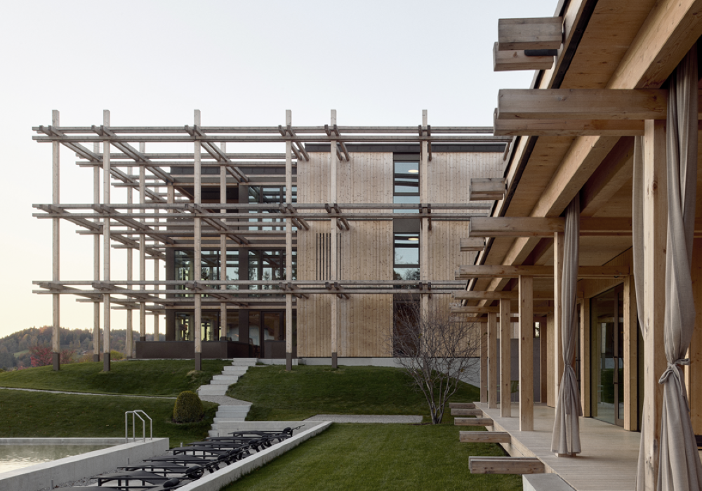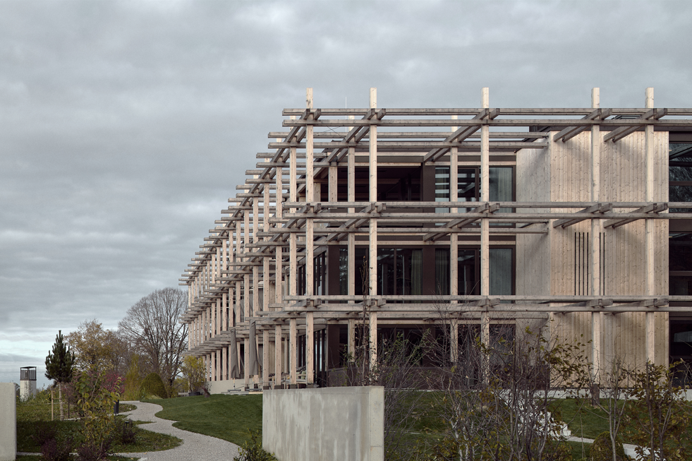 The hotel emerges confidently but thoughtfully from the neighboring forest. The aboveground exterior walls of the guest wing were prefabricated in timber frame construction with pre-installed windows. Together with the prefabricated concrete ceilings, they contributed significantly to the building being ready for occupancy in just 17 months. The wooden façade construction made from the supposedly "low-value", local spruce wood performs not only in an aesthetic and narrative way but also in physical building functions. Thanks to a further developed, vernacular construction structure, in which the weak points of the wood were optimized using the latest material knowledge (PU sealing of the end grain surfaces), it was possible to create a prototype that can avoid energy-intensive metal covers for the wooden parts and the use of high-quality wood species. The façade is inspired by the surrounding urban forest and its structural tectonics. The vertical wooden supports with their horizontal balconies in a three-dimensional net symbolize the individual trees of the forest, which weave themselves into a three-dimensional structure (the forest) via their horizontally spreading branches.
