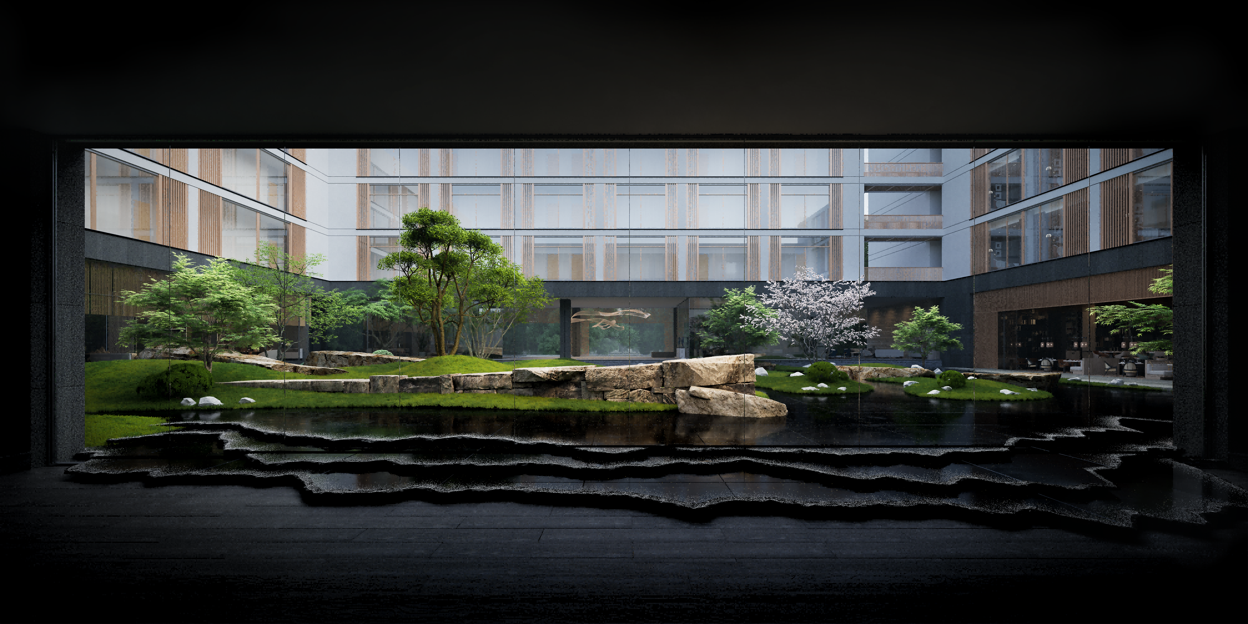 The landscape design abstracts Qinhuangdao’s natural features, blending history with nature. Towering pines frame peaceful spaces, while rough-hewn boulders ground the design in timeless simplicity. The tidal flats of Geziwo are reflected through flowing stones and undulating surfaces, echoing the rhythm of the tides. Sculptural landforms and dynamic alignments evoke the Great Wall meets the sea, while sandy textures recall coastal beaches.