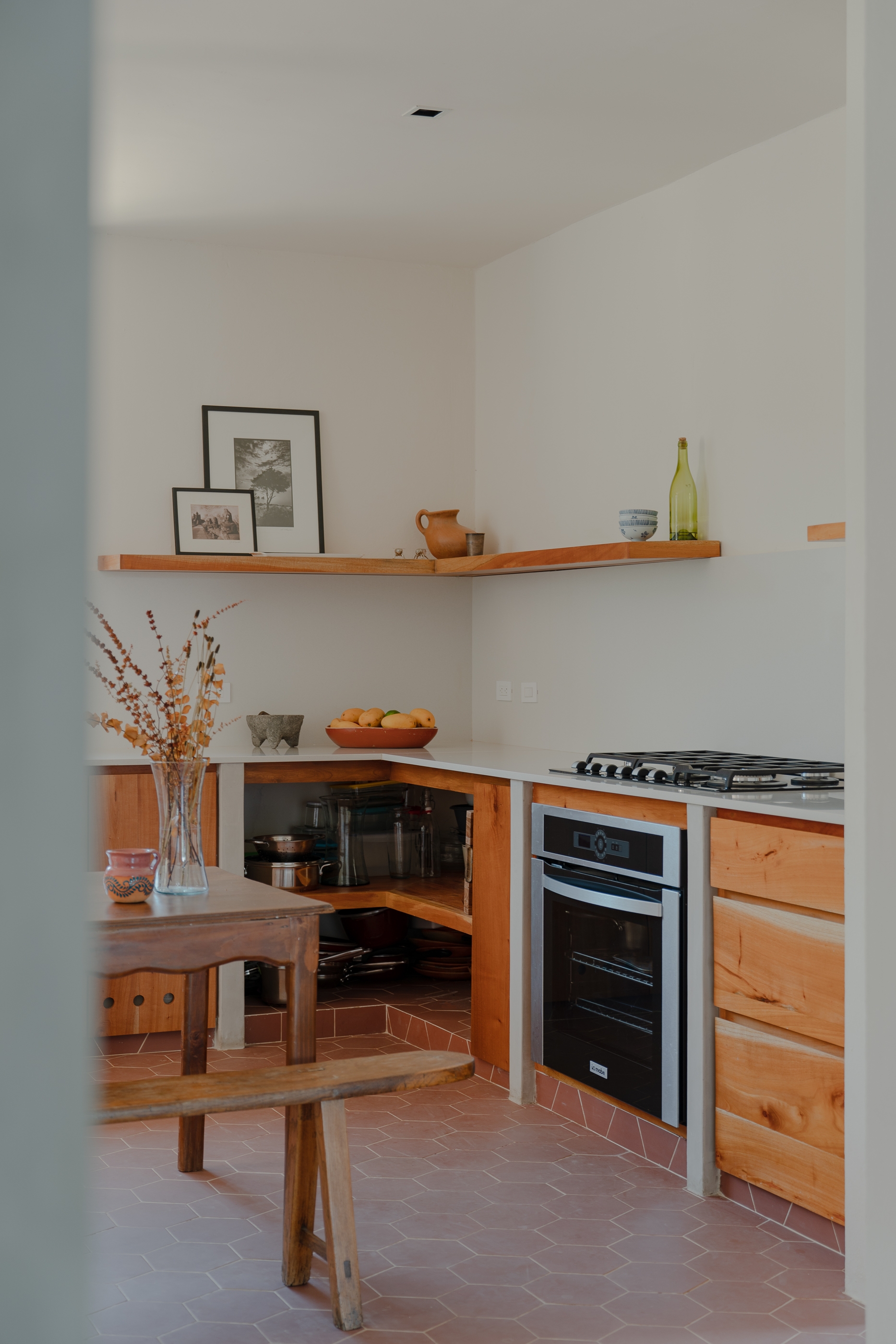 In the pursuit of sustainable design, La Posmoderna prioritized minimal intervention and eco-friendly materials. Exterior floors and studio walls were made with clay bricks, and the kitchen was clad with matching tiles of the same material. Most walls retained their original finish, with only minor changes in paint.