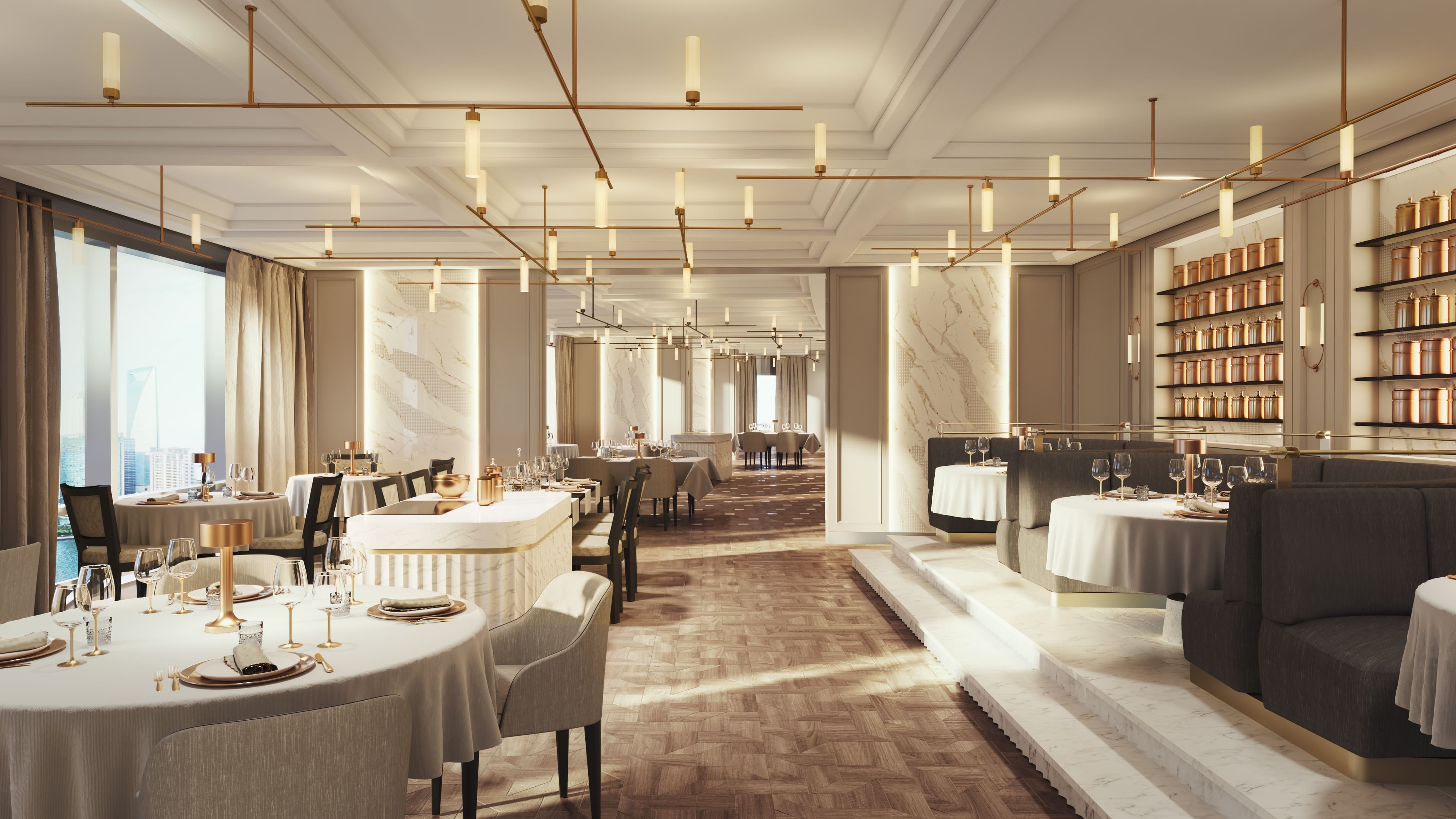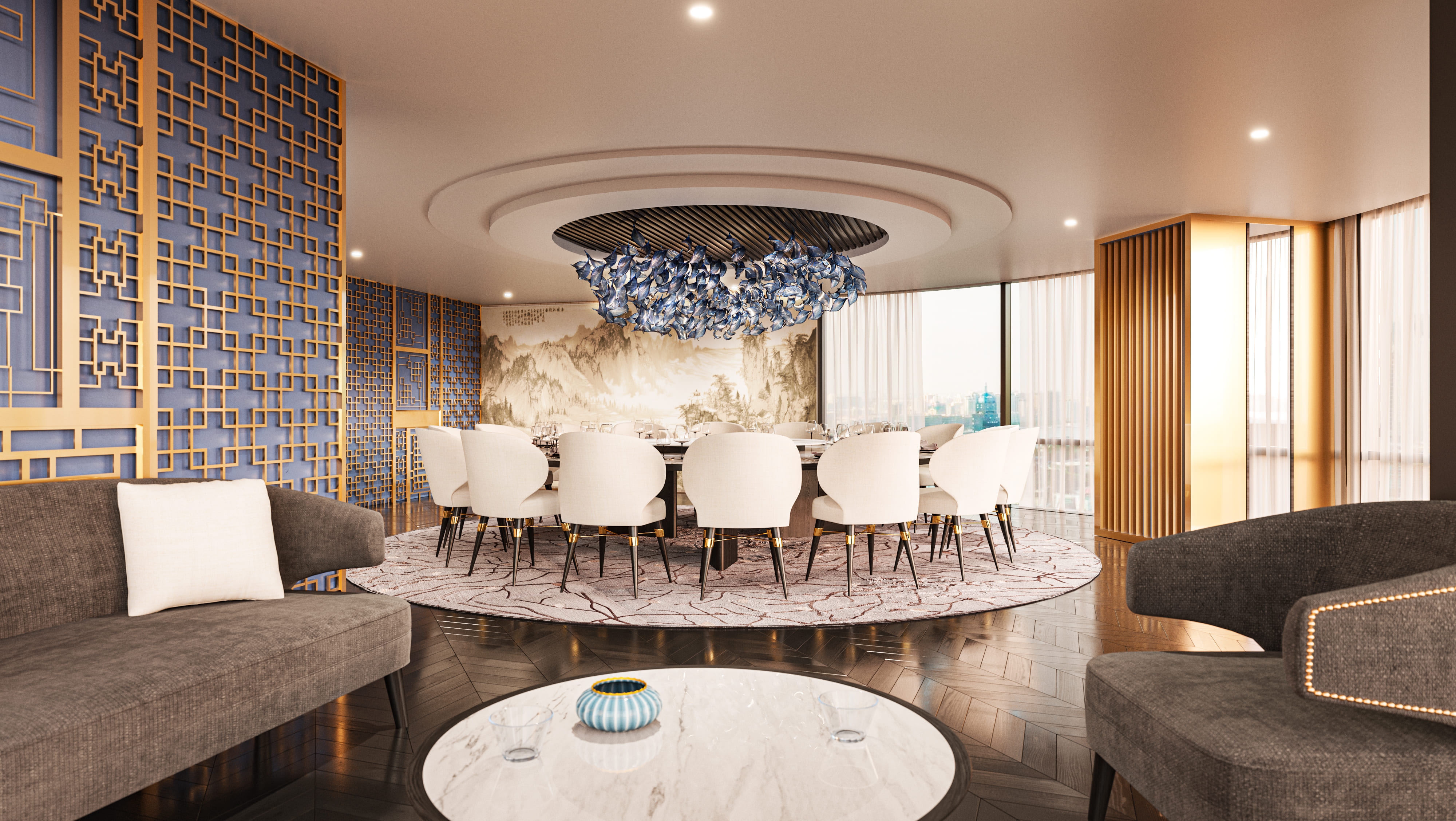 This project is inspired by Shanghai’s Haipai Culture, a symbol of diversity and inclusiveness. The interior renovation encompass the top-floor VUE BAR, VUE dining, VUE restaurant, all-day dining and conference room. VUE Bar, one of Shanghai’s most popular bars boasting a panoramic view of the Bund, is inspired by 'Milk Way'. It creates a vibrant connection between celestial and this mortal world. All-day dining, named 'Blossoming Vista', incorporates natural elements to create a fresh and pleasant dining space. VUE dining, embodying 'The Great Estuary,' seamlessly merges Eastern and Western culture into a lavish Chinese dining experience. 'Celestial Hall', VUE restaurant, showcases a Western noble dining feast. Conference room, inspired by 'Glacial Ripple' of Huangpu River, offers a serene meeting space. The concept strives to each space with unique and memory point while creating an overall interior effect that is harmonious but identical, evolving these spaces into a luxurious international nexus.