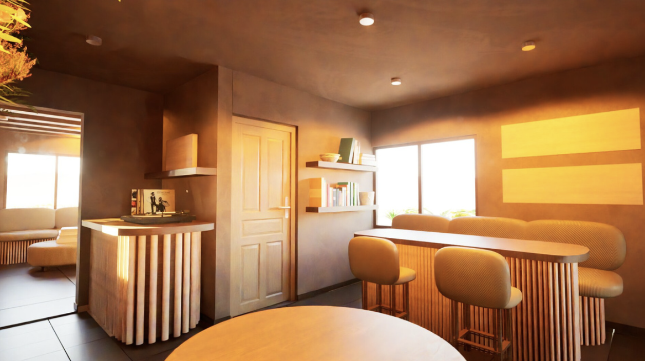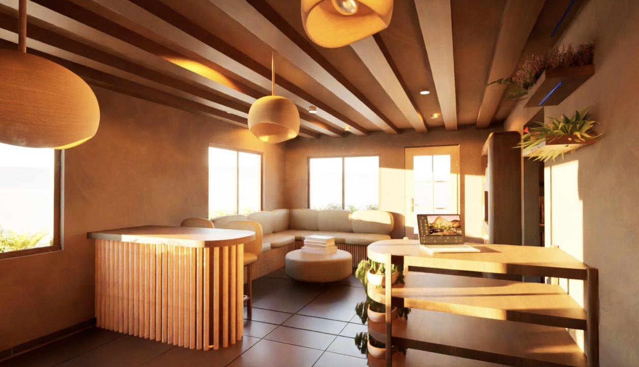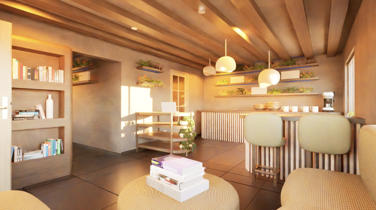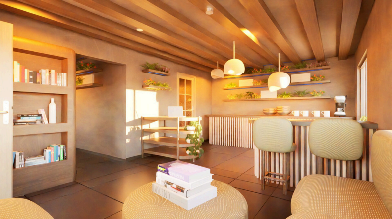 Imagine a sanctuary where you can reconnect with nature and escape daily stresses whileenjoying coffee, reading, chatting, or working. This renovation of an existing coffee shop inMonterrey, Mexico, addresses its previous shortcomings by enhancing lighting for a moreinviting atmosphere and optimizing space for greater utility. The design now harmoniouslyaligns with the brand's identity, balancing private and open areas to create a versatileenvironment for both solitude and community engagement. Drawing inspiration from theWabi-Sabi aesthetic, the new design introduces an innovative space where the mind feelsfree, open, and relieved from stress. Collaborating with a plant market, the shop offers a lush,green setting where plants are available to take home. Scientific studies show that plantsreduce sickness, stress, and anxiety while improving productivity, making this coffee shopideal for work or relaxation. With careful lighting, neutral colors, natural materials,comfortable seating, and abundant greenery, this renovation transforms the coffee shop intoa serene urban oasis.