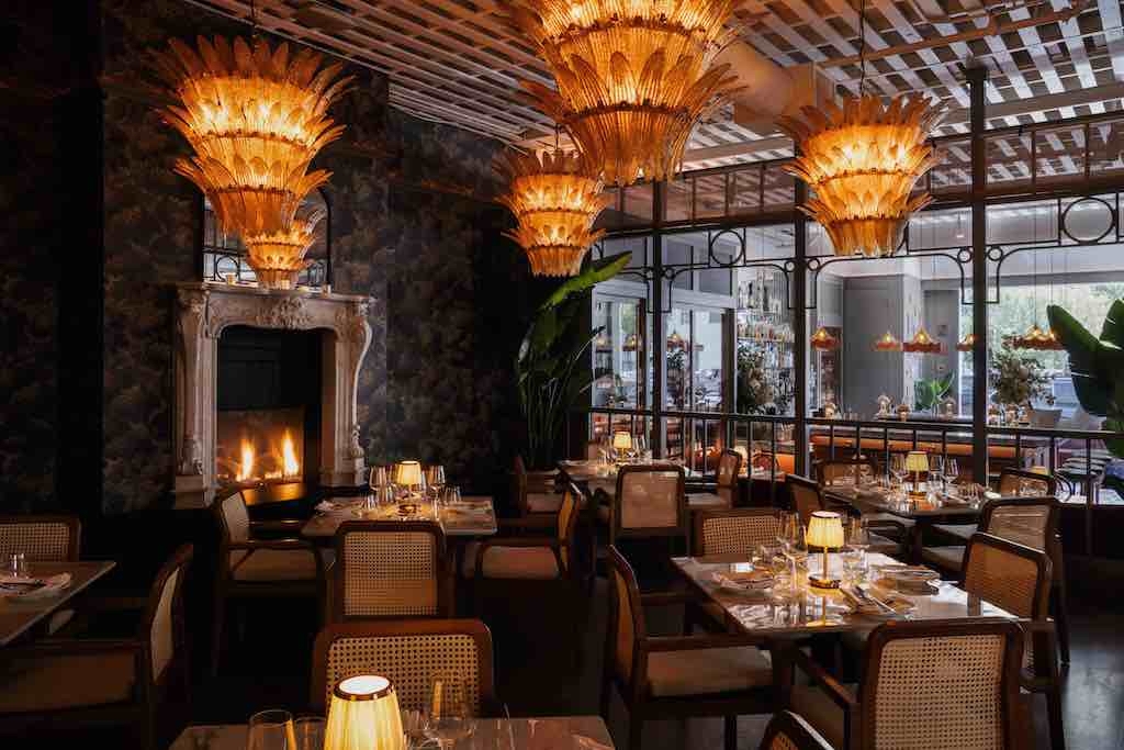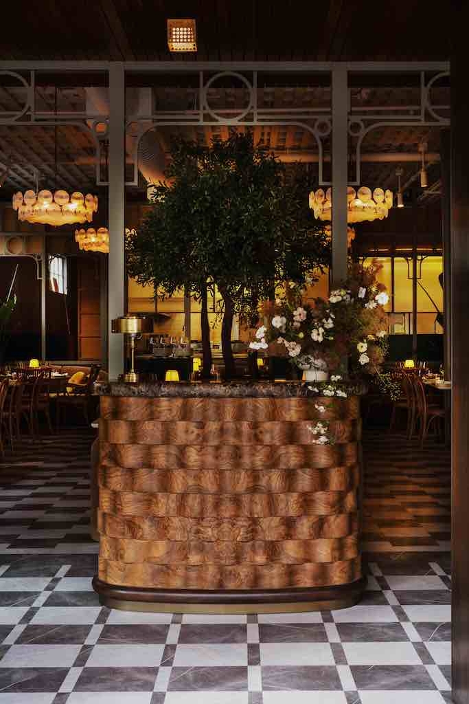 crown molding and V groove mirrored paneled cabinets, the design was softened through the incorporation of wavy lines, fringes and curves. Elements drawn from the famous San Sebastián born sculptor Eduardo Chillida bring modern clean lines and a subtle masculinity to the otherwise feminine-driven space. Low level accent lighting and lush plants provide warmth and verdant shelter, creating a natural landscape juxtaposed with the building’s concrete structural elements. Guests are greeted by an intimate bar leading into the main dining room reminiscent of a casual, yet lively bistro complete with velvet banquettes.