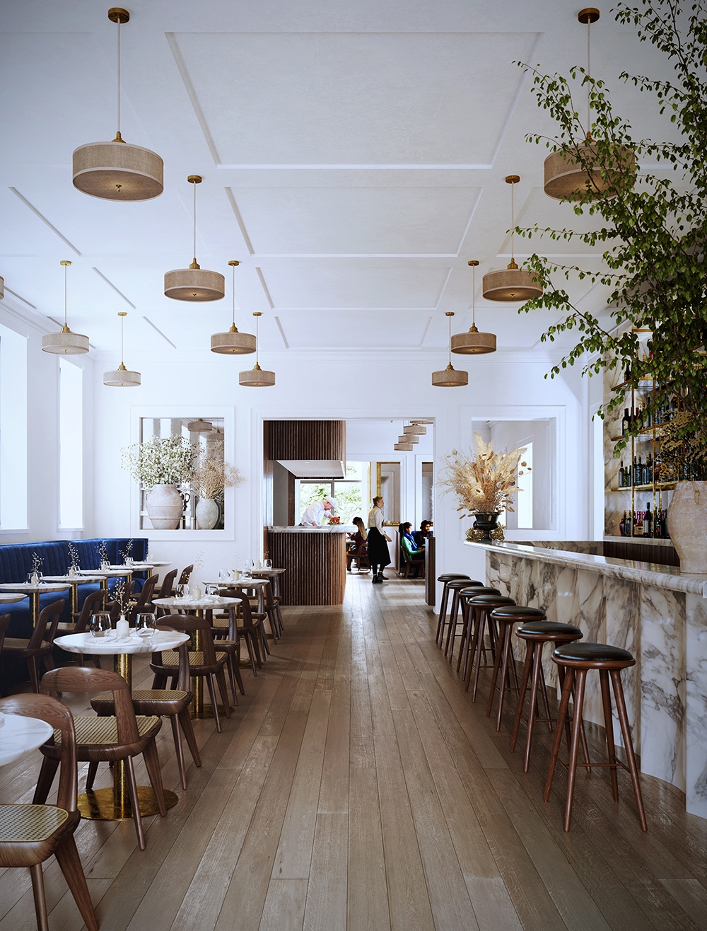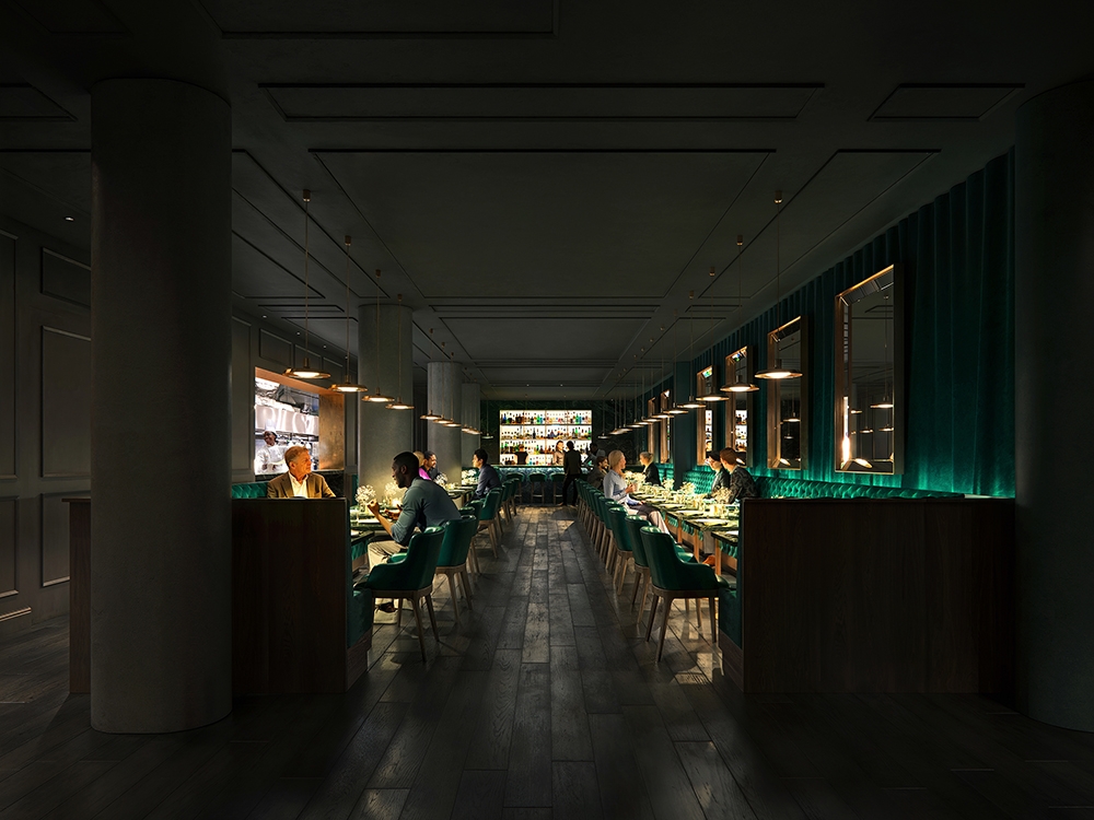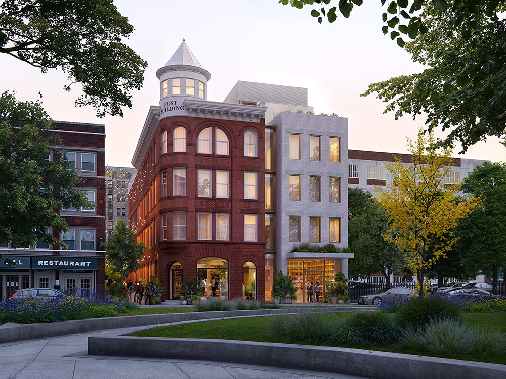 The Post Hotel rehabilitates a historic building in downtown Bridgeport, Connecticut, and marries it with a ground-up, modern addition to create a dynamic, 36-room boutique hotel. The design juxtaposes the classical, c. 1892, red brick edifice with the minimally embellished, light brick façade of the similarly scaled companion building. While there’s a dynamic tension between the buildings’ complementary styles, each retains its own presence and design integrity. A massive plate glass window under a landscaped canopy at the front of the new, five-story tower relate in scale with the tall, arched windows of the Post building. A glass gasket connects the two structures, marking the nexus of old and new and serving as the central artery of the hotel’s interior plan. Ground-floor retail and restaurants, a lower-level speakeasy, and a rooftop terrace/bar on the new tower will complete the 27,252-square-foot hospitality destination that will open in 2026.