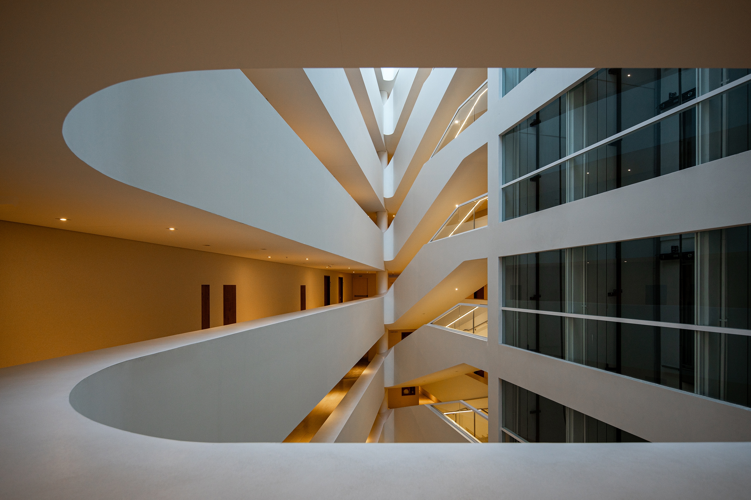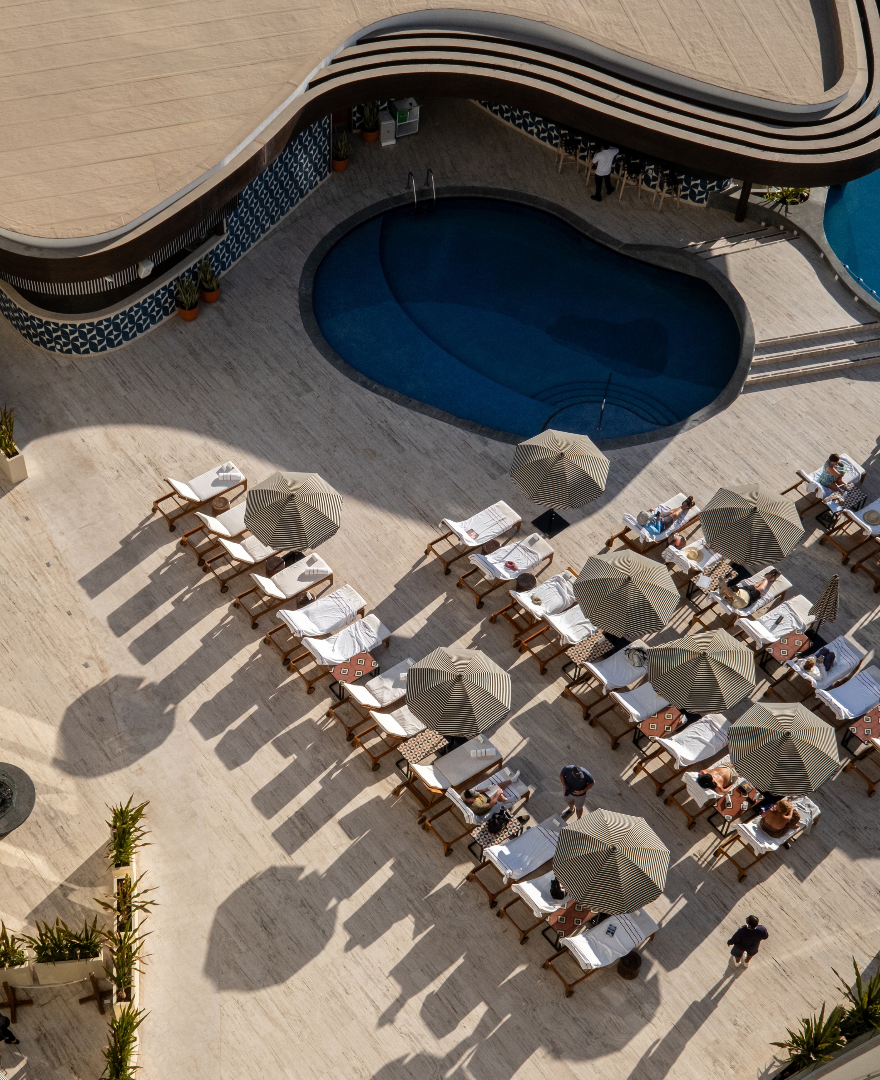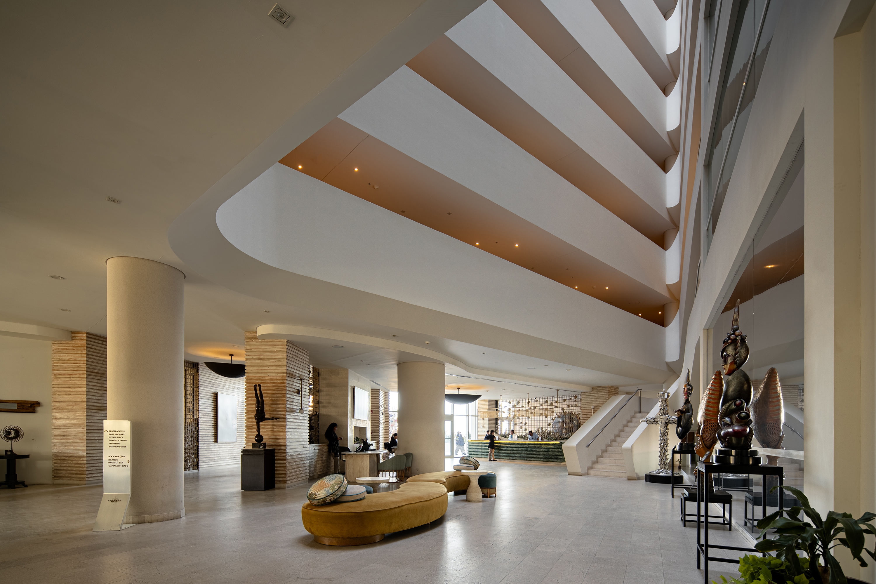 Its central atrium organizes internal circulation and efficiently connects public spaces, guest rooms, and amenities. On the ground floor, the lobby links the restaurant, pool bar, and terrace, extending toward the outdoor pool and providing direct access to the beach club.