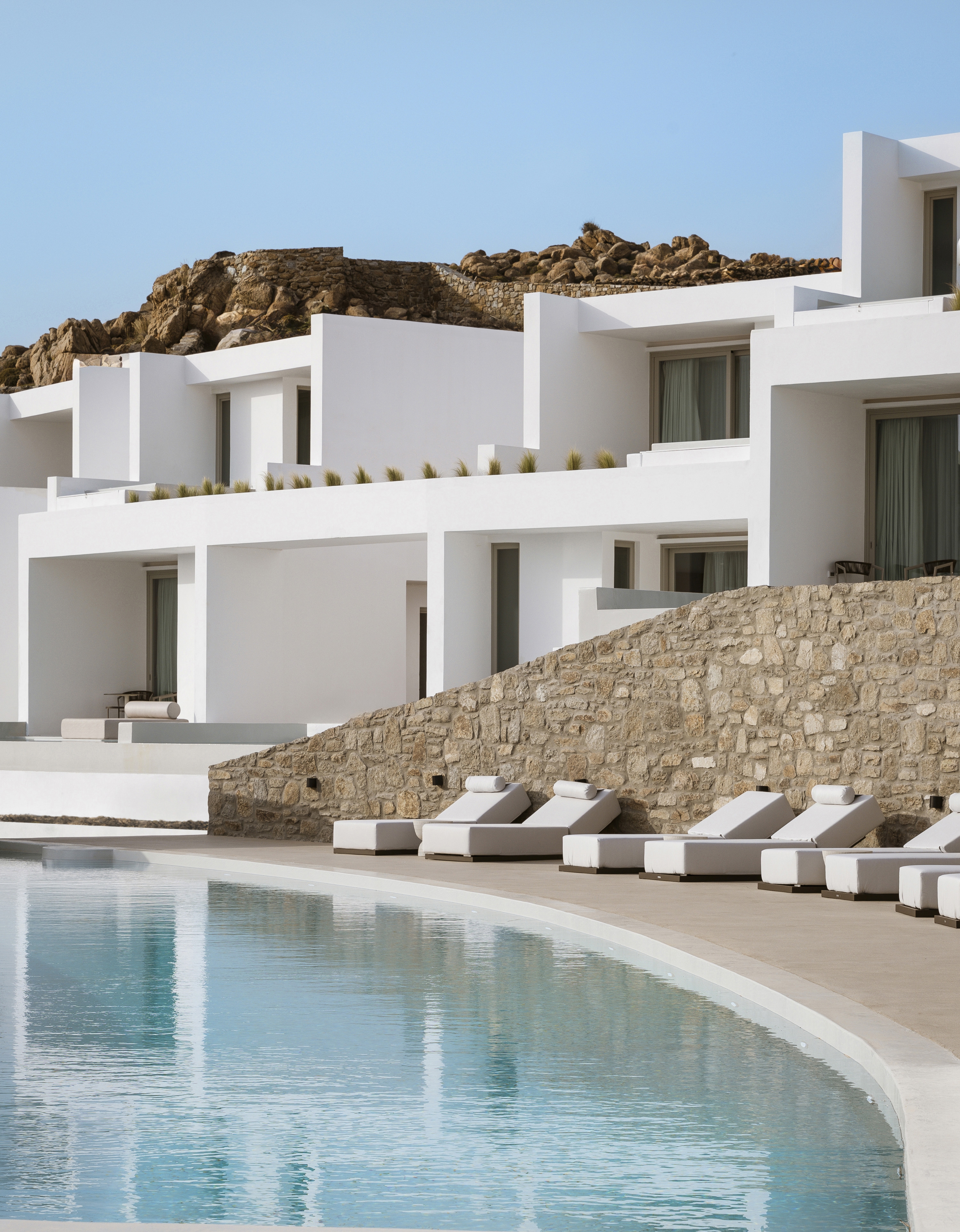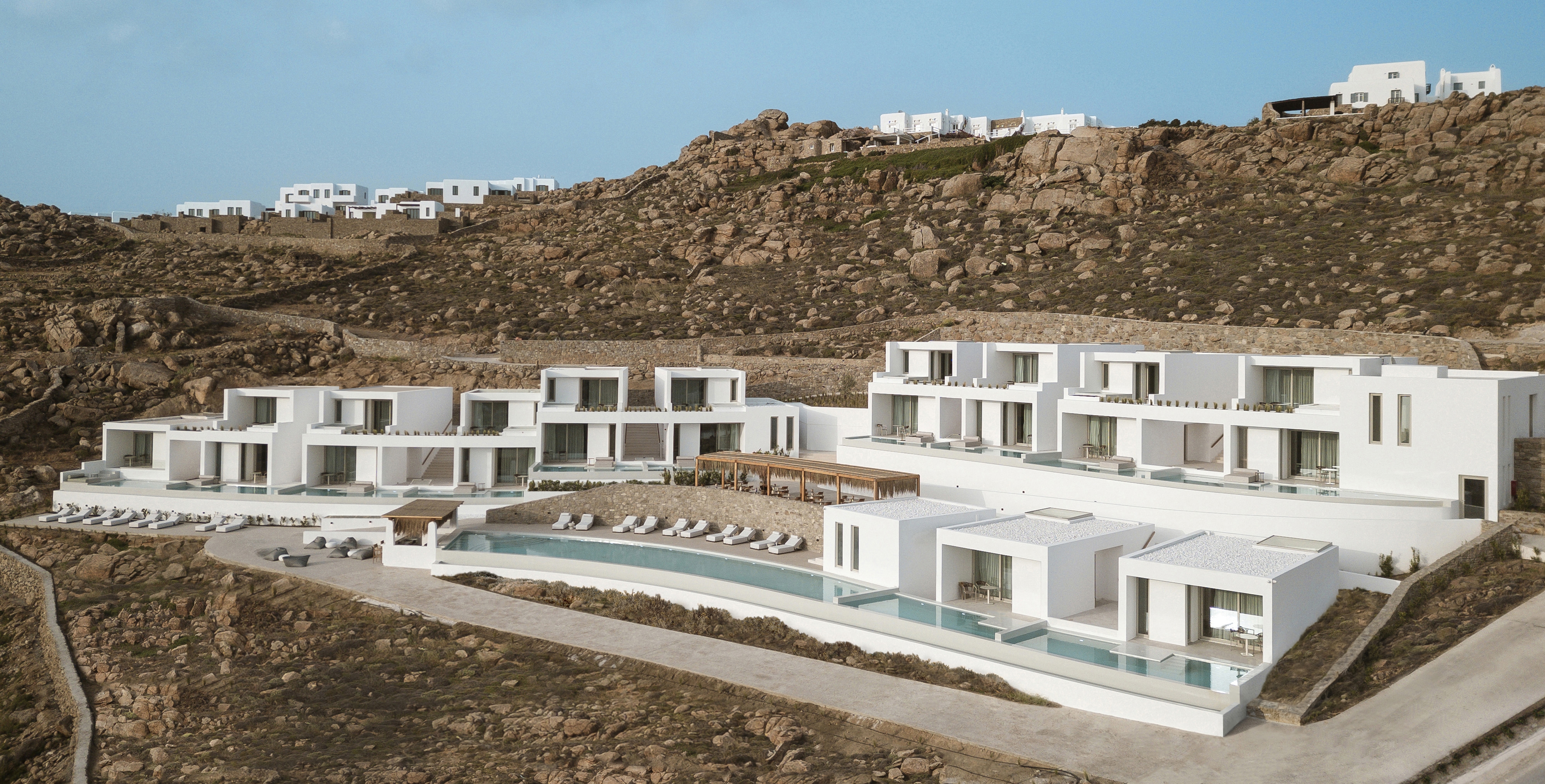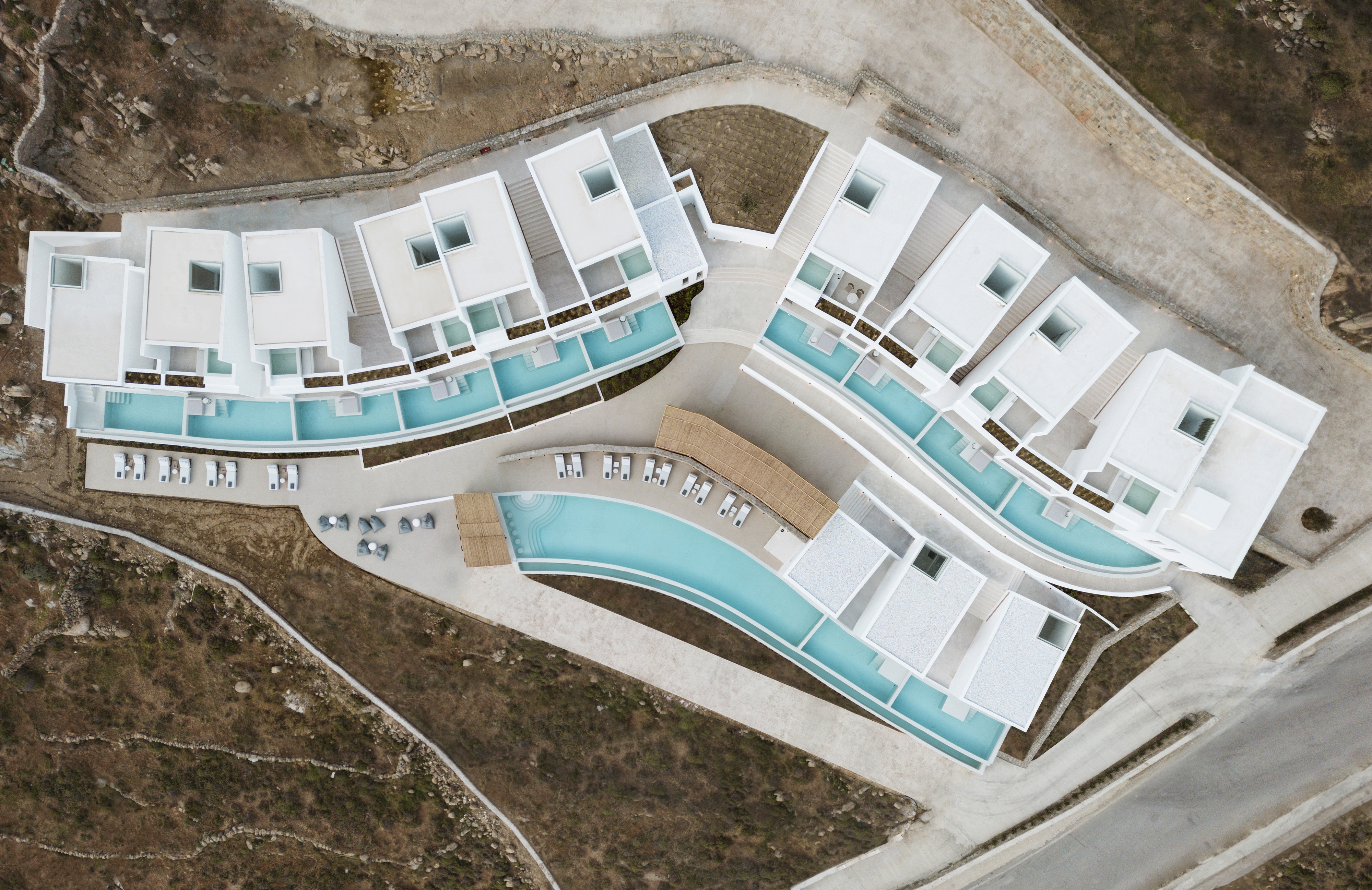 The flow project is a summer accommodation establishment complex in Mykonos, Greece, with amphitheatrical view to the Super Paradise beach. The 5* hotel comprises 21 suites, a lobby, a pool bar, a restaurant and a business center. The main intention of the design is to preserve and highlight the curved forms resulting from the intense terrain and their transcription into the hotel's structure. Prominent identifying element of the synthesis is the creation of longitudinal flow lines, translated into the basic form of the main volumes, as well as all the hotel's outdoor areas.